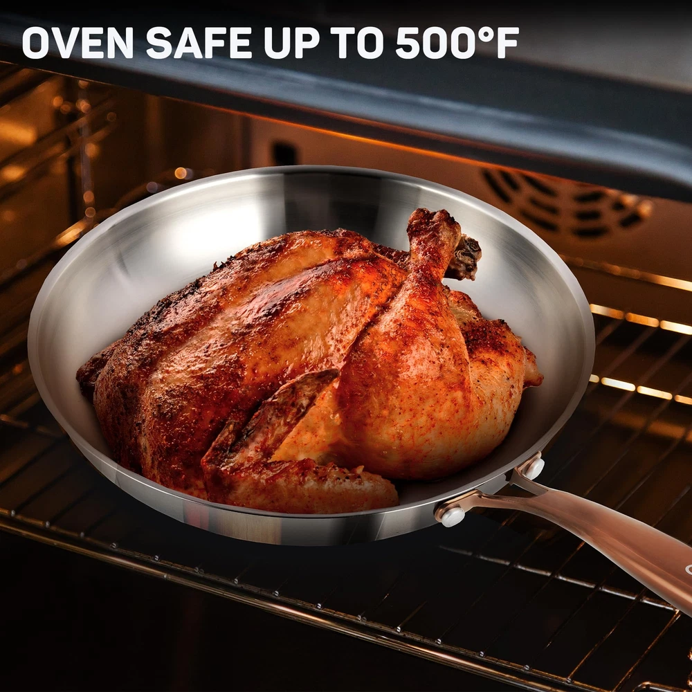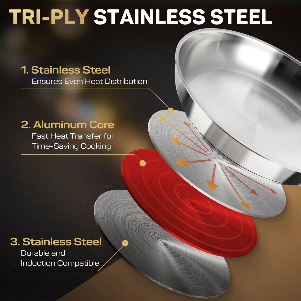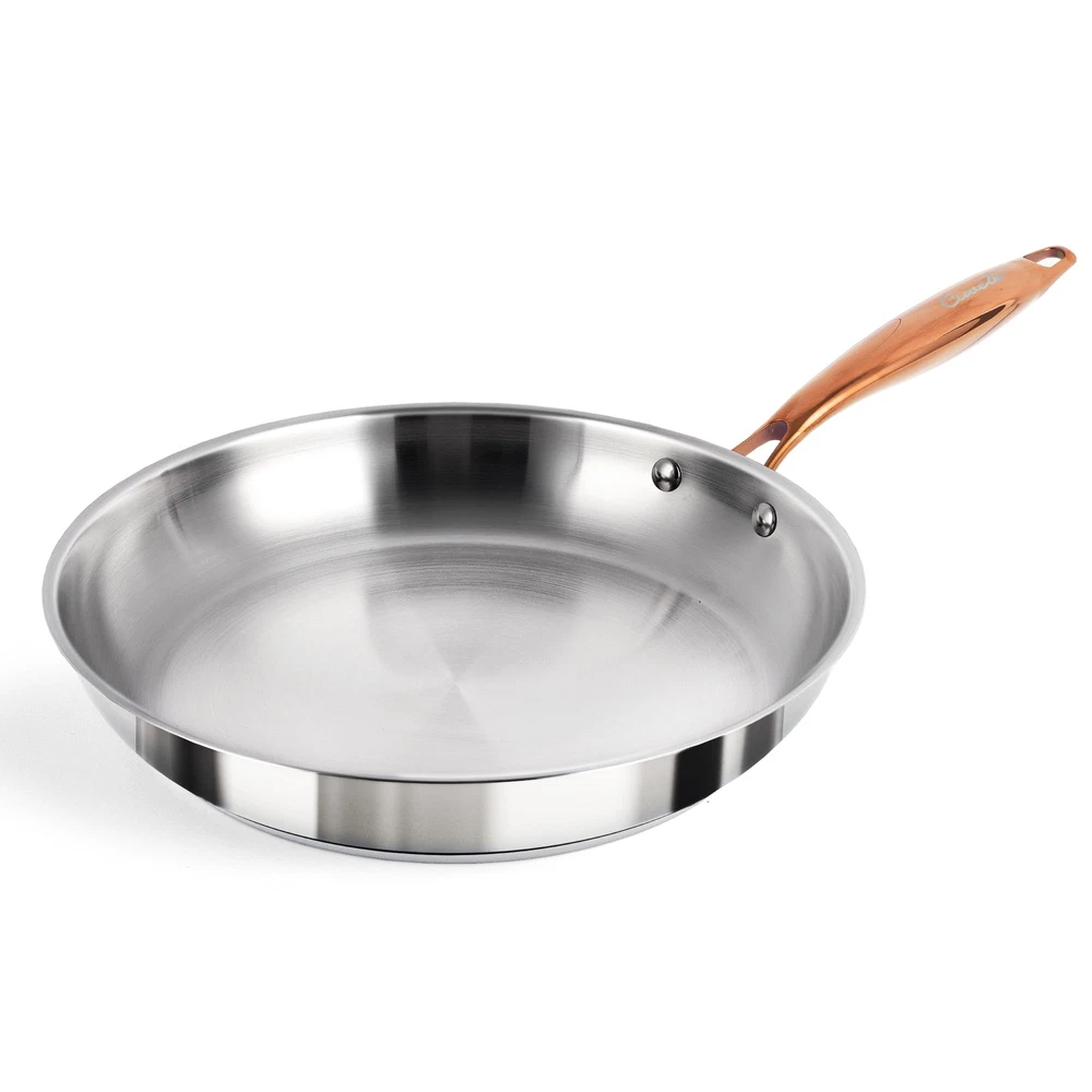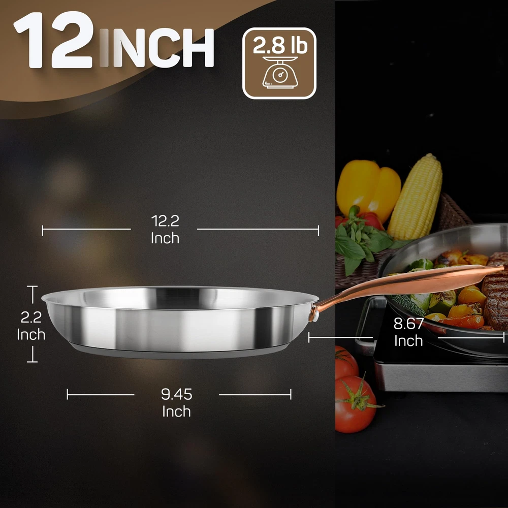 【High-Quality Tri-Ply Construction】The 12 inch frying pan with lid features a premium 18/10 stainless steel tri-ply base, providing superior durability and ensuring fast and even heat distribution. Its mirror-polished surface ensures easy cleaning and maintains a pristine appearance over time. 【Elegant and Functional Brass Handle】The ergonomic brass handle of stainless steel frying pan offers a comfortable and secure grip. It stays cool to the touch, providing excellent balance and control while cooking. The brass material adds a touch of elegance and sophistication to any kitchen 【Versatile and Compatible with All Cooktops】Compatible with all types of stovetops, including induction, gas, electric, and halogen, this stainless steel frying pan with copper handle offers maximum versatility. It is also oven safe at high temperatures up to 500°F and dishwasher safe, catering to a wide range of cooking needs 【Sealed Glass Lid for Moisture-Rich Cooking】The glass lid of frying pan 10 inch ensures moisture retention, preserving nutrients for flavorful dishes. Monitor your cooking process effortlessly while locking in essential moisture for delicious results 【Safe and Non-Toxic Materials】Made from PFOA, PTFE, and PFOS-free materials, frying pan with lid prioritizes health and safety. The high-quality stainless steel ensures that food remains uncontaminated and retains its natural flavors, allowing for the preparation of delicious and healthy meals 【Exceptional After-Sales Service】As a part of the brand commitment, we provide exceptional after-sales service to ensure your satisfaction with our product. We are dedicated to addressing any concerns or inquiries promptly and efficiently, ensuring a seamless and enjoyable cooking experience