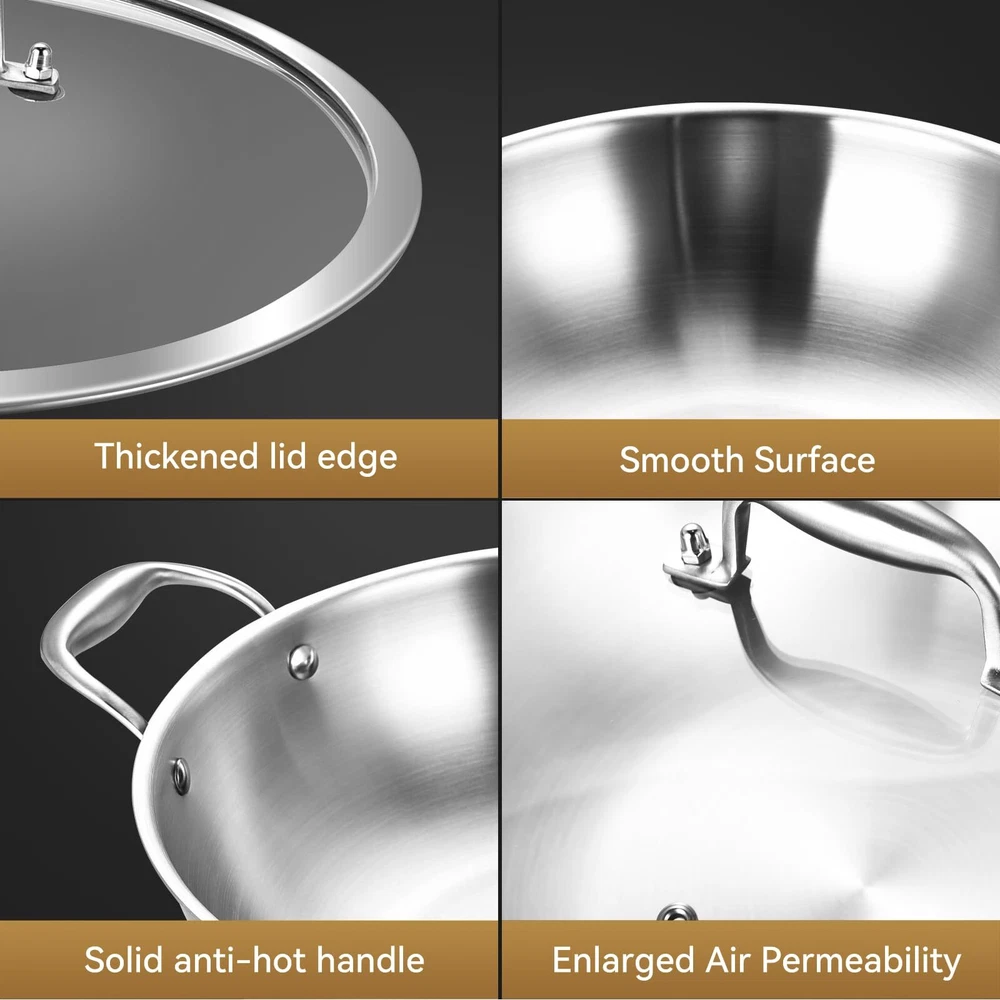 12INCH Tri-Ply Stainless Steel 5 QT Wok Pan with Lid, Induction pan,suate pan,deep frying pan,dishwasher and Oven Safe Tri-Ply Clad:Made with a responsive aluminum core bonded together with 2 layers of durable, stainless steel all the way around for maximum durability and fast, even heat distribution. Food Stainless Steel:Highly polished food stainless-steel cooking surface with starburst finish offers superior stick resistance and easy maintenance, plus won’t react with food. Cool Touch Double Handles: Secured with double side stainless-steel handles to ensure a safe grip and balance while providing cool touch handles. Suitable for All Stoves:Works on all cook stovetops, include induction. The high quality stainless steels and the aluminum core make it dishwasher-safe and oven-safe up to 500°F. Your Reliable Partner:All the Cookware from in PFOA-Free,SGS Certified. Each pan and pot from heats quickly and spreads heat evenly because of our High-Control level of materials.
