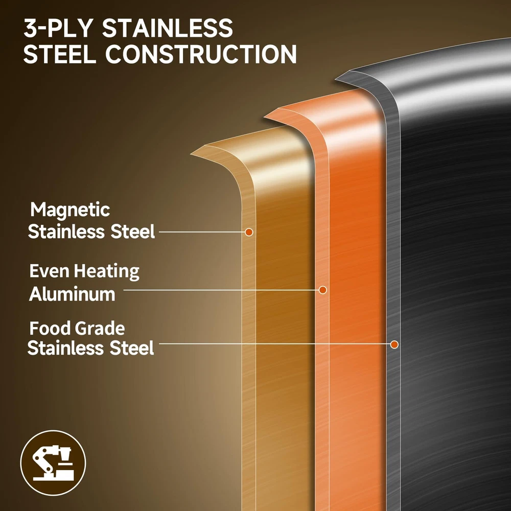 12INCH Tri-Ply Stainless Steel 5 QT Wok Pan with Lid, Induction pan,suate pan,deep frying pan,dishwasher and Oven Safe Tri-Ply Clad:Made with a responsive aluminum core bonded together with 2 layers of durable, stainless steel all the way around for maximum durability and fast, even heat distribution. Food Stainless Steel:Highly polished food stainless-steel cooking surface with starburst finish offers superior stick resistance and easy maintenance, plus won’t react with food. Cool Touch Double Handles: Secured with double side stainless-steel handles to ensure a safe grip and balance while providing cool touch handles. Suitable for All Stoves:Works on all cook stovetops, include induction. The high quality stainless steels and the aluminum core make it dishwasher-safe and oven-safe up to 500°F. Your Reliable Partner:All the Cookware from in PFOA-Free,SGS Certified. Each pan and pot from heats quickly and spreads heat evenly because of our High-Control level of materials.