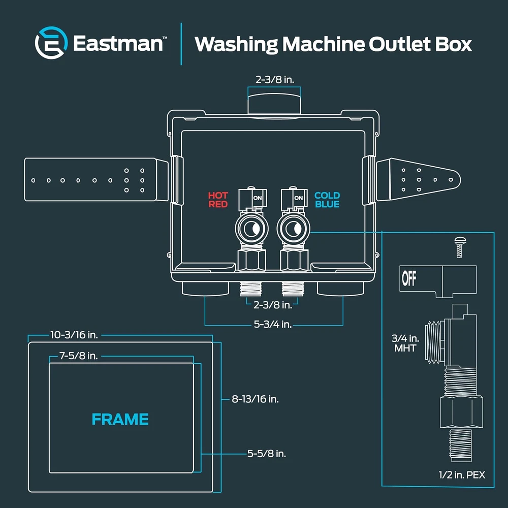 1/2 Inches Crimp PEX Connection X 3/4 Inches MHT Washing Machine Outlet Box New Eastman 1/2 Inch Crimp PEX Connection x 3/4 Inch MHT Washing Machine Outlet Box, Push to Connect Brass Plumbing Fittings, Double Drain, 60245 Product Description: The Eastman 1/2 Inch Crimp PEX Connection x 3/4 Inch MHT Washing Machine Outlet Box is a reliable and durable solution for organizing and securing washing machine water supply lines. Designed with push-to-connect brass fittings for easy installation, this outlet box features a double drain system for efficient water management. Its sturdy construction and compact design make it ideal for residential laundry spaces, providing a clean and professional look. Features: Easy Installation – Equipped with push-to-connect brass fittings, allowing for quick and hassle-free installation without the need for special tools. 1/2 Inch Crimp PEX Connection – Compatible with PEX plumbing systems, ensuring a secure and watertight connection for reliable performance. 3/4 Inch MHT Outlet – Standard male hose thread outlet accommodates washing machine hoses for a perfect fit. Double Drain System – Features dual drain openings to effectively manage water discharge, reducing the risk of leaks and overflow. Durable Construction – Made from high-quality materials, designed to withstand high water pressure and long-term use. Compact & Space-Saving Design – Fits neatly into laundry areas, providing an organized and professional installation appearance. Versatile Application – Suitable for both residential and commercial laundry setups, offering a dependable water supply connection. Style Crimp PEX (1807) Connection Pattern Outlet Box Warranty Description N/a. Batteries Included? No Batteries Required? No Finish Painted Product Dimensions 4"D x 9"W x 10.25"H Material Plastic Installation Type Screw-In Item Package Quantity 1 Item Weight 1 pounds Part Number 979757 Color White Finish Type Painted Voltage 1 Volts Included Components outlet box Size 1/2 in. PEX Connection Shipping Fast shipping is very important for us. Our standard USA shipping service is FREE. Your order will be shipped within 1-2 business days upon full payment received. Your order will be delivered within 1-3 business days after the handling time. We only ship to the confirmed address. We reserve the right to cancel any order for any reason at any time. We are not responsible for undeliverable addresses. Returns and payment We offer a 30 days return policy from checkout winning date. FeedBack Your feedback very important to us, after you get your package and you are satisfied with our service please leave us positive feedback If you have any problem with your order / any questions please before leave any type of feedback For any questions, using eBay contact system Please visit our eBay store to check out other items for sale! Thank you for shopping at our store.