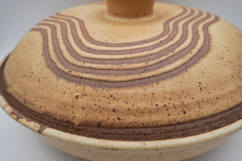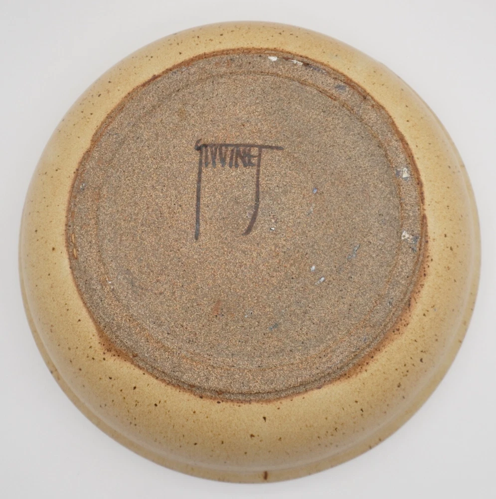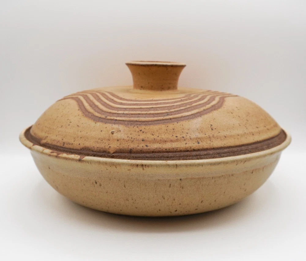 This is a stunning casserole dish made by the famous contemporary potter John Givvines of North Carolina. John was in the art department at Meredith College as well as worked in his studio, Sphericles of Rare Device. He is best known for his modern sgraffito line work as demonstrated in this dish. This piece is a base and lid. Measures 12" in diameter and 6.25" high with lid, 2.75" to the rim. It weighs approximately 6 lbs. Very heavy but a beautiful dish for serving or as a decorative piece in your home. Unsure of heat tolerance for the oven. Excellent condition with no chips, cracks, or other issues. Really remarkable work. Local pickup available or ships USPS Priority. Please let me know any questions. If at all unhappy with your purchase, please contact me before leaving feedback so that I may have the opportunity to try and make it right. I want you to be happy with your purchase!