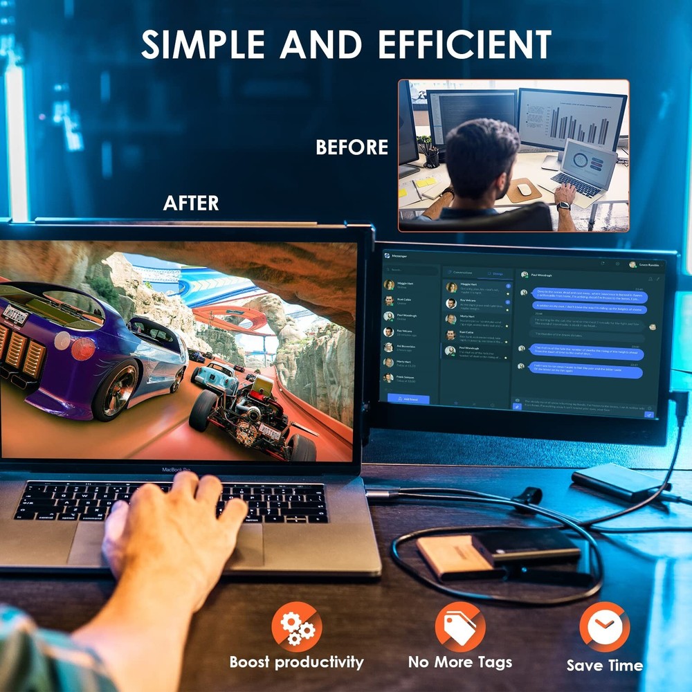 TAKE IT TO ANYWHERE YOU WANT As an extra laptop screen extender , it adheres to the concept of "simple" and "portable" and aims to create a more efficient world for people's work and life. When traveling, it’s easy to take apart, pack up and store in a backpack or laptop bag. Its lightweight, small and has made your work life so much easier. PRODUCT SPECIFICATION Compatible Laptop Sizes 13-16.5'' (Diagonal Size) Applicable Systems Windows/Android/Chrome/Linux/MAC Display Resolution 1920 x 1080 pixels Screen Aspect Ratio 16 : 9 Refresh Rate 60 Hz Technology LCD IPS HDR Cables TPYE-C *2, HDMI*1, USB2.0*1