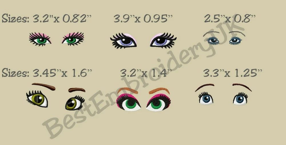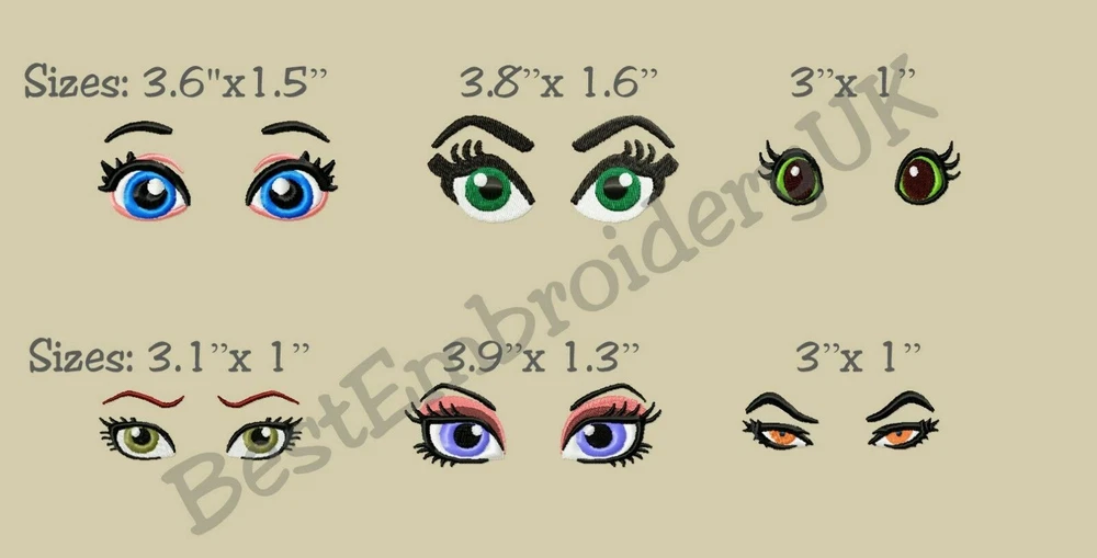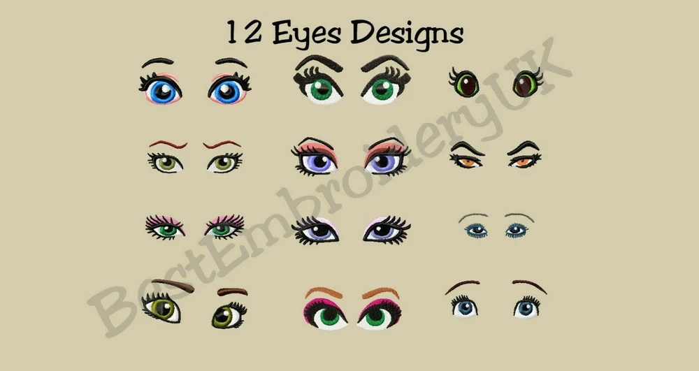 12 MACHINE EMBROIDERY DESIGNS - EMBROIDERY EYES - WOMAN'S EYES - EYELASHES This is not Iron on, Patch or Applique Design. This is embroidery design file. You need a machine embroidery and know how to transfer the embroidery design to the machine and to the fabric. Please double check all items and all images provided in this description because refund is not possible. Please provide me your email address and I will send zip file with multiple formats on your email or confirm which format of the designs you need The package includes: 12 Embroidery designs as you can see on a pictures If you have any questions please contact me If you need it in different size or format please let us know. Format available: DST, EXP, HUS, JEF, PES, PEC, NEW, VIP, VP3, 10O, XXX. Please let us know if you need other format. Important: Re-sizing or editing of the designs is not recommended as we can't guarantee the quality of the designs if you do it, but if you need any help with the designs please contact us. You may NOT, under ANY circumstances share, copy, trade, exchange, or resell this design in part or whole in ANY format. Reselling this digital designs is against the law. WE DON'T Refund Digital Design. For more details read our Privacy Policy. THANK YOU FOR VISITING OUR SHOP