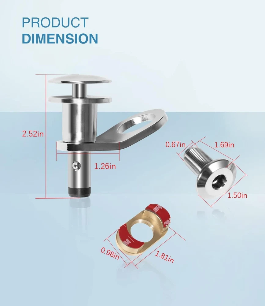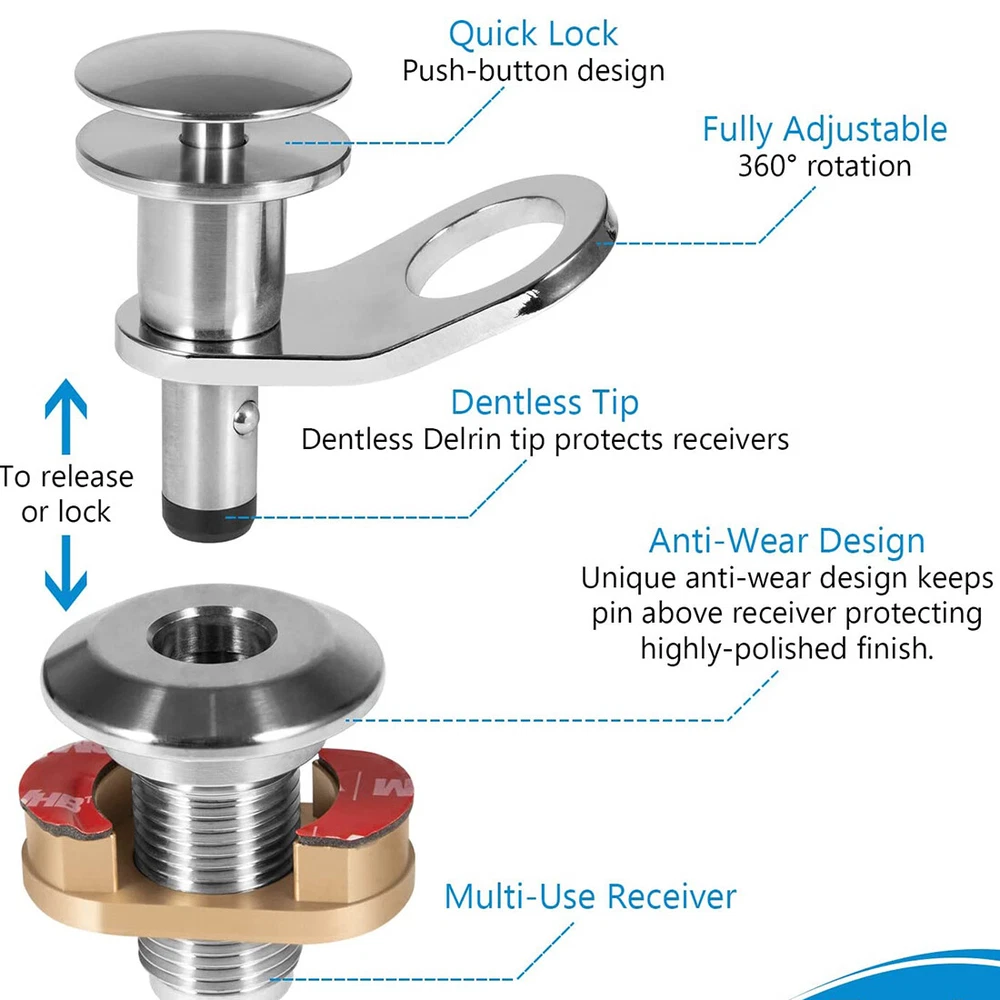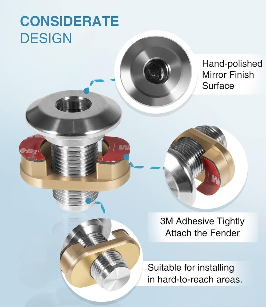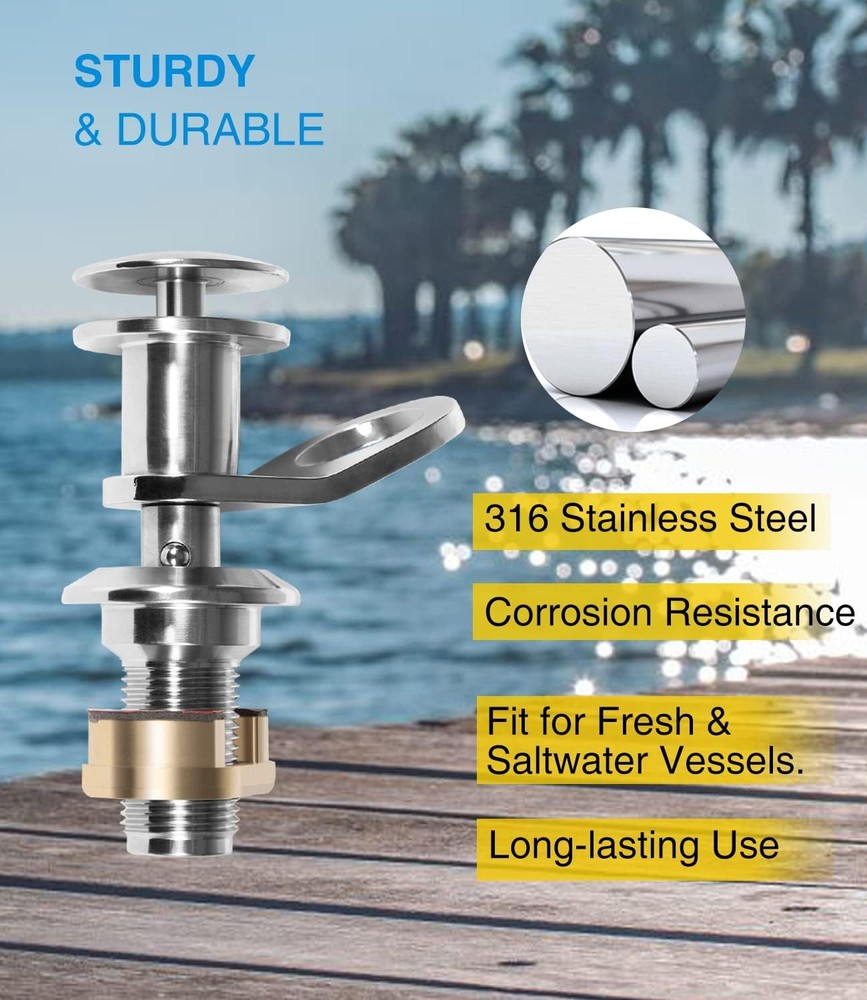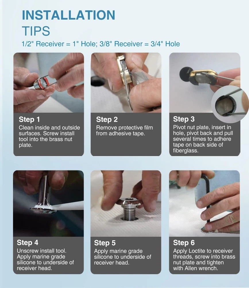 1/2'' Marine Stainless Steel Quick Release Boat Fender Holder Kit Mount Brackets 【One-hand Operation】 One quick-release button of the cleat allows you to quickly and effortlessly dock and undock with single hand. Simply click the button, drop the pin into the receiver and you’re ready to go. The cleat would attach the fender tightly to your boat. No worry about knot tying and excess rope again. Indispensable accessory on your boat. 【Sturdy & Durable】 The heavy-duty fender holder kit is made of high quality 316 stainless steel material to ensure the corrosion resistance and long lasting use. A great choice for both fresh and saltwater vessels. 【Anti-scratch Design】 Hand-polished and soft-edged top, tip, tab and receiver. Protects your rope and the fender mount kit from wear and scratch. A Fantastic addition to your boat. 【Warm Tips】 1) Hole diameter: ⌀ 1/2" Receiver = ⌀ 1" Hole; ⌀ 3/8" Receiver = ⌀ 3/4" Hole; 2) It's recommended for use on fiberglass hulls. 3) For your better installation experience, other tools are recommended for the installation process. Please kindly check the recommended installation tool and process in the product detail page. 【Package included】 Qty-1 1/2'' Boat Fender Holder Qty-1 1/2'' Boat Fender Receiver Kit Perfect Design One quick-release button of the cleat allows you to quickly and effortlessly dock and undock with single hand. 1/2'' Boat Fender Holder is easy to use. Simply click the button, drop the pin into the receiver and you’re ready to go. The cleat would attach the fender tightly to your boat. No worry about knot tying and excess rope again. Indispensable accessory on your boat. What You Get Qty-1 1/2'' Boat Fender Holder Qty-1 1/2'' Boat Fender Receiver Kit Product Specification Material: 316 Stainless Steel Special Feature: One quick-release button for easy dock and undock with single hand Installation Tips: Before installing the receiver, please using the Locator Disk and mark dead center of the receiver with a pencil. Be sure to check that there are no structural members, cables, etc. behind the drilled holes. Always finish drilling from the outside. This will minimize the risk of damaging the gelcoat. Hole diameter: ⌀ 1/2" Receiver = ⌀ 1" Hole; ⌀ 3/8" Receiver = ⌀ 3/4" Hole Installing the Receiver Clean inside and outside surfaces. Screw install tool into the brass nut plate. Remove protective film from adhesive tape. Pivot nut plate, insert in hole, pivot back and pull several times to adhere tape on back side of fiberglass. Unscrew install tool. Apply marine grade silicone to underside of receiver head. Apply Loctite to receiver threads, screw into brass nut plate and tighten with Allen wrench. Brand Unbranded Manufacturer Part Number QP-1504+1505 Type 1/2'' Boat Fender Holder Receiver Kit Warranty 1 Year Material Stainless Steel Size 1/2-Inch