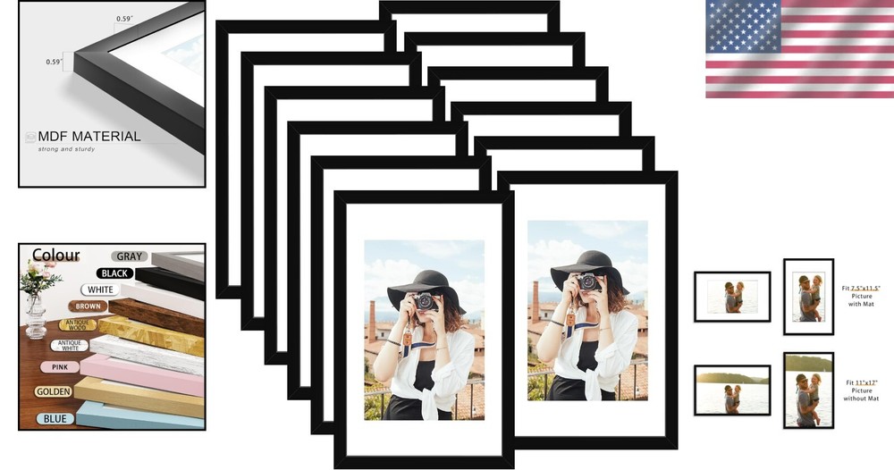 Material: MDF Back Material Type: Medium Density Fiberboard Unit Count: 12 Count Shape: Rectangle Item Weight: 13.71 lb gtin13: Does not apply Item Length: Picture Frame Set Finish Types: Matte Mounting: Wall Mounted Target Audience: Unisex Adult Mounting Type: Wall Mount Brand: Unbranded Type: Frame Set Finish: Matte Power Source: No Size: 11 x 17 in Photo Insertion Type: Rear-Loading Theme: Popular_characters Frame Type: Flat Special Feature: Matted Frame Material: Engineered Wood Orientation: Portrait Finish Type: Matte Box Frame Depth: 0.5 in Item Height (Interior): Picture Frame Set Number Of Items: 12 Style: Modern Item Width: Picture Frame Set Occasion: Mother's Day Item Width (Interior): Picture Frame Set Suitable for Photo Size: 8 x 12 in Color: Black Personalize: No Features: Distressed, Handmade, Durable, Eco-Friendly Material, Moisture Protection, Scratch Protection, Dust Protection, Easy to Install, Turn Buttons for Easy Opening, Gallery Style Wall Mounting UPC: Does not apply Batteries Required: No Product Dimensions: 11.1"l X 17.1"w Item Height: Picture Frame Set Photo Capacity: 12