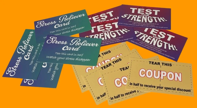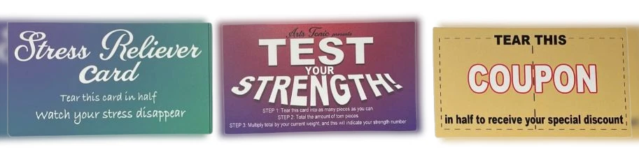 NEW 12 No Tear Cards ! One pack of 12! Hand these cards over to your friends, or leave them out for unwitting victims to find - and watch them get exasperated as they try to tear them in half! These nifty novelty cards are made up of un-tearable material - impossible to tear with bare hands! Each package contains 12 cards - 4 each of the "Free Coupon," "Stress Reliever," and "Test Your Strength." Printed in the USA. KEEP ONE IN YOUR WALLET! Sale is for 12 cards! WOW FREE SHIPPING! BEST PRICE ON EBAY or anywhere else! Robb. Sale - Clear drawer - F -1 Take advantage of this great price! Check out our other items including the Geist Visual Comedian DVD! 74 minutes of pure fun and other great comedy/magic props!