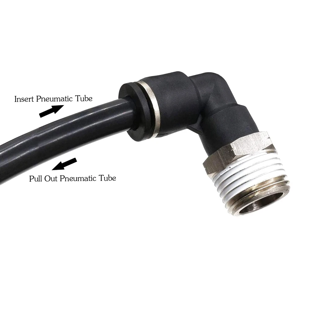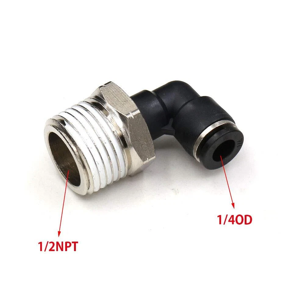 Type:1/4 Od x 1/2" Npt Thread Push to Connect Fittings; Body Style: male 90°Degree Elbow ;Made of quality plastic and stainless steel; corrosion resistance, ductility 1/4 Od Air Fittings Fluid Admitted: Air, Water (No Freezing); Applicable: Pipe PU/ PA/ PE/ PVC; Working Temperature: 0-60°C | 32~140°F;Working Pressure:0-1.0mpa | 0-150psi; Proof Pressure:3.0Mpa | 435psi; Negative Pressure:-100Kpa | -29.5 In Hg The 1/2 Airline Push fittings are available in various styles and models ,All models of push in connectors are designed to suit your pneumatic piping needs perfectly Easy to install to 1/4 OD tubing and removed, even can change the tube connector direction after installation easily,360-degree rotate freely The release ring of Pneumatic Air Tube 1/4 od Fittings conforms with the ellipse design to ensure that the disconnecting unit is in good shape;offering good seal property