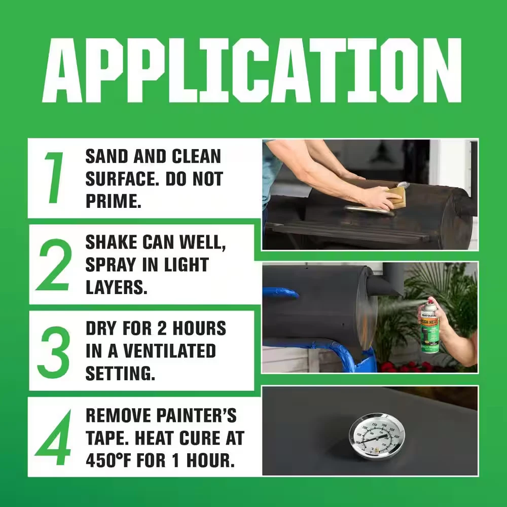 Fast Shipping On All Items 30 Days Money Guarantee Customer Support Excellent Service 100% Satisfaction Satisfaction Guaranteed 12 Ounce High Heat Flat Bar-B-Que Black Interior/Exterior Spray Paint Specification Application Rubberized Coatings & Dips Application Method Aerosol Base Material Oil Based Coating Product Category Paint Color Family Black Color/Finish Black Coverage Area (sq ft) 15 Dry to Touch (min) 20.0 min Interior/Exterior Exterior,Interior Number per Package 1 Paint & Primer in One No Paint Key Features High Heat,Rust Preventative Paint Product Form Aerosol Spray Paint/Stain Clean Up Mineral Spirits Returnable 90-Day Sheen Flat/Matte Surface Material Use Metal Transparency Solid Manufacturer Warranty Satisfaction guaranteed for full refund of purchase price Container Size 12 Ounce . Weight: 12.0 oz Item Description High heat spray paint resists temperatures up to 1200°F Tough protective enamel offers excellent color retention Covers up to 8 sq. ft. per can for indoor or outdoor use The Rust-Oleum Specialty 12 oz. High Heat Aerosol Paint works well on grills, wood-burning stoves, engines and other metal items. It comes in a variety of colors and is great for use in temperatures up to 1,200 degrees fahrenheit. The paint is rust and corrosion resistant for durability. About us We offer the best prices around on high quality products. Our E-store includes media such as books, movies, music and games while offering electronics, toys, sporting apparel, clothing, tools, general home, garden items and more. Shipping We are always working hard to ensure your package arrives as soon as possible. Please understand that some factors like weather, high postal traffic, and the performance of shipping companies are outside of our control. We offer free shipping to the lower 48 states and ship within 2-3 business days of payment, usually sooner. We do not accept P.O. Boxes. Please provide a physical address. For shipping outside of the continental USA, we only use eBay's Global Shipping Program.The item is shipped to KY and then sent to the rest of the world. International customers are responsible for all duties and taxes. Continue to check out to calculate costs for shipping the item to your country. Messages regarding eBay's Global Shipping Program MUST be directed at eBay EXCLUSIVELY. Returns We offer a 30-Day Return Policy on items in which you are not completely satisfied with. You have the option of a full-refund or an exchange of the item. No returns are available on items shipped outside of the USA Satisfaction We try over very best to make sure every customer is completely satisfied. If there's a problem, message us! We're happy to help. Payment Options Shop With Confidence