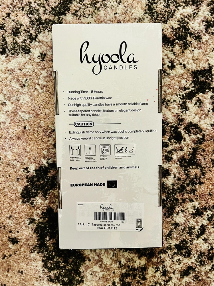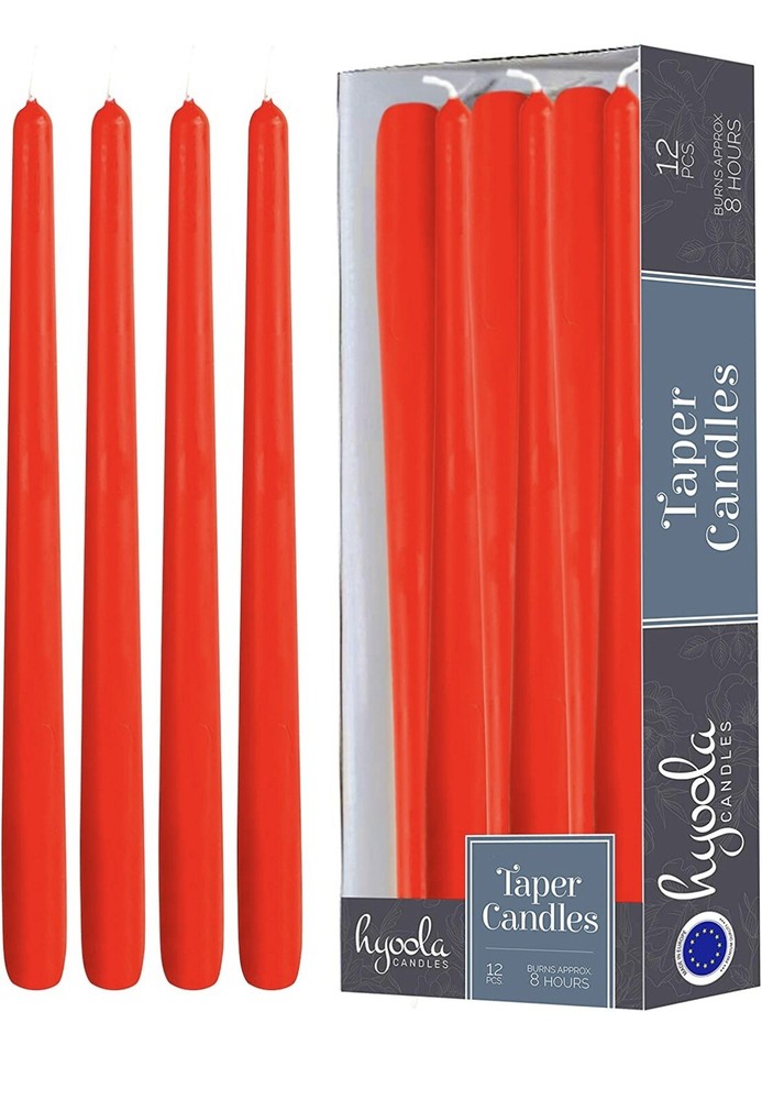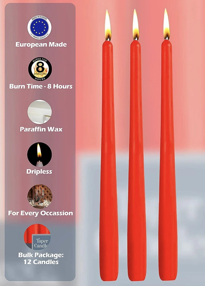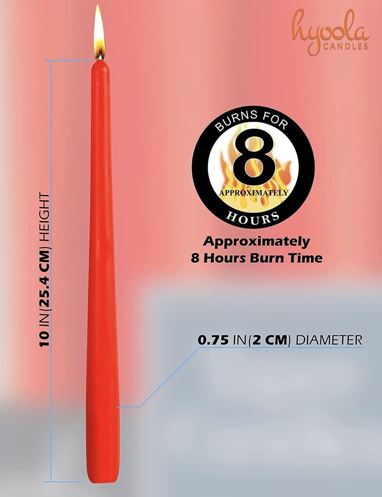 12 Pack Tall Taper Candles - 10 Inch Burgundy Dripless, Unscented Dinner Candle. *NIB* PREMIUM QUALITY CANDLES Need some natural candlelight to illuminate your surroundings for a special occasion? Look no further than these tall taper candles by Hyoola. They exude a warm glow and a long-lasting flame. Tapered design is narrower on top and wider towards the base for candles with an elegant look that fit in most standard-sized candle holders. Made of 100% high-quality paraffin wax, our candles are over-dipped, or dipped in layers, for a beautiful smooth finish. 100% cotton wick ensures a long-lasting, even burn. PRODUCT FEATURES: 100% Paraffin Wax Candles 100% Cotton Wicks Over Dipped for Smooth Finish Dripless Unscented Made in EU Perfect for Restaurants or catered events. - 10” - 8 Burn Time MULTIPURPOSE USE Hyoola’s 12-piece candle boxes equip you for any occasion, whether it be a wedding or celebration, religious observance, and more. The clean white or ivory of these candles, in combination with their elegant tapered shape, makes them perfect for church prayers, Sabbath kindling lights, and other religious rituals as well. Hyoola are importers of the highest quality Chanukah and specialty candles since 1940. SET THE MOOD: These tall tapered candles feature an elegant design that is suitable for restaurants, special events and parties. Their classic look complements almost any decor. CRAFTED WITH QUALITY: Imported from Europe and made with 100% paraffin wax and pure cotton wicks, these high quality candles burn cleanly and do not drip or create a mess. A ROMANTIC TOUCH: Spice up the romance with a candlelit dinner with your loved one. With a universal fit, they fit most candlesticks and candelabras - perfect for indoor and outdoor use. CEREMONIAL OR TABLE LIGHT: These aroma free Shabbat candles are perfect for weddings ceremonies, holidays and religious events. Perfect for use in Synagogues and churches. DRIPLESS: It's not magic, a "dripless" candle, is an ideal blend of hard wax and a perfectly sized wick. But for a dripless candle to remain dripless, burning conditions must be ideal. The candle has to stand up vertically, not even at a slight angle. Keep the dripless candle away from drafts (air conditioning, fans, outdoors, window draft) as well, as a slight breeze could cause the flame to flare up larger than usual or to touch areas of wax that it normally wouldn't reach, causing drips.