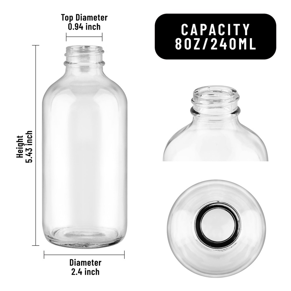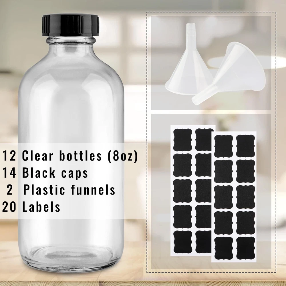 12 Pack 8 oz Clear Glass Bottles, 240ml Boston Round Sample Bottles with Black Poly Cone Caps, Labels and Funnels Product Details Color: Clear Brand: PINIWON MPN: Does not apply UPC: Does not apply EAN: Does not apply Brand: PINIWON Material: Glass Bottle Type: Boston Round Bottles Color: Clear Capacity: 8 ounces Brand: PINIWON Material: Glass Bottle Type: Boston Round Bottles Color: Clear Capacity: 8 ounces Special Feature: Leak Proof Product Dimensions: 2.4"W x 5.43"H Product Care Instructions: Hand Wash Only Number of Items: 12 Reusability: Reusable Shape: Round Finish Type: Sealed Unit Count: 12.0 Count Package Information: Boston Round Bottles Item Weight: 2.29 Kilograms Item Weight: 5.04 pounds Finish: Sealed Special Features: Leak Proof Batteries Required?: No Date First Available: April 7, 2024 What's Included: 12 Pack 8oz (240ml) Clear Boston Round Bottles with 14 black poly cone caps, bonus 2 plastic funnels and 20 pcs labels. Quality Material: These bottles are made of strong thick clear glass, BPA-free, durable and reusable. The high transparency wall allows you to identify the liquid easily. Airtight Sealed Caps: The black plastic screw cap is tightly sealed with the bottle mouth to ensure no leakage, prevents air from entering and makes the liquids not easy to deteriorate, keeping your liquids stay fresh and safe. Multiple Uses: Perfectly designed for bottling homemade vanilla extract, essential oils, perfume oils, tinctures, alcohol, syrups, flavorings, juices, beverages, herbal extracts, chemistry lab chemicals, and more. Ideal Travel Bottles: With its portable size, you can carry any liquid you want with this bottle, conveniently fits in your bag. They are packaged carefully with a foam barrier to reduce damage, if they still get broken, please feel free to contact us.