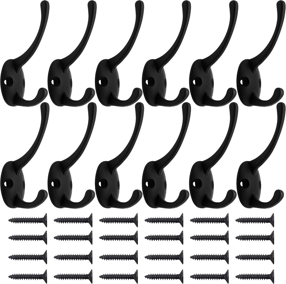 12 Pack Black Coat Hooks Wall Mounted with 24 Screws Retro Double Hooks Description: Material: These heavy duty dual prong hooks are made of good quality zinc die cast material, the screws are made of iron, it can easily hold up to 20 lbs of weight. Hard and sturdy, can widely support coat, scarf, umbrella, bag, towel, key, hat, cup as well as Christmas socks and Christmas wreath Multiple Applications: These retro hooks design with double hooks, perfect for use in bathroom, bedroom, closet, foyer, entryway, fence hanging towels, coat, hats, purse, jackets, robe, back packs. DIY pellet coat rack, and make them easy to find. These double hooks is a good way to store your space Size: the coat hook dimension is 86 x 45 mm or 3.3 x 1.8 inches, screws are 18 mm long and 3 mm in screw head diameter, easy for installation Package Includes: This package includes 12 pieces of double prong hooks with 24 pieces of screws