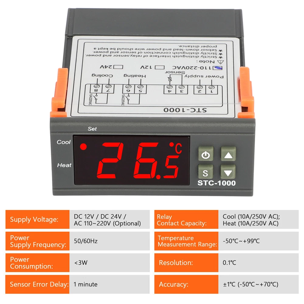 Item always Will Be Sent Out in 24 Hours From Monday to Saturday From California USA With USPS Tracking No. Product Features Features: Temperature Measuring Range: -50℃~99℃, Resolution: 0.1℃, Accuracy: ±1℃(-50℃~70℃), Sensor Error Delay: 1 minute LCD Display: Mini and light weight design.Large and clear LCD display. Multi-function: Digital temperature controller has many functions, you can switch the modes between cool and heat. It supports temperature calibration function and refrigerating control output delay protection function. High Security: Thermostat controller features high security, it will alarm when temperature exceeds temperature limit or when sensor error. Temperature Control: This temperature controller can control temperature by setting the temperature set value and the difference value. Wide Application: The thermostat can be widely used in aquarium, terrariums, zoo and chicken incubator. Suitable for: Digital temperature controller 110V can be used in moisture and water environment, you can use it in home brewing, fridge, pet breeding, reptile, tank, incubation, fermentation, seedling heat mat, accelerating germination. Product Specification Type Digital Temperature Controller Color Black Usage Indoor Display Type Red Led Bar Sensor NTC sensor Use for Aquarium, Terrarium, Vivarium, Paludarium, etc Style Modular Standing Station Sensor NTC sensor Temperature Measuring Range -50 to 99 °C Resolution 0.1 °C Accuracy ±1 °C (-50 to 70 °C) Sensor error delay 1 minute Relay contact capacity (Heating) 10A (max) 250 V Relay contact capacity (Cooling) 10 A (max) 250 V Compressor delay protective time 1 ~ 10 minutes (adjustable) Ambient Temperature 0 to 60 °C Storage Temperature -30 to 75 °C Relative Humidity 20 ~ 85 % (No condensate) Alarm Output Buzzer Power Supply 110~ 220V AC±10% , 50 / 60 Hz Power consumption < 3 W Sensor length 1 M(include the probe) Mounting Size 71 x 29MM Item dimensions approx. 75 x 34.5 x 85 MM Package Included 1 x STC-1000 Digital Temperature Controller 1 x NTC Sensor (1m cable) 1 x English Manual Payment 1.We only accept PayPal. Credit card payment can also be made via PayPal.eBay Immediate Payment via PayPal. 2.Please fill in a valid contact address. Shipment Items are usually shipped 1 business days after payment has been received. We do not ship on weekends and holidays. Sellers are not responsible for service transit time. Transit times are provided by the carrier, exclude weekends and holidays, and may vary with package origin and destination, particularly during peak periods. Return Policy Out 30-day Satisfaction Guarantee assures our customers that they will receive all orders promptly and exactly as described. In addition , it allows customers to return new and unused products in their original factory condition for any reason within 30 days from the date of purchase. Notice: 1.All returns must be pre-approved by Seller and have a return merchandise authorization (RMA) number. Any problem about item, Please Send the eBay message to us ,we will respone in 24 hours 2.Buyers are responsible for appropriate packing, returning shipping cost, insurance and returning the item in “new” condition. Used items will not be accepted for return. 3.We will replace the returning item with an identical item, issue a full refund. Contact us 1.If for some reason there is any issue with the purchase, please contact us prior to leaving any negative or netrual feedback, and we will work with you to have it resolved.