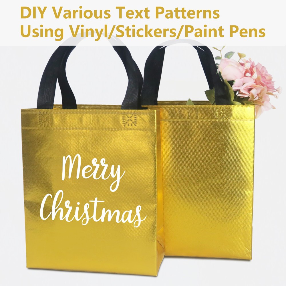 PREMIUM MATERIALS: This gold gift bags are made of high-quality non-woven fabric, so it can withstand heavier weight, stronger and not easy to break. ELEGANT & BEAUTIFUL: This shiny gift bags have a charming metallic luster on the surface, the appearance is beautiful gold, the handle is black, elegant and beautiful, fashionable and exquisite, as a gift bag is absolutely unique and attractive. REUSABLE: This reusable gift bags are made of strong and durable non-woven material, the surface is waterproof, the bottom is matched with cardboard, it can withstand heavier items, while ensuring that the bottom is flat, it can be used daily as a shopping bag, grocery bag, economical and practical. MULTIPLE OCCASIONS: This metallicl gift bags are suitable for various occasions, you can DIY various words and patterns with stickers or paint pens (please stay away from heat sources), which is very suitable for christmas, diwali, wedding, birthdays, party and other occasions. SIZE INFORMATION: The size of the gold gift bags are 8 x 4 x 10 inches/20 x 10 x 25 cm (L x W x H) , it can hold most gifts and enough party supplies.