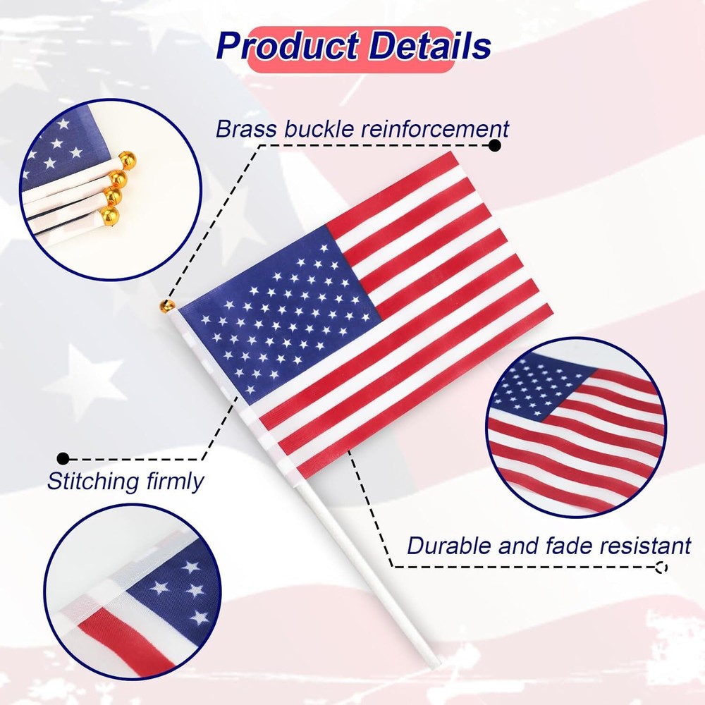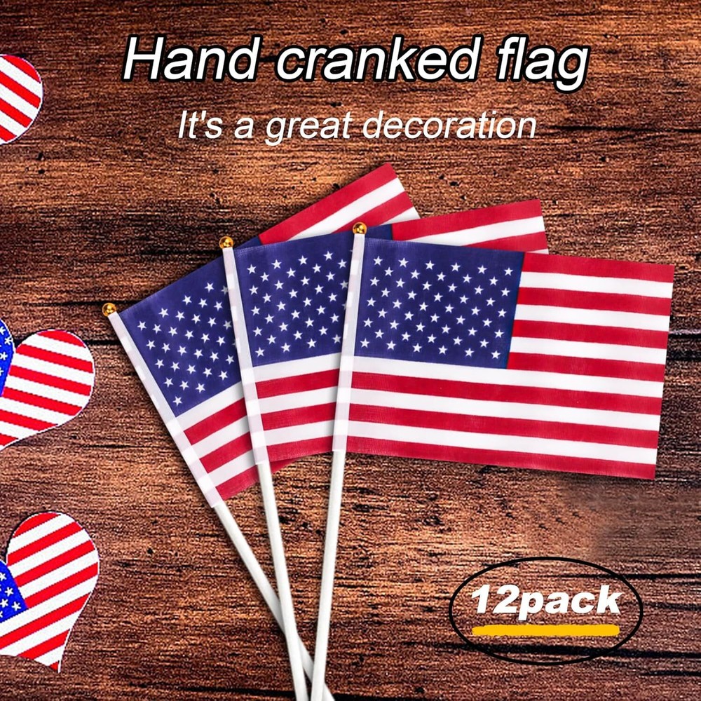 12 Pack Small American Flags Mini American Flag/Us Flags on Stick 8X12 Inch US 【High-quality Materials】: These mini American flags are made of durable polyester fabric, ensuring long-lasting use and resistance to fading. 【Perfect Size】: Measuring 8x12 inches, these handheld flags are the ideal size for displaying your patriotism in a compact and portable way. 【Pack of 12】: With this 12 pack, you'll have enough mini American flags to decorate your yard, patio, or even hand out at patriotic events and celebrations. 【Easy to Use】: Each flag comes with a sturdy stick that allows you to easily wave and display your American pride.