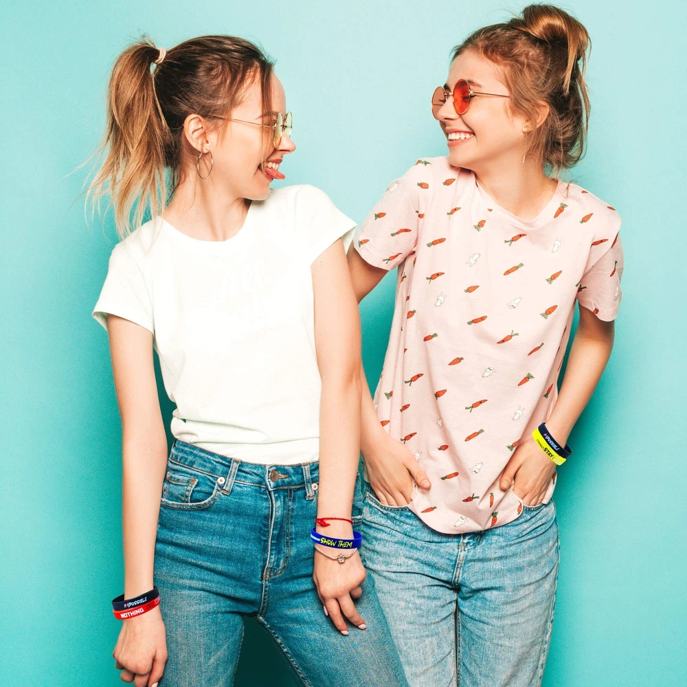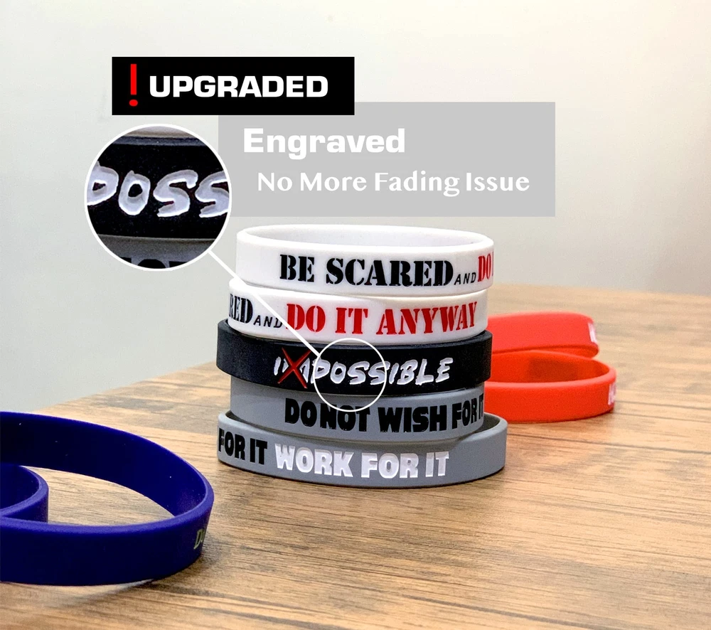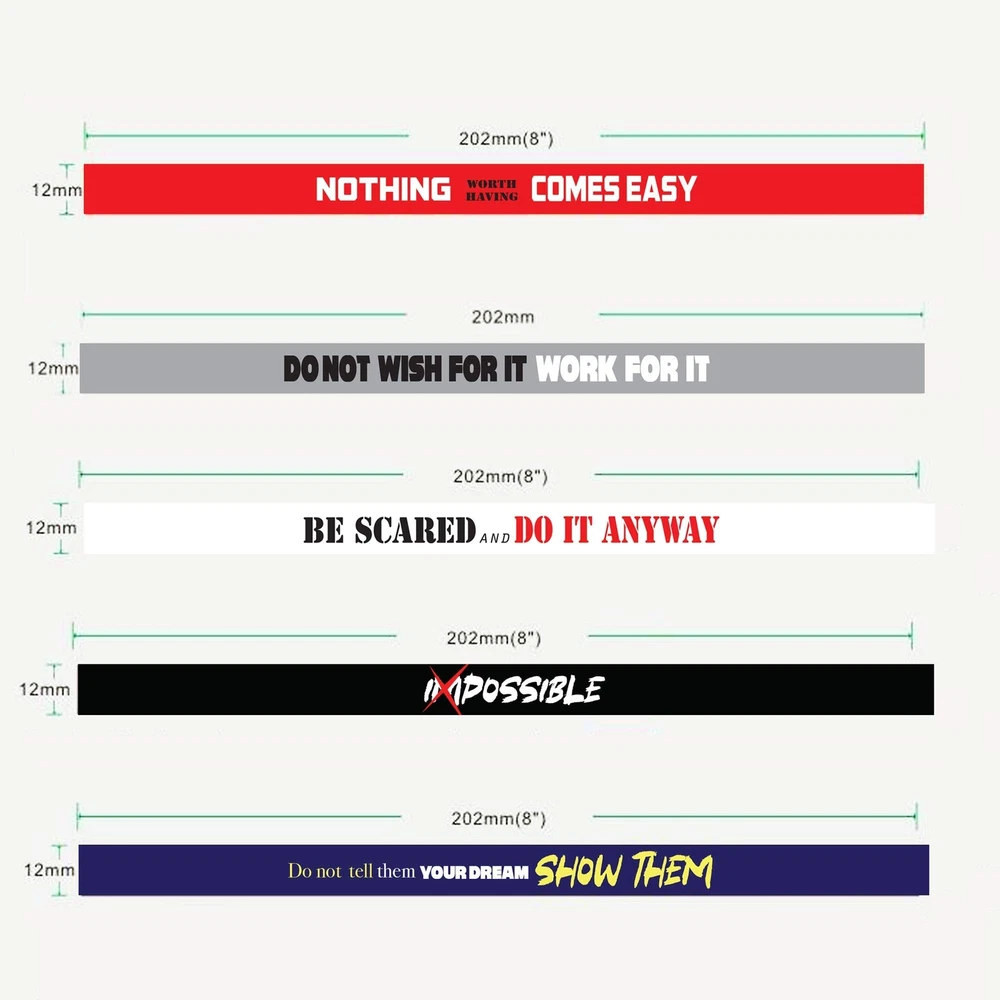 Do Not Wish For It, Work For It! Make this the year that you achieve your goals. With a motivational wristband set from , you can stay motivated, inspired, and optimistic every single day, helping you to make positive steps towards accomplishing your dreams. Our lightweight silicone bracelets give you a constant reminder throughout the day that nothing is impossible, and you have the capability to achieve anything you set your mind to. Five Inspirational Messages To Choose From Each 12-pack of motivational wristbands contains five different quotes; 2 x Nothing Worth Having Comes Easy (Red), 4 x Do Not Wish For It, Work For It (Grey), 2 x Be Scared And Do It Anyway (White), 2 x Impossible (Black), and 2 x Do Not Tell Them Your Dreams, Show Them (Navy). Now you can mix and match your favourite quotes and styles to your outfit! For Students, Athletes, Employees and Adults Whatever challenge you are facing in life, keeping a positive mental attitude is the key to remaining calm and composed in the face of adversity. Whether you are an athlete in the gym training to hit your personal best, a student in college studying hard for your upcoming exams, or simply working overtime at your job to achieve a promotion, wearing a motivational wristband can remind you to work hard, never give up and face your fears. Comfortable, Lightweight Silicone Bracelets Suitable for any occasion, our rubber wristbands are lightweight, durable, and soft to ensure a comfortable fit for hours on end. The soft silicone doesn’t rub against skin and can withstand heavy use. Our motivational bracelets are 8” long, the standard size for most adults. The bands are 12mm wide, making them easy to wear under long sleeves, or stack multiple bands together. Kids, teens and adults alike will love wearing their motivational quote bands. ACHIEVE YOUR GOALS: wearing a motivational wristband is a great way to remind yourself to never give up on your dreams. Our soft rubber bracelets has messages that uplift and encourage you every day. 5 INSPIRATIONAL QUOTES: You will find five memorable motivational quotes within each 12 pack of rubber wristbands. Mix and match your favourite messages to suit your needs. SLEEK & STYLISH BRACELET DESIGN: motivational bracelets are 8" long and 1.2cm thick and crafted with soft and lightweight silicone for a comfortable fit. Both durable and long-lasting. UNISEX SILICONE WRISTBANDS: Our unisex wristbands are suitable for men, women, and teens. The variety multipack is perfect for sharing with friends, family, sports teams and colleagues. FUN GIFTS FOR TEENS & KIDS: Use as a party favour/stocking filler for teens! Our rubber bands wristbands are a great gift for both gender on any special occasion and make a thoughtful birthday Gift.