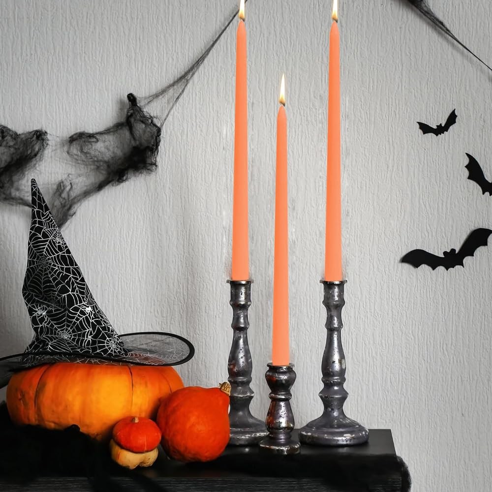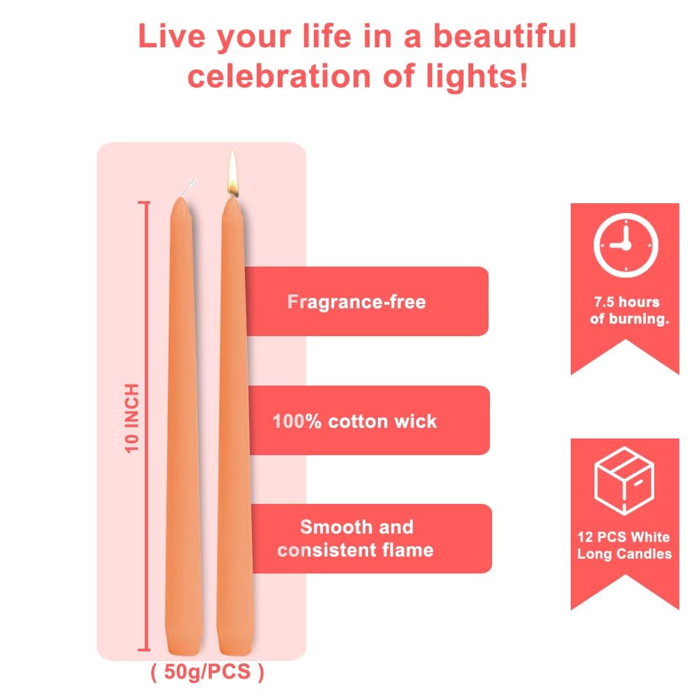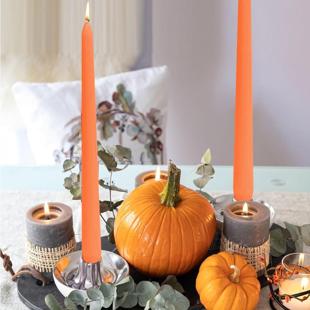 12 Pack Orange Taper Candles, 10 Inch Unscented Orange Long Candles Low Heat Halloween Taper Candles, Perfect for Dinner, Party, & Churches Home Décor Diameter: 2.2cm/0.87 inches, length: 25cm/10 inches 12 Pack Halloween Orange Candles - The taper candle set includes 12 pieces 10 INCH long Orange candles, perfect for Halloween Decoration. Enjoy Your Home Time - This Orange taper candles are must-have in the home. Whether you are having a fancy party or a casual dinner. Long Burning Time - Each candle bruning lasting 8 hours, Diameter: 2.2cm/0.87 inches, length: 25cm/10 inches, the long candles have a tapered top design to fit the Candlestick. Widely Used Candles - These taper candles Orange are perfect for Halloween Decor, Dinner, Wedding, Parties, Home Decor,etc. Multi Purpose - Perfect as a gift for hosts, for use in vigils, church and religious ceremonies, or to as emergency blackout candles.