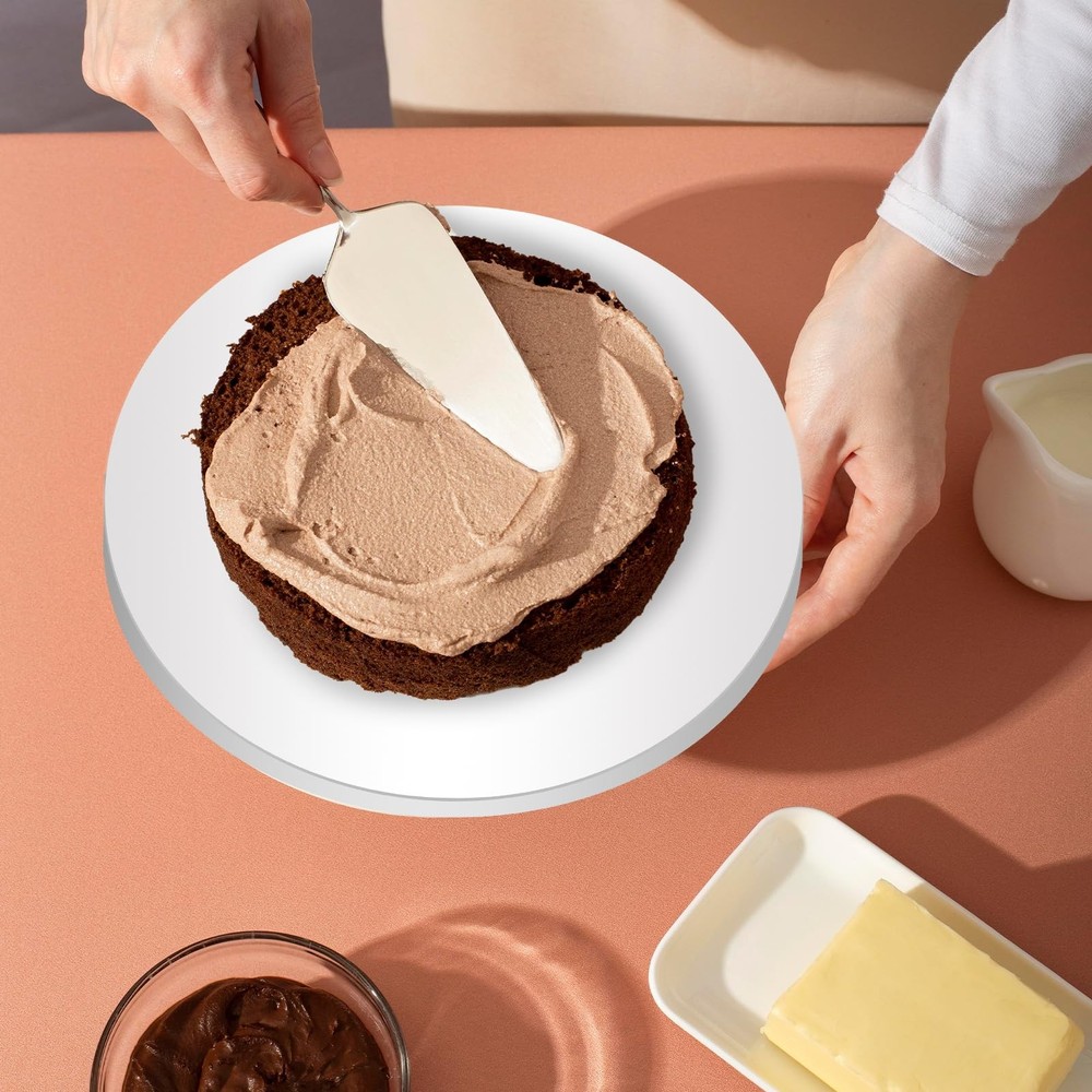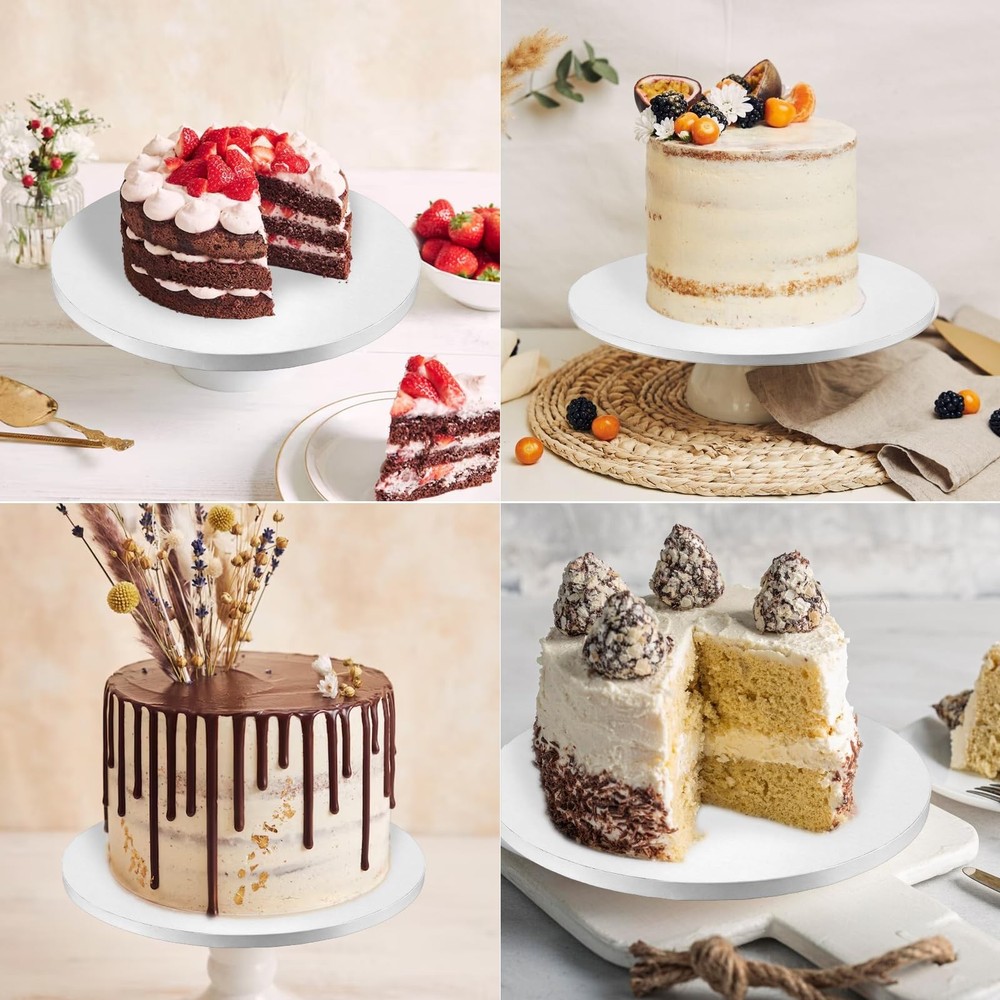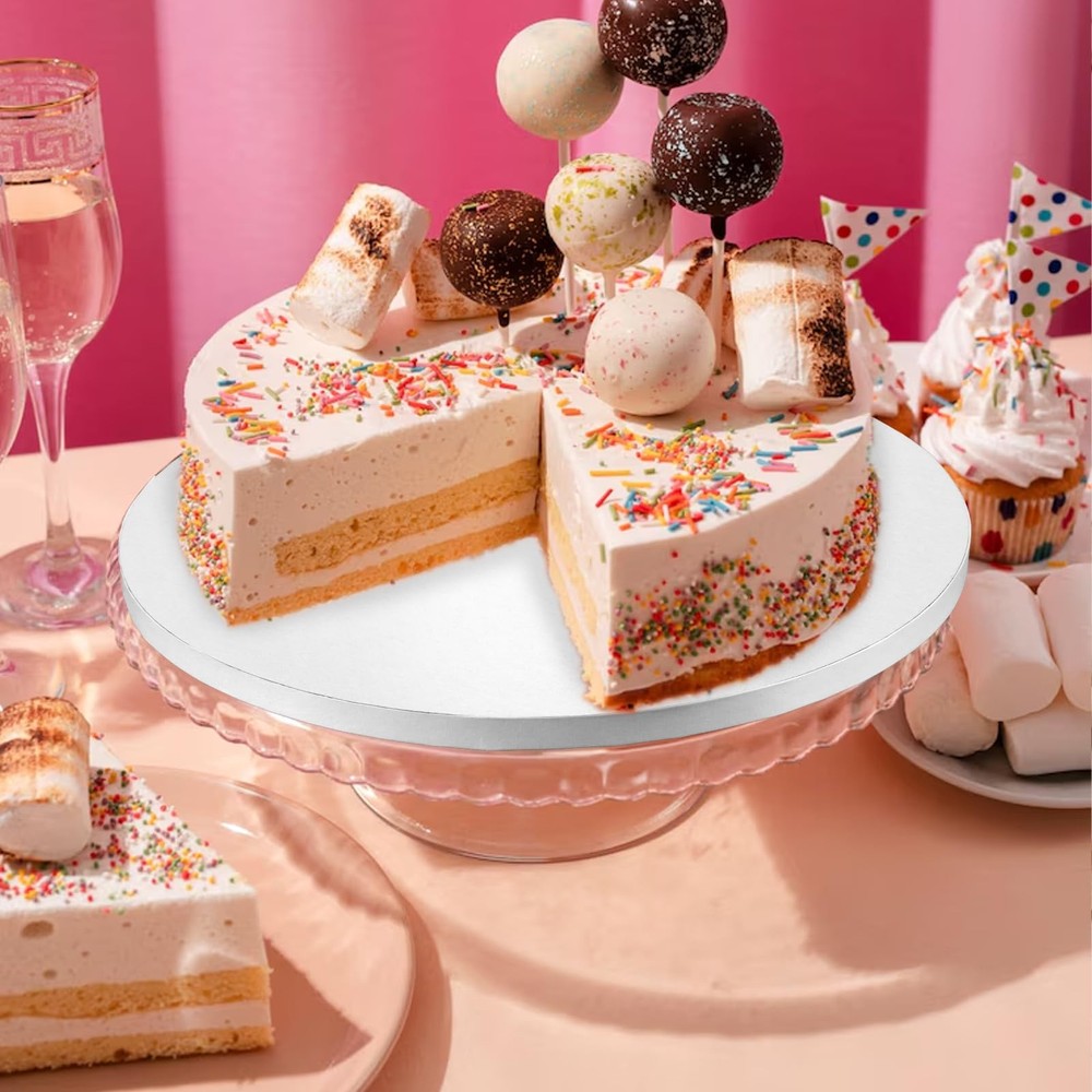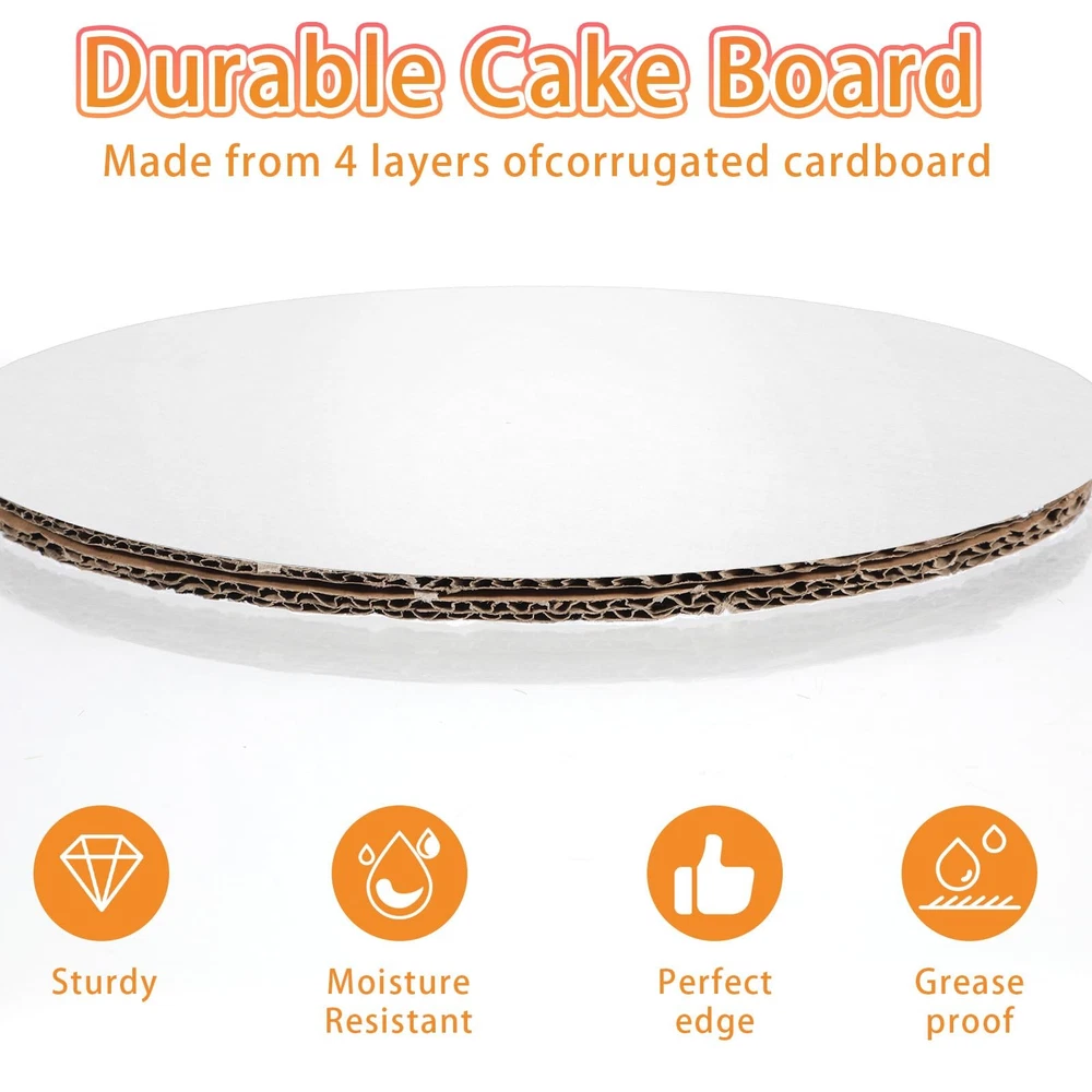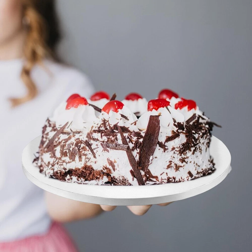 Product Name: Cake Tray Material: Plastic Color: White Net Weight: 1132g Dimensions: 25 x 25 x 1.3cm Packaging: Bags Packaging Contents: 12 pcs cake trays 12-Pack Convenience: This set includes 12 cake drums 10 inch round, ensuring you have plenty for all your baking needs. Whether running a high-end bakery or a cozy coffee , these cake drums will serve you well, providing ample quantity for daily use and easy replacements. Durable and Sturdy: Made from four layers of corrugated cardboard, these round cake board wholesale are 1/2 inch thick and can support multi-layer cakes without bending. Their light yet strong construction ensures stability, and the flat surface won’t damage your cake's base. Grease-Proof Technology: Featuring a laminated layer, our 10 inch drum cake board could prevent absorption, allowing you to confidently use cream, chocolate, fruit, and other frostings without worrying about the base getting soggy or weak. Elegant and Practical Design: The white circular design not only highlights the beauty of your cakes but also ensures your colorful icings and decorations pop. These 10-inch cake drums enhance the professional look of your baked creations, drawing attention to your cake's stunning appearance. Versatile for Various Occasions: These 10 inch drums are great for weddings, birthdays, parties, anniversaries, baby showers, bridal showers, and more. Use them at seasonal celebrations like Christmas and Halloween, family gatherings, or baking parties.