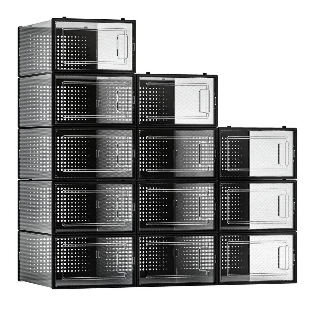 Organize your closet or hallway and keep your shoes dust and neatly organized with the stackable shoe storage bins. The clear makes it easy to view the contents within Stackable design to help maximize your space. Stack or use them side by side to keep your shoes organized and easy to find. Ideal for organizing small daily items such as shoes, scarves, winter gear, clothing, purses, crafts, toys, books, games and more Ideal for closet, bedroom, bathroom, laundry room, craft room, mudroom, offices, playroom, garage, or any room of your home / apartment / condo / dorm room / RV or camper Practically designed with rear ventilation holes to allow circulation and odor prevention. Foldable design for easy storage when not in use. Quickly unfolds for easy and convenient storage Made of sturdy and durable high quality strong plastic material. Lightweight soft plastic walls and hard plastic door frame. Each bin measures approx. 13.4” × 9.5” × 5.7”. Made for medium size shoes up to size 8 men’s
