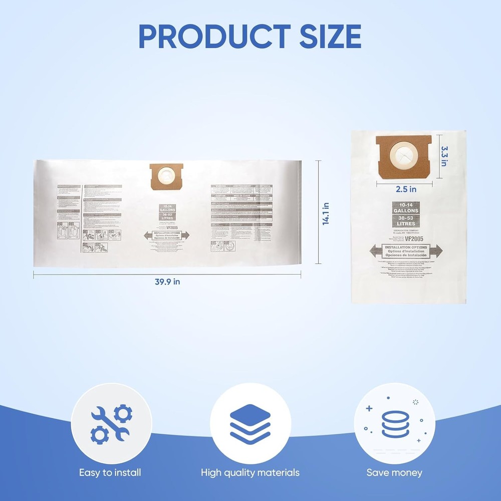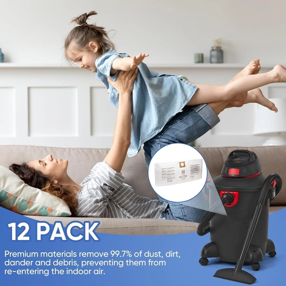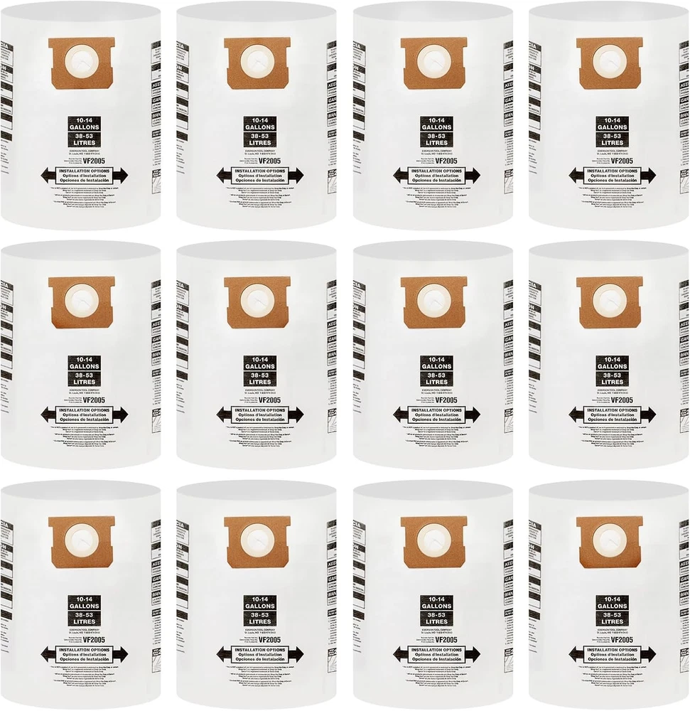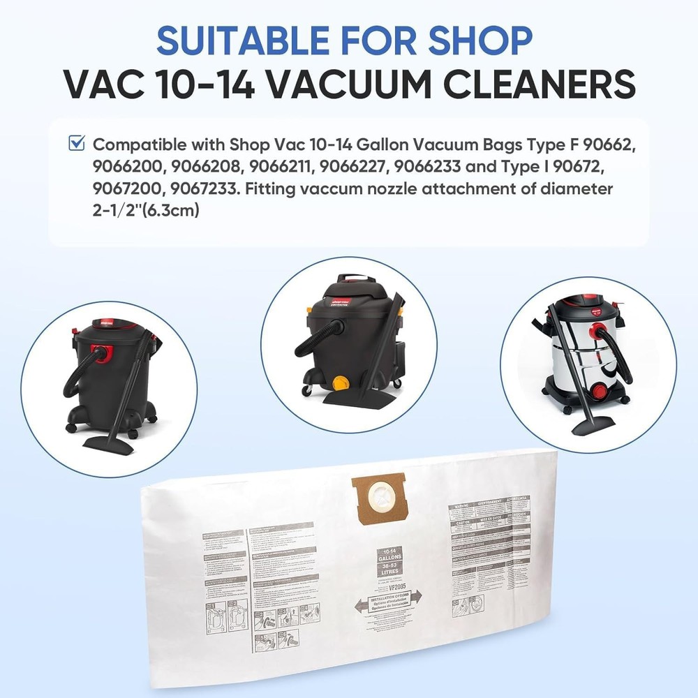 【Fit for Shop Vac Bags】: Compatible with Shop Vac 10-14 Gallon Vacuum Bags Type F 90662, 9066200, 9066208, 9066211, 9066227, 9066233 and Type I 90672, 9067200, 9067233. Fitting vaccum nozzle attachment of diameter 2-1/2''(6.3cm) 【Also Compatible Model】: 12 Gallon Vacuum Bags Also Fit for Vacmaster filter bags model: VDBM VHBM VHBL VDBL; Fit for Craftsman Vac bags model: 9-3873538735 CMXZVBE3877 CMXZVBE38768;Multi Fit VF2005.NOT WORK for WORKSHOP Products 【APPLICATION】: It Can Be Used in a Variety of Scenarios Such as Home,Office and Industry. The Pleated Vacuum Filter is Perfect for Collecting Most of The Daily Dirt, Sawdust and Pet Dander, Capturing at Least 99.97% of The Particles to Make Your Environment Cleaner and Healthier 【VALUABLE PACKAGE】: ①Package include:12 x 10-14 Gallon Vacuum Bags.②Easy to Be Installed, No Tools,RUBBER Sealing Collar Locks the Dust Inside, Prevents Backflow. Disposable Without Second Air Pollution