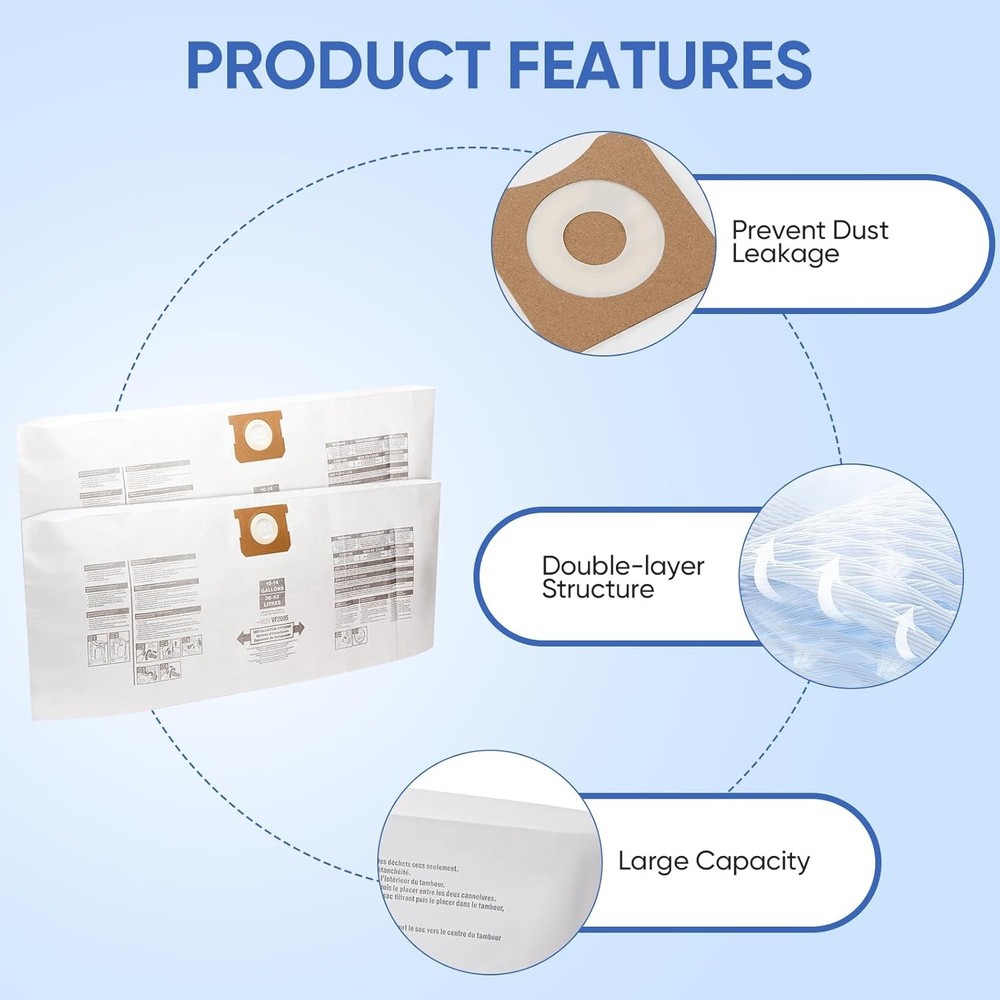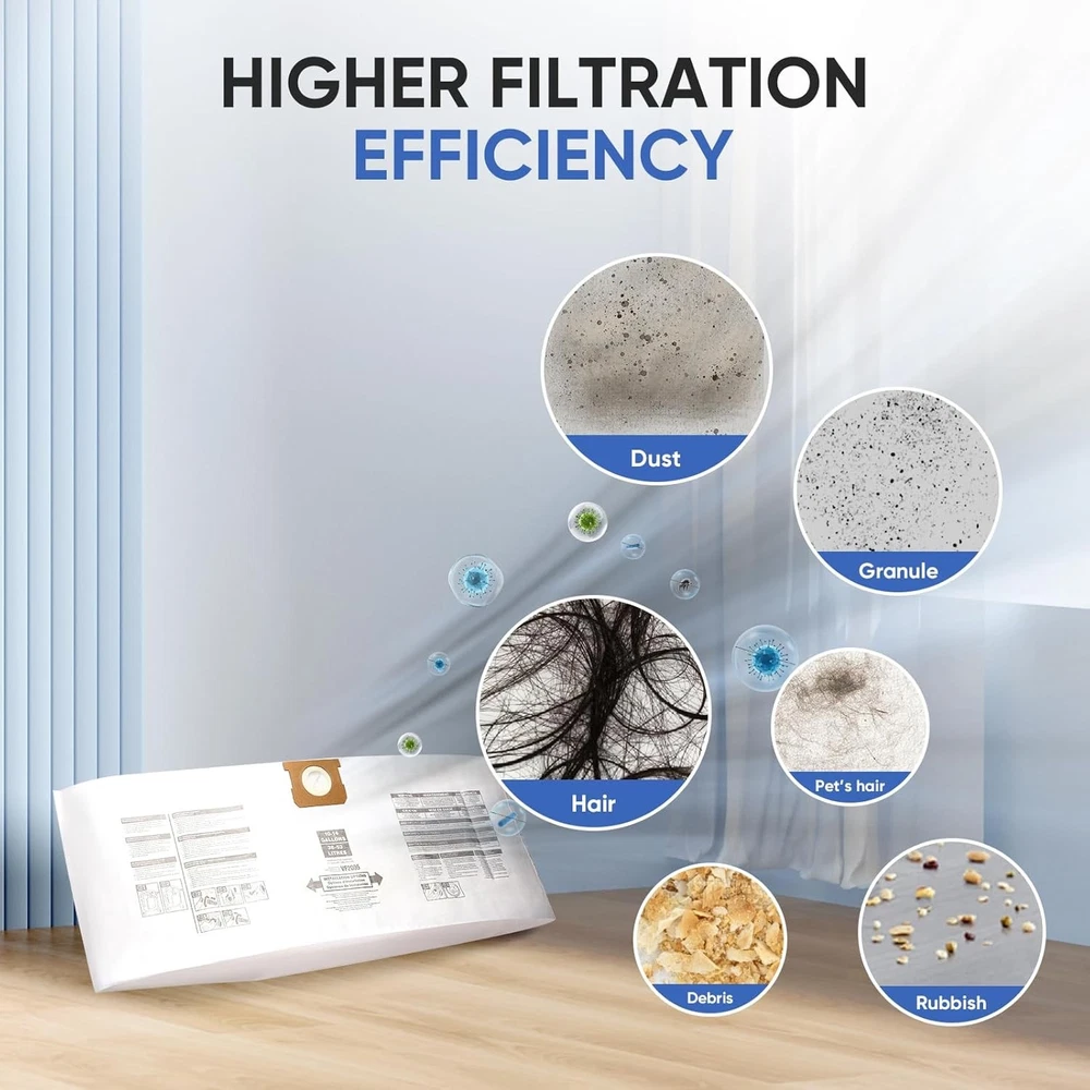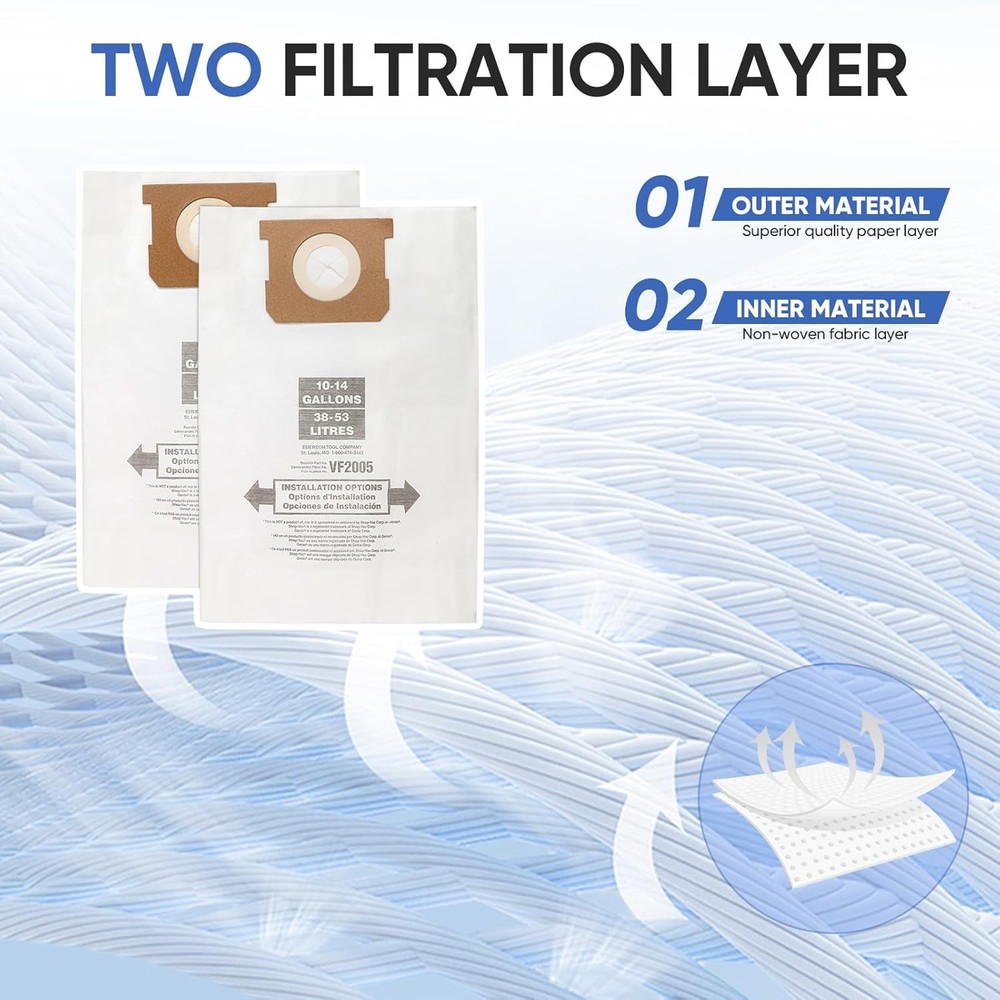 【Fit for Shop Vac Bags】: Compatible with Shop Vac 10-14 Gallon Vacuum Bags Type F 90662, 9066200, 9066208, 9066211, 9066227, 9066233 and Type I 90672, 9067200, 9067233. Fitting vaccum nozzle attachment of diameter 2-1/2''(6.3cm) 【Also Compatible Model】: 12 Gallon Vacuum Bags Also Fit for Vacmaster filter bags model: VDBM VHBM VHBL VDBL; Fit for Craftsman Vac bags model: 9-3873538735 CMXZVBE3877 CMXZVBE38768;Multi Fit VF2005.NOT WORK for WORKSHOP Products 【APPLICATION】: It Can Be Used in a Variety of Scenarios Such as Home,Office and Industry. The Pleated Vacuum Filter is Perfect for Collecting Most of The Daily Dirt, Sawdust and Pet Dander, Capturing at Least 99.97% of The Particles to Make Your Environment Cleaner and Healthier 【VALUABLE PACKAGE】: ①Package include:12 x 10-14 Gallon Vacuum Bags.②Easy to Be Installed, No Tools,RUBBER Sealing Collar Locks the Dust Inside, Prevents Backflow. Disposable Without Second Air Pollution