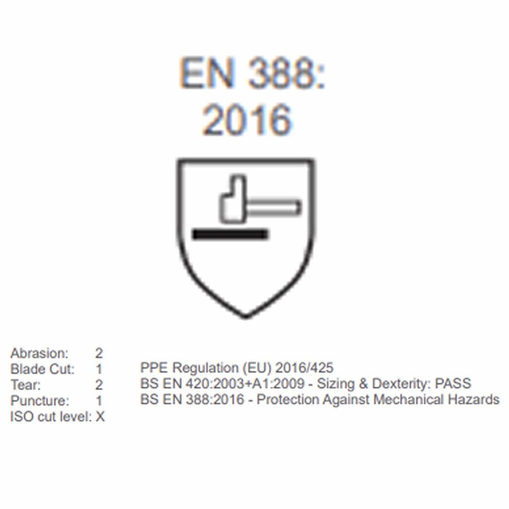 12 x Mens Handler Latex Coated Grip Glove PRODUCT INFORMATION Our mixed fibre Handler Gloves are a popular choice for a range of handling tasks. The latex palm gives fantastic grip whilst the soft knitted fabric & uncoated back allows the hand to breathe, keeping you comfortable throughout the day Army & Workwear Grove Spec CE Certified EN388 Abrasion Resistance 1 2 3 4 n/a 2 Blade Cut Resistance 1 2 3 4 5 1 Tear Resistance 1 2 3 4 n/a 2 Puncture Resistance 1 2 3 4 n/a 1 FEATURES Conforms to EN 388 levels 2-1-2-1 Mixed fibre glove Latex palm coat Textured grip Conforms to En 388 Ribbed knit wrist Enhanced cut/tear resistance Suitable for builders, construction, tradesman, general industry, joiners, DIY, gardening, removals etc... ARMY AND WORKER GLOVE SPEC GLOVE SIZE GUIDE S M L XL XXL 7 8 9 10 11 Hand Length (mm) (A) 171 182 192 204 215 Hand Circumference (mm) (B) 178 203 229 254 279 12 x Mens Handler Latex Coated Grip Glove PRODUCT INFORMATION Our mixed fibre Handler Gloves are a popular choice for a range of handling tasks. The latex palm gives fantastic grip whilst the soft knitted fabric & uncoated back allows the hand to breathe, keeping you comfortable throughout the day Army & Workwear Grove Spec CE Certified EN388 Abrasion Resistance n/a Blade Cut Resistance Tear Resistance n/a Puncture Resistance n/a FEATURES Conforms to EN 388 levels 2-1-2-1 Mixed fibre glove Latex palm coat Textured grip Conforms to En 388 Ribbed knit wrist Enhanced cut/tear resistance Suitable for builders, construction, tradesman, general industry, joiners, DIY, gardening, removals etc... ARMY AND WORKER GLOVE SPEC GLOVE SIZE GUIDE XXL Hand Length (mm) (A) 171 182 Hand Circumference (mm) (