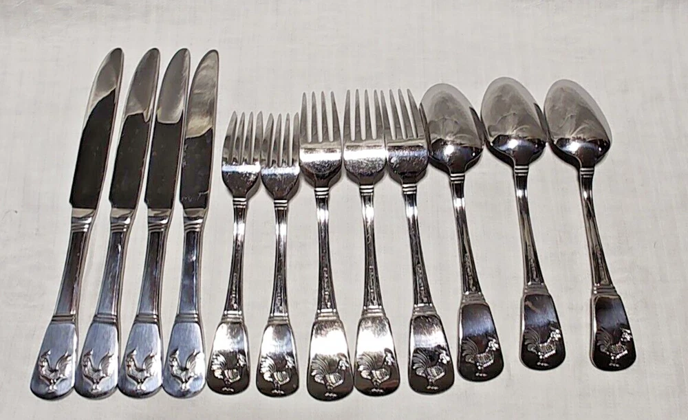The 12-piece Cuisinart Elite FRENCH ROOSTER flatware set includes a knife, fork, and spoon, all made of stainless steel with a French wood tone design featuring a FRENCH ROOSTER pattern. The set is silver in color, with a glossy finish and solid handle pattern. It is dishwasher safe, reusable, and can be machine washed up to 100°F. This stylish and durable flatware set is suitable for all occasions and comes with a lifetime manufacturer warranty. Perfect for adults, this set adds a touch of elegance to any dining experience.