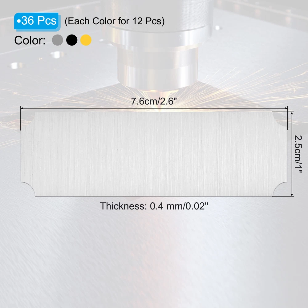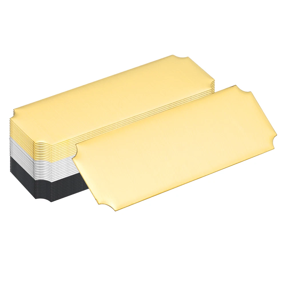 Document Our engraved nameplates are perfect for mounting on plaques, picture frames, sweaters, trophies, bags, display boxes, flag cases, and anything else.SpecificationMaterial: Stainless SteelColor: Silver/Gold/BlackSize: 7.6 x 2.5 cm/3 x 1 Inch(L*W)Thickness: 0.4 mm/0.02 InchPacking List: 12 Pcs x Engraved NameplateAdvantageOur engraved nameplates are made of brushed stainless steel which is durable, stable, not easy to fade, rust, or break, and can be used for a long time. With a smooth surface, it will not scratch your skin.The right thickness makes the plate stronger and allows for deeper engraving. These elegant nameplates have a beautiful luster and a simple design. Suitable for various crafts to add brilliance.The protective film design can effectively prevent scratches. The adhesive backing design allows you to stick this nameplate anywhere without any tools and it can be firmly on the objects.InstructionPlace a metal workbench block underneath the blank stamping tags for better stamping.NOTE:1. There may be light scratches and blemishes due to shipping, but they can be polished.2. Only for laser engraving, not suitable for mechanical engraving.3. Please remove the protective film before use. 12 Pcs 3" x 1" Engraved Name Plate Picture Frame Label Art Tag,Silver/Gold/Black Our engraved nameplates are perfect for mounting on plaques, picture frames, sweaters, trophies, bags, display boxes, flag cases, and anything else. Specification Material: Stainless Steel Color: Silver/Gold/Black Size: 7.6 x 2.5 cm/3 x 1 Inch(L*W) Thickness: 0.4 mm/0.02 Inch Packing List: 12 Pcs x Engraved Nameplate Advantage Our engraved nameplates are made of brushed stainless steel which is durable, stable, not easy to fade, rust, or break, and can be used for a long time. With a smooth surface, it will not scratch your skin. The right thickness makes the plate stronger and allows for deeper engraving. These elegant nameplates have a beautiful luster and a simple design. Suitable for various crafts to add brilliance. The protective film design can effectively prevent scratches. The adhesive backing design allows you to stick this nameplate anywhere without any tools and it can be firmly on the objects. Instruction Place a metal workbench block underneath the blank stamping tags for better stamping. NOTE: 1. There may be light scratches and blemishes due to shipping, but they can be polished. 2. Only for laser engraving, not suitable for mechanical engraving. 3. Please remove the protective film before use. Hot Item Payment 1.We accept eBay payment . 2.Payment must be received within 7 business days of auction closing. Shipping 1.We ship to your eBay or Paypal address. Please make sure your eBay and Paypal address is correct before you pay. 2.Items will be shipped within 1-3 business day when we received payment. 3.Delivery time depends on destination and other factors. Description Policy 12 Pcs 3" x 1" Engraved Name Plate Picture Frame Label Art Tag,Silver/Gold/Black Our engraved nameplates are perfect for mounting on plaques, picture frames, sweaters, trophies, bags, display boxes, flag cases, and anything else. Specification Material: Stainless Steel Color: Silver/Gold/Black Size: 7.6 x 2.5 cm/3 x 1 Inch(L*W) Thickness: 0.4 mm/0.02 Inch Packing List: 12 Pcs x Engraved Nameplate Advantage Our engraved nameplates are made of brushed stainless steel which is durable, stable, not easy to fade, rust, or break, and can be used for a long time. With a smooth surface, it will not scratch your skin. The right thickness makes the plate stronger and allows for deeper engraving. These elegant nameplates have a beautiful luster and a simple design. Suitable for various crafts to add brilliance. The protective film design can effectively prevent scratches. The adhesive backing design allows you to stick this nameplate anywhere without any tools and it can be firmly on the objects. Instruction Place a metal workbench block underneath the blank stamping tags for better stamping. NOTE: 1. There may be light scratches and blemishes due to shipping, but they can be polished. 2. Only for laser engraving, not suitable for mechanical engraving. 3. Please remove the protective film before use. Hot Item Payment 1.We accept eBay payment . 2.Payment must be received within 7 business days of auction closing. Shipping 1.We ship to your eBay or Paypal address. Please make sure your eBay and Paypal address is correct before you pay. 2.Items will be shipped within 1-3 business day when we received payment. 3.Delivery time depends on destination and other factors.