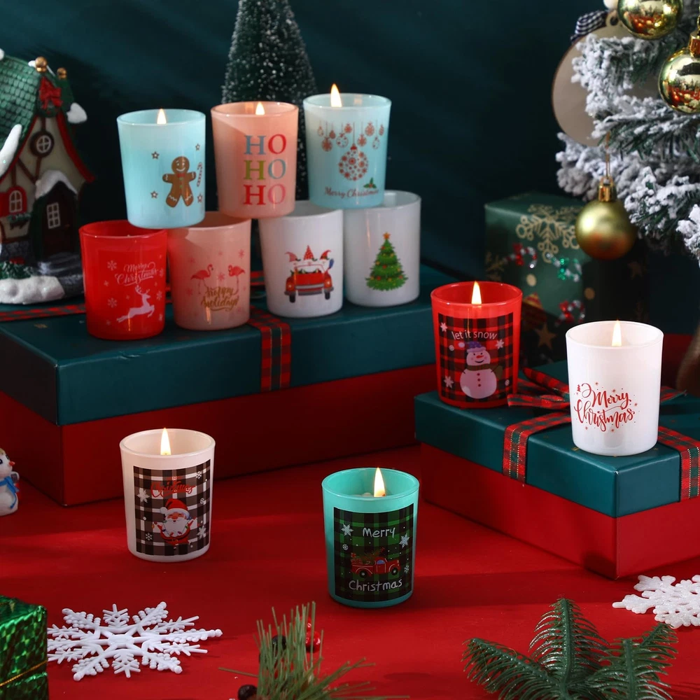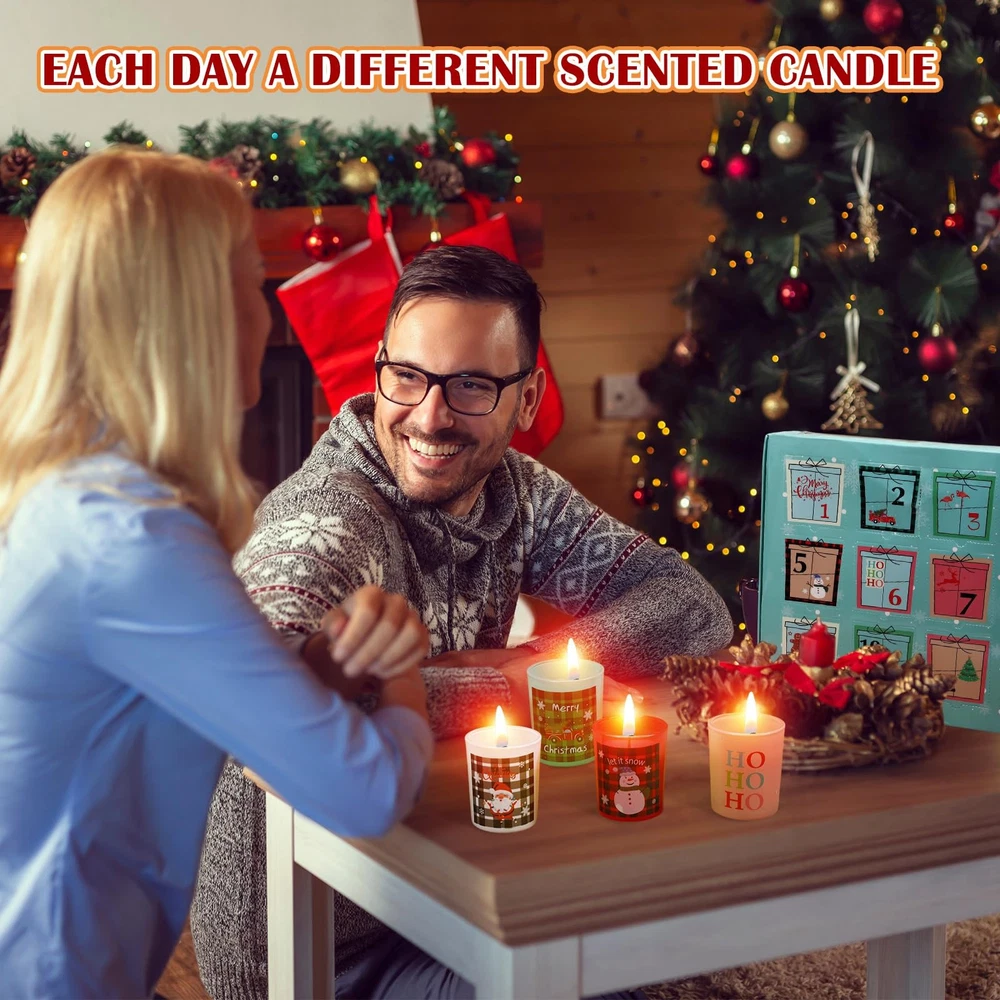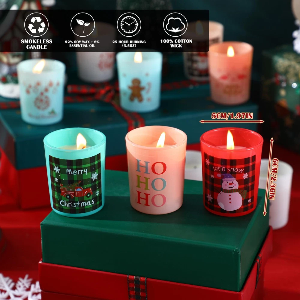 Features: Long lasting brilliance: Enjoy the slowly aromas and the flickering lights as each of these wax jar candles from our Christmas candle set ensures long time burning, marking every moment of your 12 day countdown to Christmas. SPA day everyday: Besides decorating your environment, these scented candles gifts from our Christmas set can also enhance your yoga, sleep, and SPA bathing experiences as you immerse in their tranquil scents and serene ambiance. Specifications: Material: soy wax and cotton wicks Color: colorful Size: about 1.97 x 2.36 inches/ 5 x 6 cm Capacity: about 2.5 ounces Package includes: 12 x Christmas candles gift Notes: Manual measurement, please allow slight errors in size. The color may exist with a slight difference due to different screen displays. 12 Scents: providing a pleasant ambiance and a sensory experience with various scents, like lavender, rose, sea salt, sage, grapefruit, vanilla, apple cider, bergamot, and more, these soy wax jar candles can ease your mind, reduce fatigue, and relax body Quality Material: our 12 days Christmas scented candles gift set is made of soy wax and cotton wicks; Each 2.5 oz wax jar candle burns for about 15 hours; Combined with natural essential oils, they create a comfortable, soothing and romantic atmosphere Proper Sized: with a size of about 1.97 x 2.36 inches/ 5 x 6 cm, these scented candles gifts are ideal for placement on desktops, windowsills, sinks, and more, and can add a charming appeal to bathrooms, offices, therapy rooms, and yoga studios Adventurous Countdown: our advent calendar candle gift has 12 compartments, each reveals a delightful candle with a surprise scent and pattern; This jar candles countdown gift provides not just a daily candle but a daily surprise for a holiday ritual Ideal Festive Gift: this 12 days Christmas scented candles gift set serves as an ideal holiday surprise for family, friends, and neighbors; Add to their anticipation for Xmas with our advent calendar candle gift, as they light up a fresh candle every day