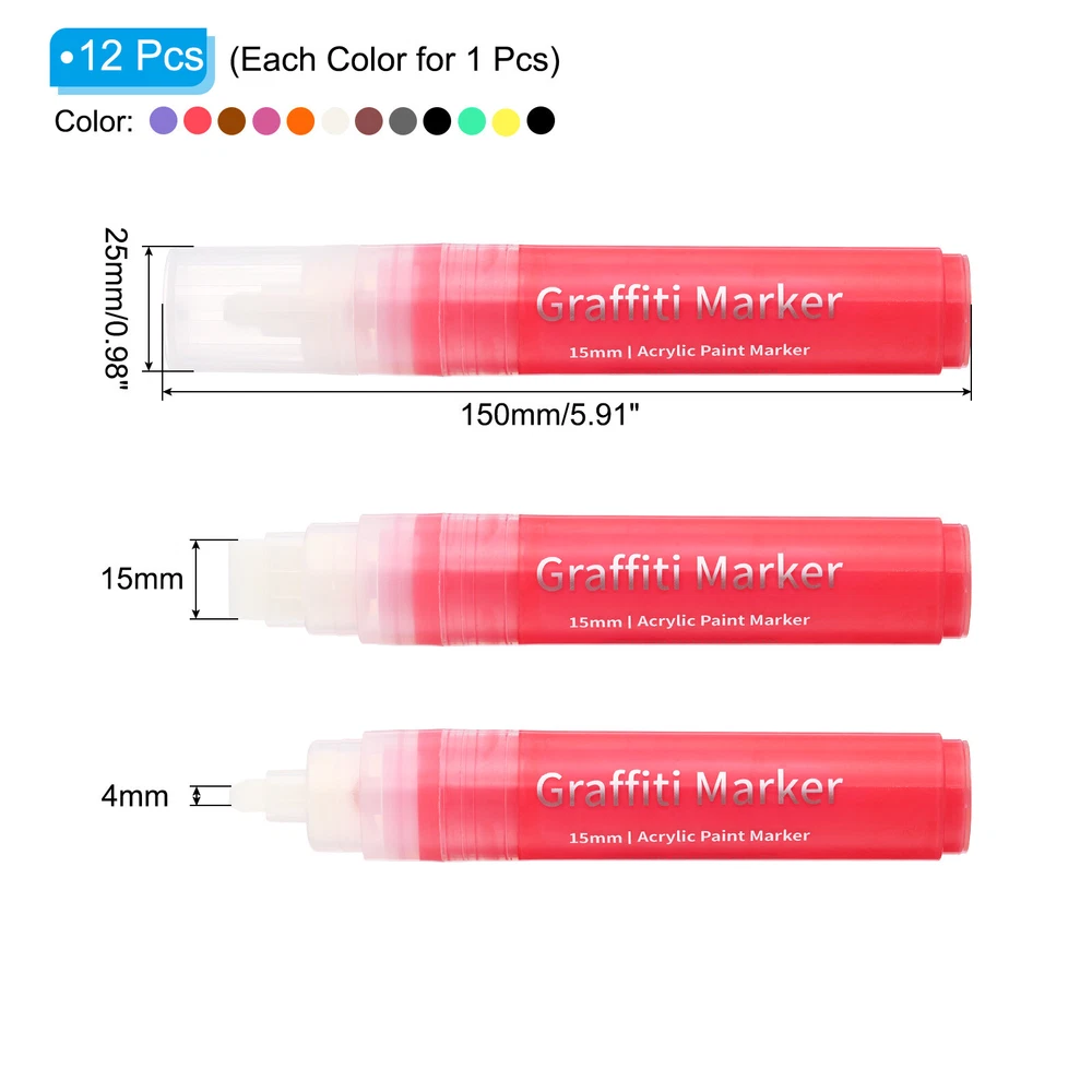 Document The various thick markers are vibrant brightly colored and suitable for DIY design, arts and craft projects. Can be used on rock painting, paper, posters, signs, canvas, wood, metal, walls, glass, clothes, ceramics, murals, stone, mug, plastic, 3d prints, DIY crafts art supplies and a variety of surfaces. Can be given as a gift to artists, graffiti enthusiasts, craftsmen, designers, etc.Specification: material: plasticSize: 15x2.5cm / 5.9x1 inchPen size: 15x4mm / 0.59x0.16 inchPackage list: 12pcs markers (1pcs for each color)Advantage: The thick acrylic paint markers are brightly colored, easy to use, dry quickly, and work well even on dark paper. The 15mm thick felt tip marker large areas evenly and smoothly without skipping or breakage. The paint flows well with no extra drips and pool, making it perfect for creating larger pieces of art.Instruction: 1. You need to shake the ink well before use, and then press the top firmly until the white tip is filled with color paint. 2. Press gently when writing to help the ink flow. Acrylic paint dries and can be left on a variety of surfaces. 3. It can be cleaned or wiped with water when it is wet.NOTE: Once the permanent marker is activated, secure the cap when not in use and keep the marker tip up at all times. 12 Pcs Graffiti Markers 15mm 12 Colors Poster Markers Thick Acrylic Paint Pen The various thick markers are vibrant brightly colored and suitable for DIY design, arts and craft projects. Can be used on rock painting, paper, posters, signs, canvas, wood, metal, walls, glass, clothes, ceramics, murals, stone, mug, plastic, 3d prints, DIY crafts art supplies and a variety of surfaces. Can be given as a gift to artists, graffiti enthusiasts, craftsmen, designers, etc. Specification: material: plastic Size: 15x2.5cm / 5.9x1 inch Pen size: 15x4mm / 0.59x0.16 inch Package list: 12pcs markers (1pcs for each color) Advantage: The thick acrylic paint markers are brightly colored, easy to use, dry quickly, and work well even on dark paper. The 15mm thick felt tip marker large areas evenly and smoothly without skipping or breakage. The paint flows well with no extra drips and pool, making it perfect for creating larger pieces of art. Instruction: 1. You need to shake the ink well before use, and then press the top firmly until the white tip is filled with color paint. 2. Press gently when writing to help the ink flow. Acrylic paint dries and can be left on a variety of surfaces. 3. It can be cleaned or wiped with water when it is wet. NOTE: Once the permanent marker is activated, secure the cap when not in use and keep the marker tip up at all times. Hot Item Payment 1.We accept eBay payment . 2.Payment must be received within 7 business days of auction closing. Shipping 1.We ship to your eBay or Paypal address. Please make sure your eBay and Paypal address is correct before you pay. 2.Items will be shipped within 1-3 business day when we received payment. 3.Delivery time depends on destination and other factors. Description Policy 12 Pcs Graffiti Markers 15mm 12 Colors Poster Markers Thick Acrylic Paint Pen The various thick markers are vibrant brightly colored and suitable for DIY design, arts and craft projects. Can be used on rock painting, paper, posters, signs, canvas, wood, metal, walls, glass, clothes, ceramics, murals, stone, mug, plastic, 3d prints, DIY crafts art supplies and a variety of surfaces. Can be given as a gift to artists, graffiti enthusiasts, craftsmen, designers, etc. Specification: material: plastic Size: 15x2.5cm / 5.9x1 inch Pen size: 15x4mm / 0.59x0.16 inch Package list: 12pcs markers (1pcs for each color) Advantage: The thick acrylic paint markers are brightly colored, easy to use, dry quickly, and work well even on dark paper. The 15mm thick felt tip marker large areas evenly and smoothly without skipping or breakage. The paint flows well with no extra drips and pool, making it perfect for creating larger pieces of art. Instruction: 1. You need to shake the ink well before use, and then press the top firmly until the white tip is filled with color paint. 2. Press gently when writing to help the ink flow. Acrylic paint dries and can be left on a variety of surfaces. 3. It can be cleaned or wiped with water when it is wet. NOTE: Once the permanent marker is activated, secure the cap when not in use and keep the marker tip up at all times. Hot Item Payment 1.We accept eBay payment . 2.Payment must be received within 7 business days of auction closing. Shipping 1.We ship to your eBay or Paypal address. Please make sure your eBay and Paypal address is correct before you pay. 2.Items will be shipped within 1-3 business day when we received payment. 3.Delivery time depends on destination and other factors.