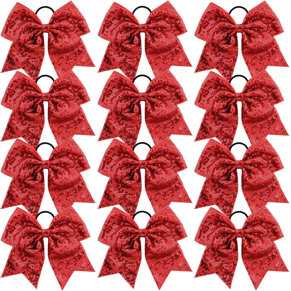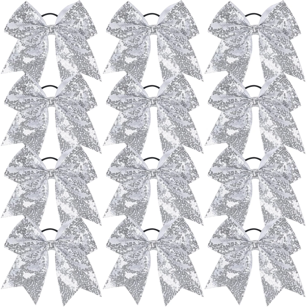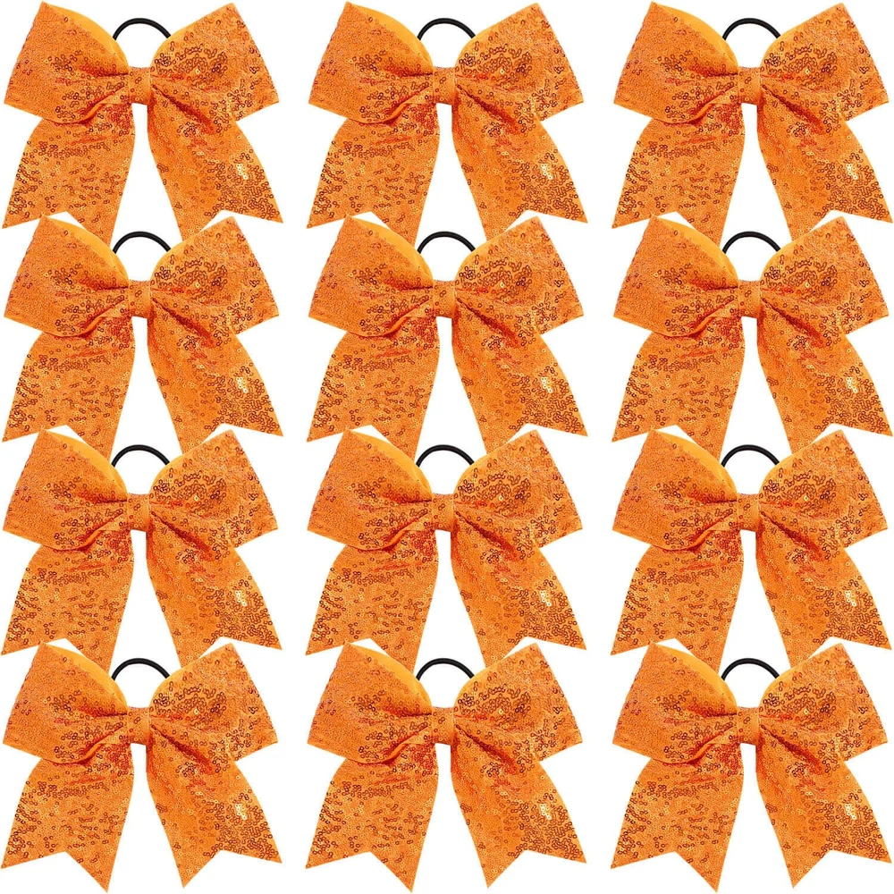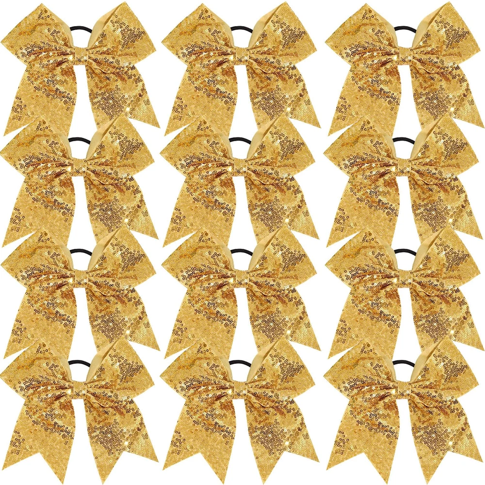 Package include: 12 pieces gold hair bows ties, each bow measures 18 cm/ 7 inch in length; Cute and fashionable hair accessory for girls and ladies to wear. Stretchy and stable: the cheer hair bows are made of a 3-inch wide sequin ribbon with a sturdy elastic rubber hair band, covered with fabric to prevent damage, can hold your hair firmly in place. Easy and comfortable to wear: the back of the cheerleading bow is designed with a durable elastic band that fits easily; And you don't have to worry about losing accessories, the sporty bow has good adhesion and won't get stuck or tangled on your hair, giing you a comfortable wear feeling. Match many outfits: the jumbo cheer hair bows are great for team cheer competitions, tournaments, photography, party, festival or any other special events; Also great for everyday use, wear them to school, pair them with dresses, jeans and T-shirts, backpacks and lockers decoration, Christmas tree ornament, etc. Great for school spirit: the school spirit shines bright with these ponytail bows, they can be easily attached to a ponytail with a wrapped elastic hair tie, allowing you to jump and cheer to your heart's content without fear of losing your bow; A great option for cheer camp, practice, or every day use. These shiny hair scrunchies is fashionable, durable,elastic comfortable, can match for show, gym dance,party,scrunchies, make you charming, perfect gift for youself or your friends and families. Specifications: Material: Shiny fabric and durable elastic band 12 Pcs fashion style hair ties