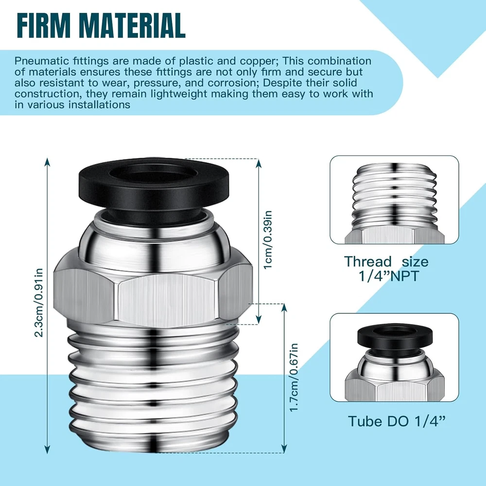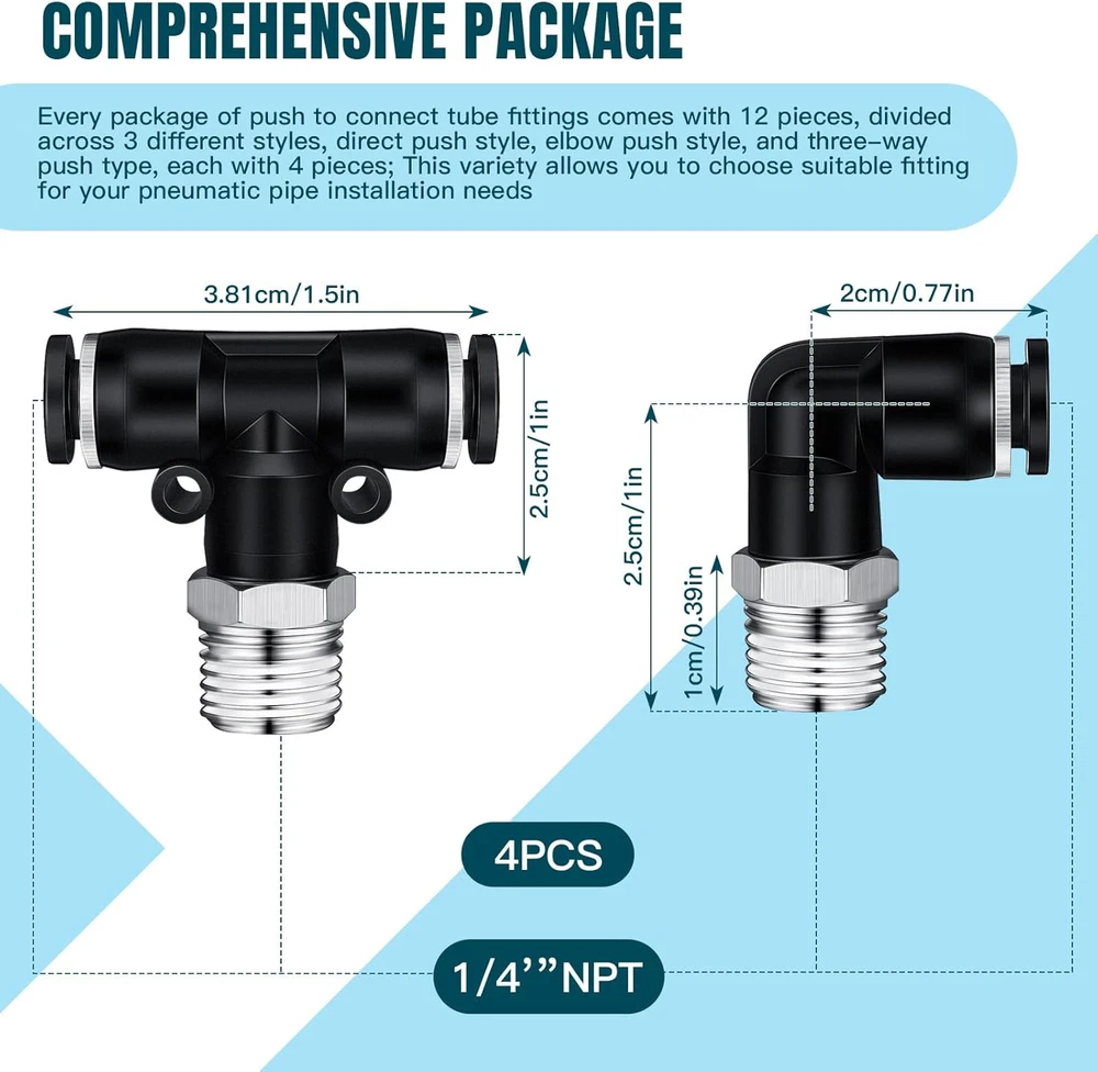 Store New Arrivals Add to Favorite View Feedback Contact 12 Pcs Push to Connect Fittings 1/4 Inch Tube OD X 1/4 NPT Air Line Pneumatic Description Item model number XIE-Yaocom-586 Part Number XIE-Yaocom-586 Batteries Required? No Size 1/4 NPT Item Package Quantity 12 Color Silver Brand Yaocom Material Plastic Country of Origin China Connector Type Elbow Item Weight 0.18 Kilograms Thread Type NPT Number of Pieces 12 Exterior Finish Copper Package Dimensions 4.65 x 3.39 x 0.67 inches Thread Size 0.25 inch Manufacturer Yaocom Comprehensive Package: every package of push to connect tube fittings comes with 12 pieces, divided across 3 different styles, direct push style, elbow push style, and three-way push type, each with 4 pieces; This variety allows you to choose suitable fitting for your pneumatic pipe installation needs Firm Material: pneumatic fittings are made of plastic and copper; This combination of materials ensures these fittings are not only firm and secure but also resistant to wear, pressure, and corrosion; Despite their solid construction, they remain lightweight making them easy to work with in various installations Ease of Installation and Removal: installing or removing these tube connectors is a breeze; One end of the fitting features a push pipe connection, while the other has an external thread; This design makes it easy to fit a hose or pipe into the fitting Multiple Application: whether intended for pipe, air or vacuum systems, push to connect fittings are suitable for various pipe applications; Their quality build and easy installation make them a suitable choice for both professional and DIY pipe installation projects Reliable Operating Conditions: 1/4 push to connect fittings are designed to function optimally within a wide range of conditions, operate efficiently within temperatures between 32 and 140 degrees Fahrenheit (0-60 degrees Celsius) and pressures ranging from 0 to 159 psi or 0 to 1mpa; These parameters make them a reliable choice for various plumbing installations Features: Size for versatile use: With a size of 1/4 Inch OD x 1/4 NPT, tube fittings make an ideal choice for varied pipe installations. They fit into different pipe sizes, contributing to their wide range of applications, making them quite versatile. Stylish aesthetic: Air hose fitting comes in a stylish combination of silver and black, making them a visually appealing choice for your plumbing systems. Although they serve a functional role, their finish ensures they contribute positively to the appearance of your plumbing installation. Specifications: Material: plastic, copper Color: silver, black Size: 1/4 Inch OD x 1/4 NPT Package includes: 12 x Push to connect tube fittings Notes: Manual measurement, please allow slight errors on size. The color may exist a slight difference due to different screen displays. Small items may include, please keep them away from little children. ABOUT US We offer the best prices around on high quality products. Our E-store includes media such as books, movies, music and games while offering electronics, toys, sporting apparel, clothing, tools, general home, garden items and more. SHIPPING We are always working hard to ensure your package arrives as soon as possible. Please understand that some factors like weather, high postal traffic, and the performance of shipping companies are outside of our control. We offer free shipping to the lower 48 states and ship within 2 business days of payment, usually sooner. We do not accept P.O. Boxes. Please provide a physical address. RETURNS We offer a 30-Day Return Policy on items which you are not completely satisfied with. You have the option for a full-refund or an exchange of the item. No returns are available on items shipped outside of the USA. PAYMENT We accept PayPal. CONTACT US This page content is yet to come Please ad us to your favorite seller and visit again later Thank You CUSTOMER SATISFACTION We try our very best to make sure every customer is completely satisfied. If there's a problem, message us! We're happy to help.