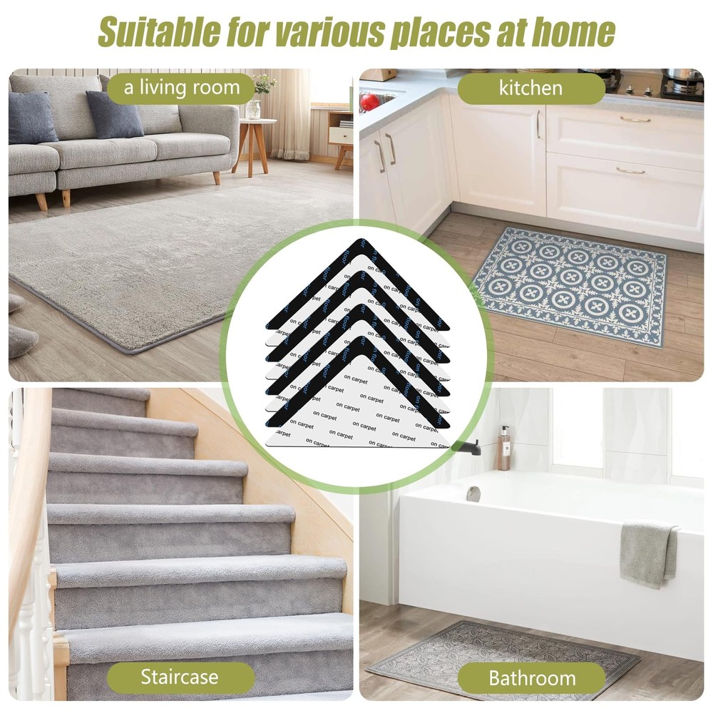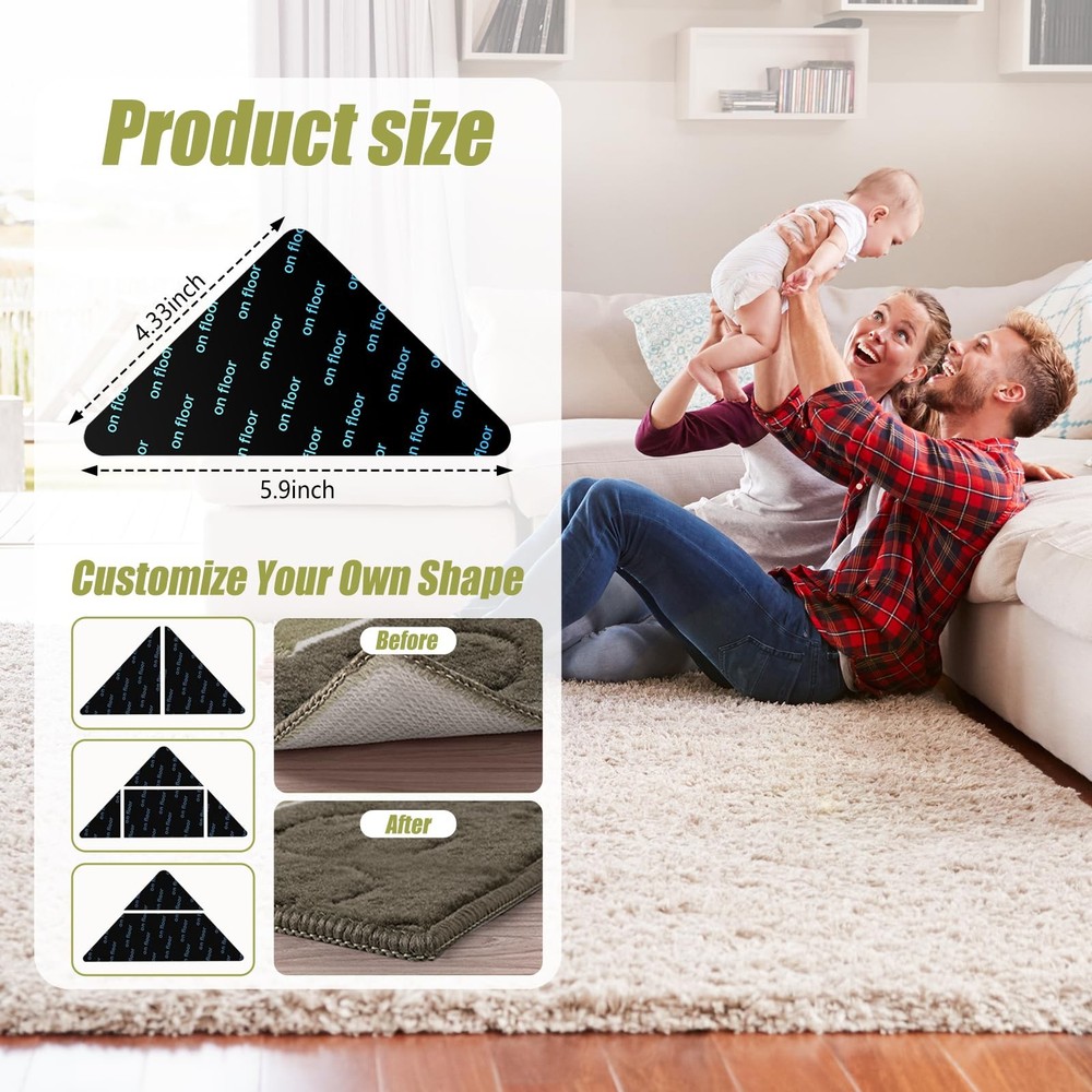 12 Pcs Rug Tape, Non Slip Carpet Tape for Hardwood Floors, 12, Black Description Features: Ultra-Thin with Instant & Strong Grip : Measuring only 0.04-inch thick, these rug stickers feature industrial-grade adhesive and an advantaged triangle design that maximizes contact surface. They secure rugs instantly on hardwood, tile, marble, and concrete floors, preventing curling corners and keeping rugs steady—ideal for homes with pets/children or busy offices. 12 Reusable Sheets in Perfect Size : The 12-pack includes 5.72”x4.13” sheets, which can be cut freely or used full-size. Suitable for large area rugs, entryway mats, and delicate carpets, offering flexibility for various rug types and sizes. Zero Residue & Floor Protection : Made with hypoallergenic PU adhesive, these grippers remove cleanly without leaving scratches, sticky marks, or damage. Safe for vintage floors, epoxy coatings, and polished surfaces, ensuring your floors stay pristine. Washable, Eco-Friendly & Usage Notes : Rinse with water, air dry, and reuse over 100 cycles, saving costs vs. disposable tapes (use rubbing alcohol for better adhesion restoration). Works on hardwood, tile, concrete, and marble, but avoid jute/rubber-backed rugs, low-pile carpets, fluff-backed rugs, or rugs over carpet. Product Details: Handling We will ship all orders within 3 business day of payment. Delivery We Do Not Ship Outside of the Continental US. Return Policy All items qualify for returns within 30 days of receipt. Buyer is responsible for return shipping on any item that is not damaged. Feedback We take our reputation seriously, we buy and sell online, so we understand the value of trust. If you are unsatisfied with your order, please contact us and we will work with you to resolve it to your satisfaction.