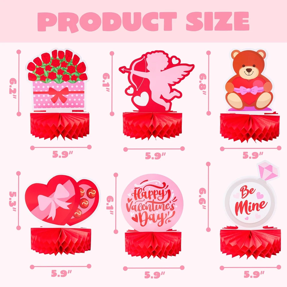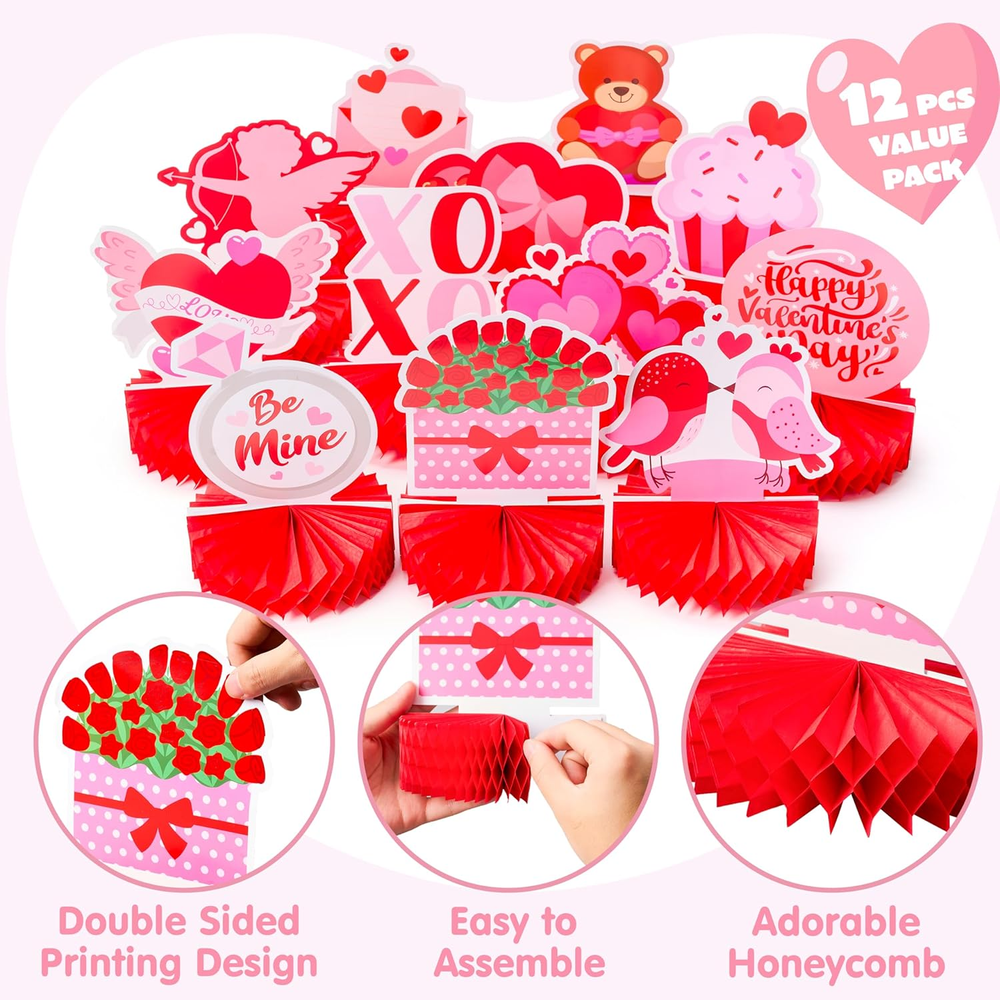 Store New Arrivals Add to Favorite View Feedback Contact Fast deliveries to the customer's home Quality customer service John Make the customers happy! 12 Pcs Valentine'S Day Honeycomb Centerpieces, Table Decorations with Red Pink Heart Bear , Centerpieces Decor for Kids Birthday Valentine'S Day Party Supplies Description ADORABLE VALENTINE DECOR: Crafted with love and care, these centerpieces feature 12 charming designs, adding a touch of whimsy and warmth to your party setting. PREMIUM PAPER MATERIAL: Made from high-quality paper, our centerpieces are durable, lightweight, —ensuring a perfect blend of style and sustainability. KID-FRIENDLY PARTY SUPPLIES: Thoughtfully designed for kids, these centerpieces captivate young hearts, making them an ideal addition to your Valentine's Day celebration. EASY SETUP AND STORAGE: Effortlessly unfold and set up these honeycomb centerpieces, creating an instant festive vibe. Plus, they're compact for easy storage until the next celebration. VERSATILE PARTY DECORATION: Beyond Valentine's Day, reuse or repurpose these versatile centerpieces for birthdays, baby showers, and other joyful occasions. Product description Manufacturer Minimum Age (MONTHS) 36.00 Item dimensions L x W x H 9.45 x 8.26 x 1.18 inches Unit Count 12.0 Count Color Red Product Dimensions 9.45 x 8.26 x 1.18 inches Material Paper Global Trade Identification Number 00840332622095 Item Weight 8.1 ounces Theme Love Manufacturer recommended age 3 years and up Age Range (Description) Kid Manufacturer Maximum Age 1188.0 Occasion Valentine's day Manufacturer US CORP ABOUT US We offer the best prices around on high quality products. Our E-store includes media such as books, movies, music and games while offering electronics, toys, sporting apparel, clothing, tools, general home, garden items and more. SHIPPING We are always working hard to ensure your package arrives as soon as possible. Please understand that some factors like weather, high postal traffic, and the performance of shipping companies are outside of our control. We offer free shipping to the lower 48 states and ship within 2 business days of payment, usually sooner. We do not accept P.O. Boxes. Please provide a physical address. For shipping outside of the continental USA, we only use eBay's Global Shipping Program. The item is shipped to KY and then sent to the rest of the world. International customers are responsible for all duties and taxes. Continue to 'check out' to calculate costs for shipping the item to your country. Messages regarding eBay's Global Shipping Program MUST be directed at eBay EXCLUSIVELY. RETURNS We offer a 30-Day Return Policy on items in which you are not completely satisfied with. You have the option of a full-refund or an exchange of the item. No returns are available on items shipped outside of the USA PAYMENT We accept PayPal. CONTACT US This page content is yet to come Please ad us to your favorite seller and visit again later Thank You CUSTOMER SATISFACTION We try our very best to make sure every customer is completely satisfied. If there's a problem, message us! We're happy to help. WE ACCEPT