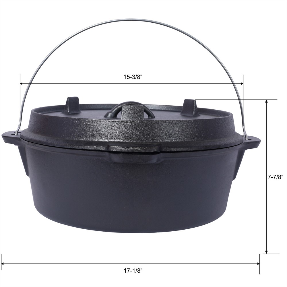 Crafted to endure the harshest of outdoor conditions, this is a camping essential. Whether you're simmering a hearty stew over an open campfire, baking a delicious cobbler in hot coals, or slow-cooking a savory meal during your wilderness escapades, this Dutch oven's excellent heat retention and even distribution ensure culinary success every time. It's the ultimate companion for creating unforgettable camping feasts. Features: Crafted to endure the harshest of outdoor conditions, this is a camping essential. Whether you're simmering a hearty stew over an open campfire, baking a delicious cobbler in hot coals, or slow-cooking a savory meal during your wilderness escapades, this Dutch oven's excellent heat retention and even distribution ensure culinary success every time. It's the ultimate companion for creating unforgettable camping feasts. The Dutch oven's ingeniously designed lid is a true marvel of functionality. Fitted with sturdy legs, it seamlessly transforms into a skillet or griddle, unlocking a whole new realm of culinary possibilities during your camping trips. Whether you're craving crispy bacon for breakfast, searing succulent steaks for dinner, or flipping fluffy pancakes under the open sky, this dual - purpose lid has you covered. Designed with convenience at its core, this cast iron Dutch oven features a robust built-in carrying handle, enabling you to effortlessly tote it from your vehicle to the campsite. Moreover, the oven can be securely suspended from a tripod stand on level surfaces, providing you with unparalleled flexibility in your cooking setup. With its seamless combination of portability and adaptability, this Dutch oven is the ultimate companion for any outdoor cooking enthusiast. Your well-being and convenience are our top priorities. That's why we include a specialized dutch oven lid lifter, engineered to ensure a secure and hassle - free experience when handling hot lids. This essential accessory minimizes the risk of burns and accidental spills, allowing you to confidently maneuver the lid while cooking. It's a thoughtful addition that enhances your outdoor cooking adventure, giving you peace of mind with every use. Product Dimensions Assembled Length (in.): 15.30 Assembled Width (in.): 17.00 Assembled Height (in.): 7.80 Product Weight (lbs.): 30.20 Package Size Length (in.): 16.50 Width (in.): 16.30 Height (in.): 8.70 Weight (lbs.): 32.20