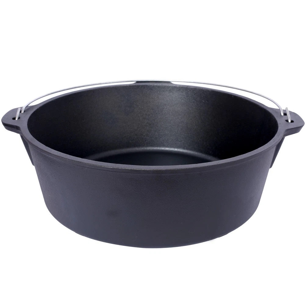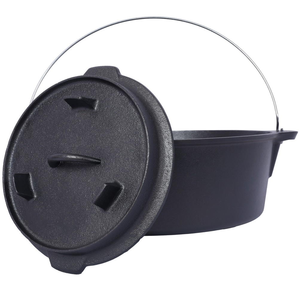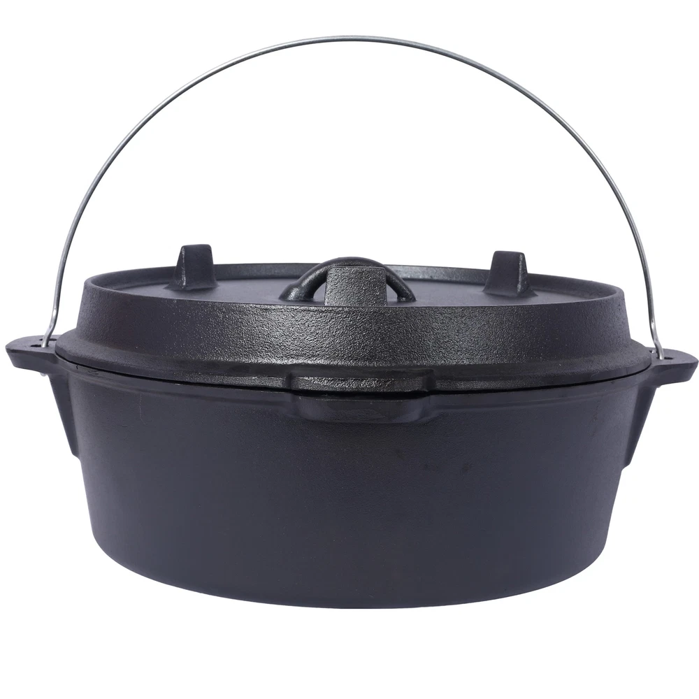 12 Quart Pre-Seasoned Cast Iron Dutch Oven wSkillet Lid,Outdoor Camping Deep Pot Features Crafted to endure the harshest of outdoor conditions, this is a camping essential. Whether you're simmering a hearty stew over an open campfire, baking a delicious cobbler in hot coals, or slow-cooking a savory meal during your wilderness escapades, this Dutch oven's excellent heat retention and even distribution ensure culinary success every time. It's the ultimate companion for creating unforgettable camping feasts. The Dutch oven's ingeniously designed lid is a true marvel of functionality. Fitted with sturdy legs, it seamlessly transforms into a skillet or griddle, unlocking a whole new realm of culinary possibilities during your camping trips. Whether you're craving crispy bacon for breakfast, searing succulent steaks for dinner, or flipping fluffy pancakes under the open sky, this dual - purpose lid has you covered. Designed with convenience at its core, this cast iron Dutch oven features a robust built-in carrying handle, enabling you to effortlessly tote it from your vehicle to the campsite. Moreover, the oven can be securely suspended from a tripod stand on level surfaces, providing you with unparalleled flexibility in your cooking setup. With its seamless combination of portability and adaptability, this Dutch oven is the ultimate companion for any outdoor cooking enthusiast. Your well-being and convenience are our top priorities. That's why we include a specialized dutch oven lid lifter, engineered to ensure a secure and hassle - free experience when handling hot lids. This essential accessory minimizes the risk of burns and accidental spills, allowing you to confidently maneuver the lid while cooking. It's a thoughtful addition that enhances your outdoor cooking adventure, giving you peace of mind with every use.