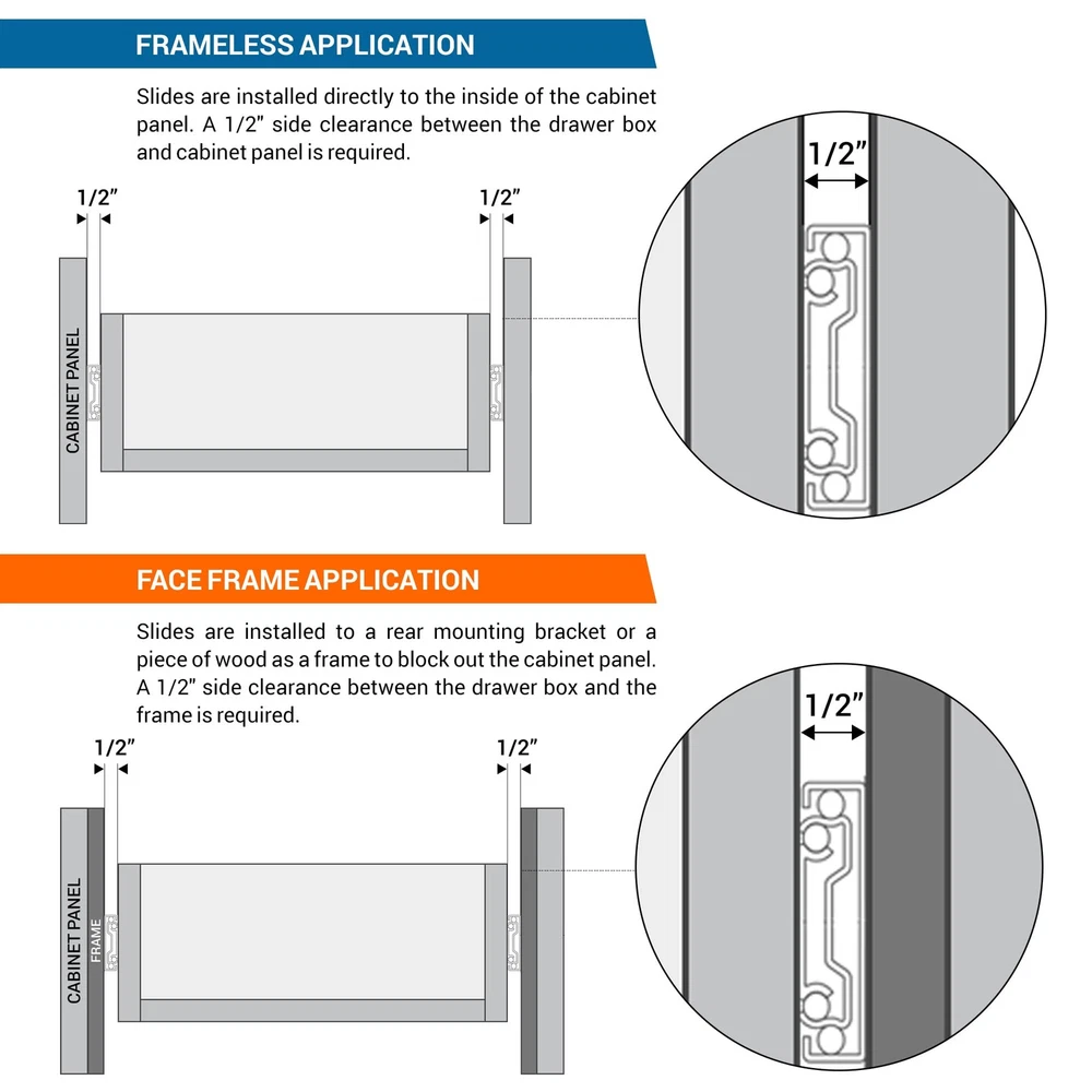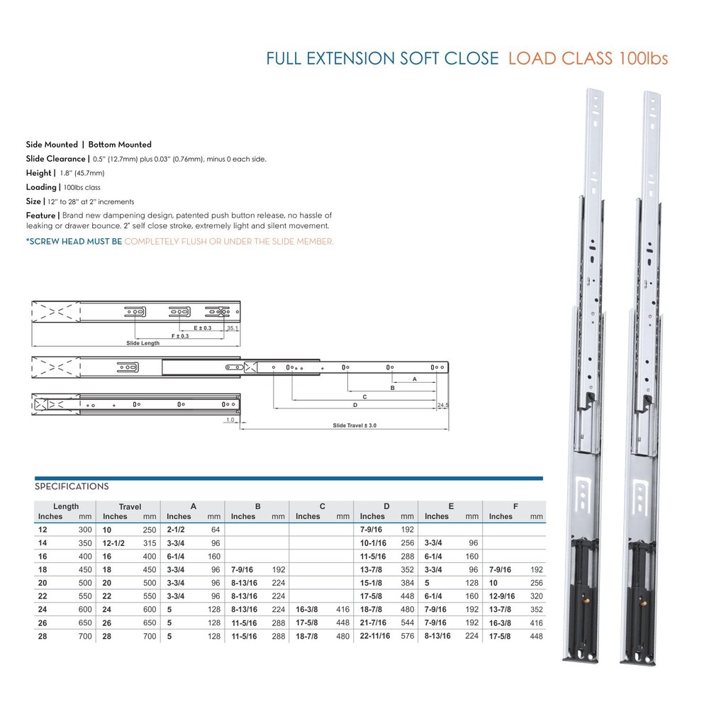 Note: Although technically 'full extension' slides by design, 12" and 14" slides with integrated soft close devices will not provide double the original length when fully extended. This is due to the limitations on member length imposed by the small package and integration of the soft closing mechanism. Actual extended length: 20-5/16". Height: 1-13/16" (45.7mm). Zinc Finish. Requires a 1/2" side spacing per side (Overall 1"). Pull force of 5.5 to 6.5 lbs. Smooth and reliable, this soft close drawer glide is perfect for your job. Hardware provides products with quality that can be both seen and felt! No more slamming drawers with these full extension soft close drawer slides! Soft-close device dampens and absorbs force, causing it to close slowly and quietly. Extremely light with a 2" soft close stroke. Pull force of 5.5 to 6.5 lbs Requires a 1/2" side spacing per side (Overall 1"); Includes: 2 Slides and Mounting Screws 12" Slide provides 10" of travel; 12" Slide actual slide length = 11-7/8"