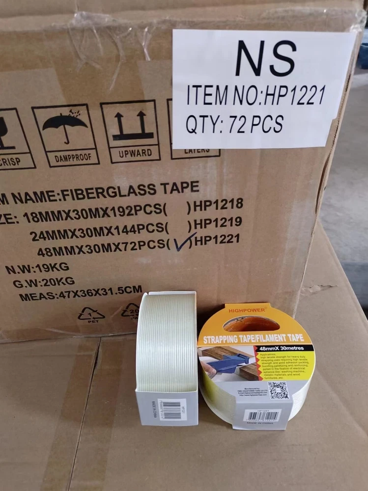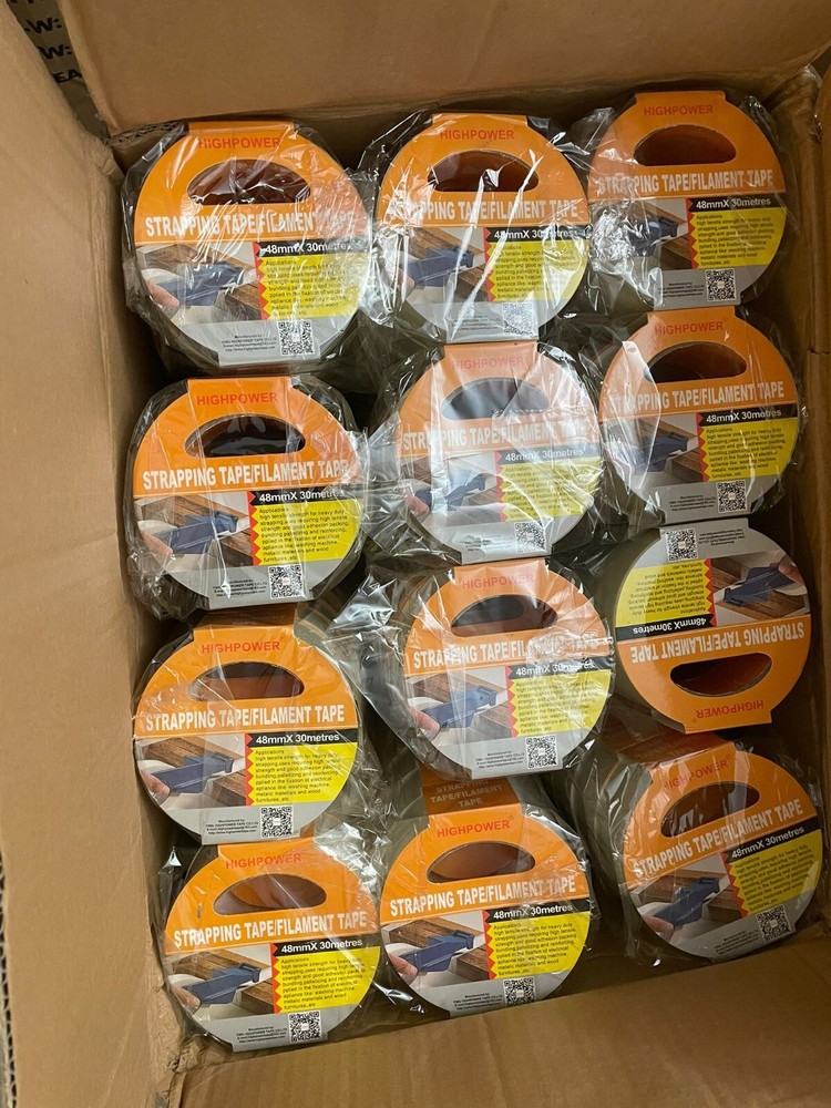 Product Description : Filament Tape is a fiberglass reinforced polypropylene rubber based pressure sensitive strapping tape with a 69 oz/in. adhesion, 4.0% elongation, and 3 in. neutral core. It is used for packaging, palletizing, and unitizing applications. Appl ications : Uses for the Heavy-Duty Tape include: Box closing and sealing - Reinforcing - Packaging - Carton sealing - Bundling operations - Holding - Strapping - General bundling and tabbing/seaming in the metal fabricating industry. Size : 2"(48MM) X 30M (100 ft) Quantity : 12 Ro lls
