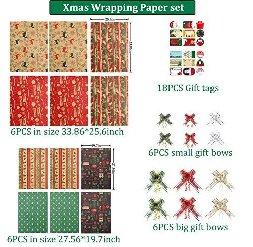 12 Sheets Christmas Wrapping Paper Set(6 Large&6 Small, 59 Sq. Ft. Ttl) with