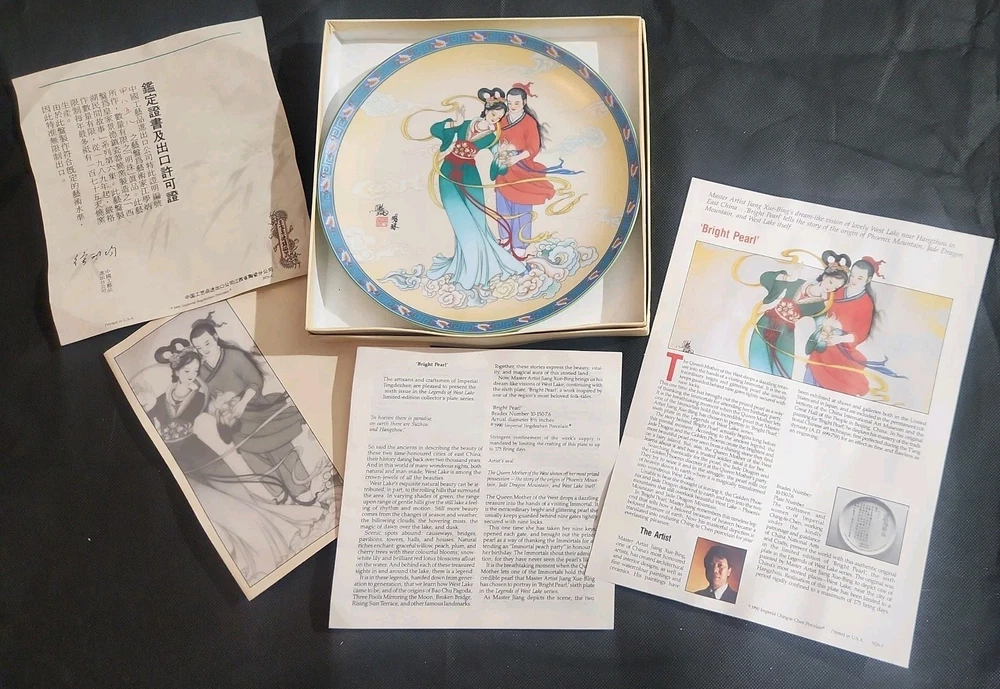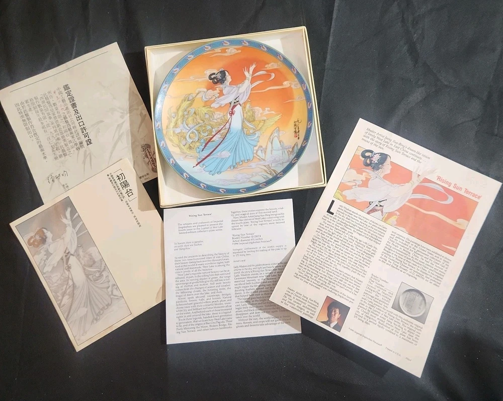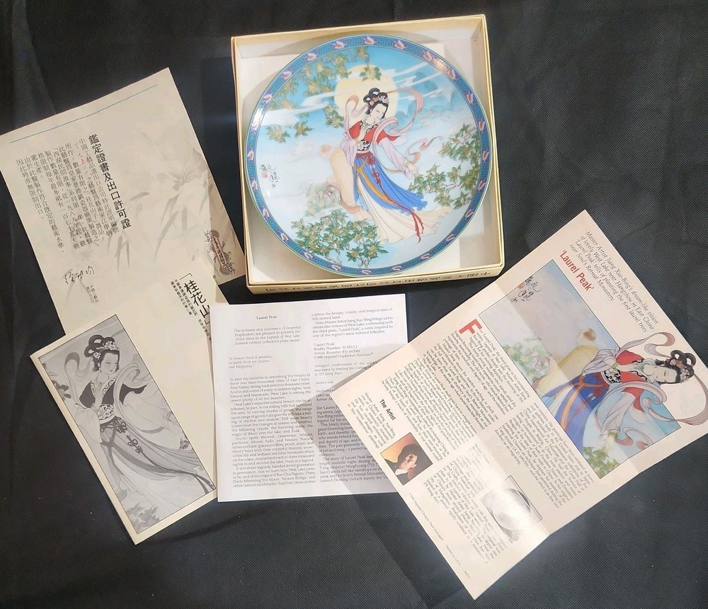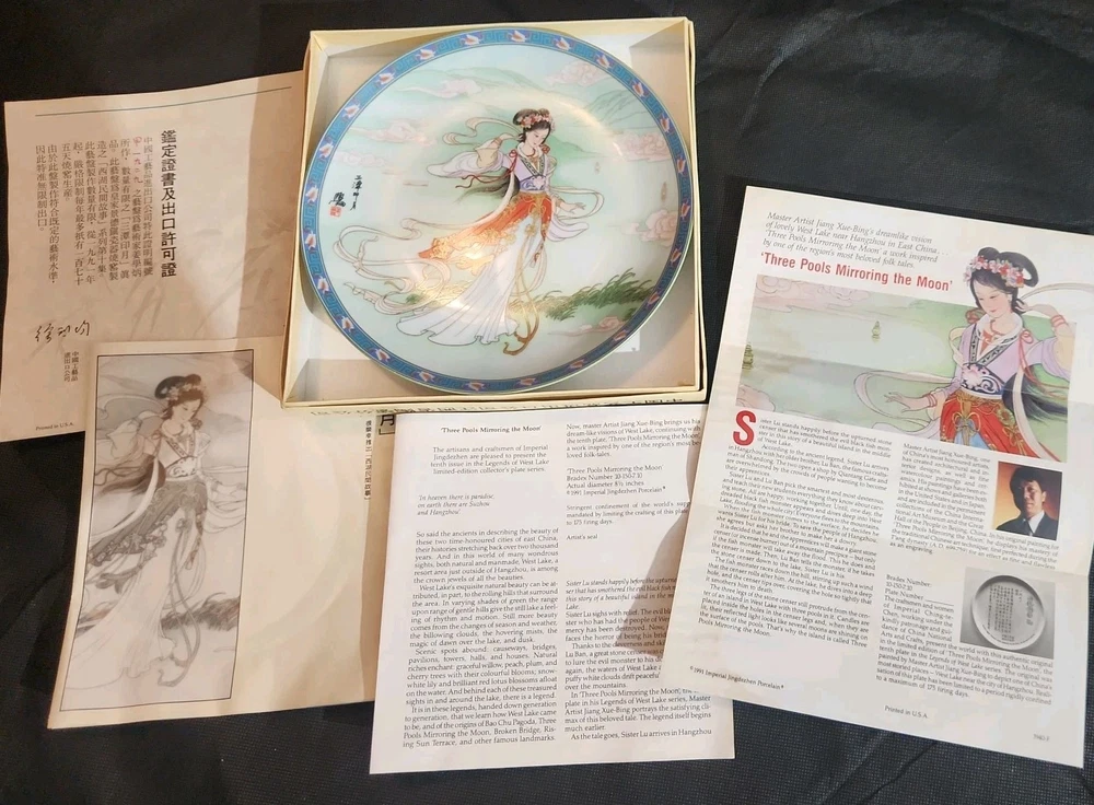 The product is a set of 12 round Imperial Jingdezhen porcelain collector plates from the Legends of West Lake series. These antique vintage decorative plates feature a bordered pattern drawn by the Master Artist Jiang Xue-Bing in full colour on fine Imperial Ching-te Chen porcelain. In this series you will find: Lady White Lady Silkworm Laurel Peak Rising Sun Terrace The Apricot Fairy Bright Pearl Thread of Sky Phoenix Mountain Ancestors of Tea Three Pools Mirroring the Moon Fly-in Peak and Case of the Folding Fans. Each depicting scenes from West Lake in China. Each plate comes with its original box, certificate of authenticity, and informational pamphlet in both English and Chinese which is almost unheard of it is so rare. The set was produced in China in the late 20th century, making it a unique and collectible addition to any display. This is a flawless complete set of all 12 Imperial Jingdezhen Porcelain "Legends of West Lake" plates that have never left their original boxes. Bradex Numbers 10-150-7.1 / 10-150-7.12 Please look at all pictures, some of the boxes and colored informational packets have some discoloration or are not in pristine condition. All plates are in pristine condition.