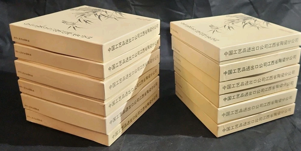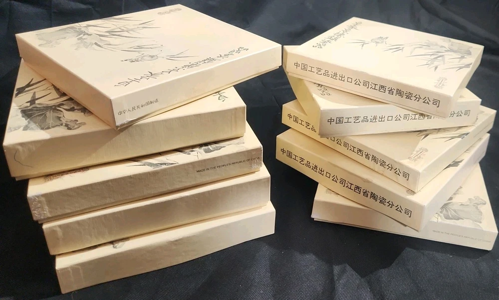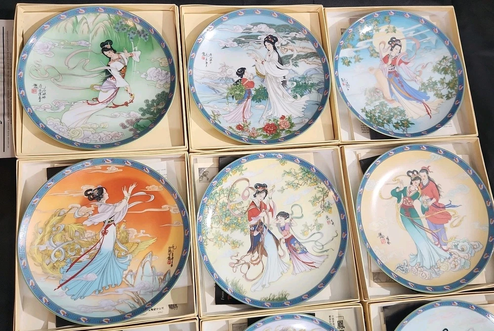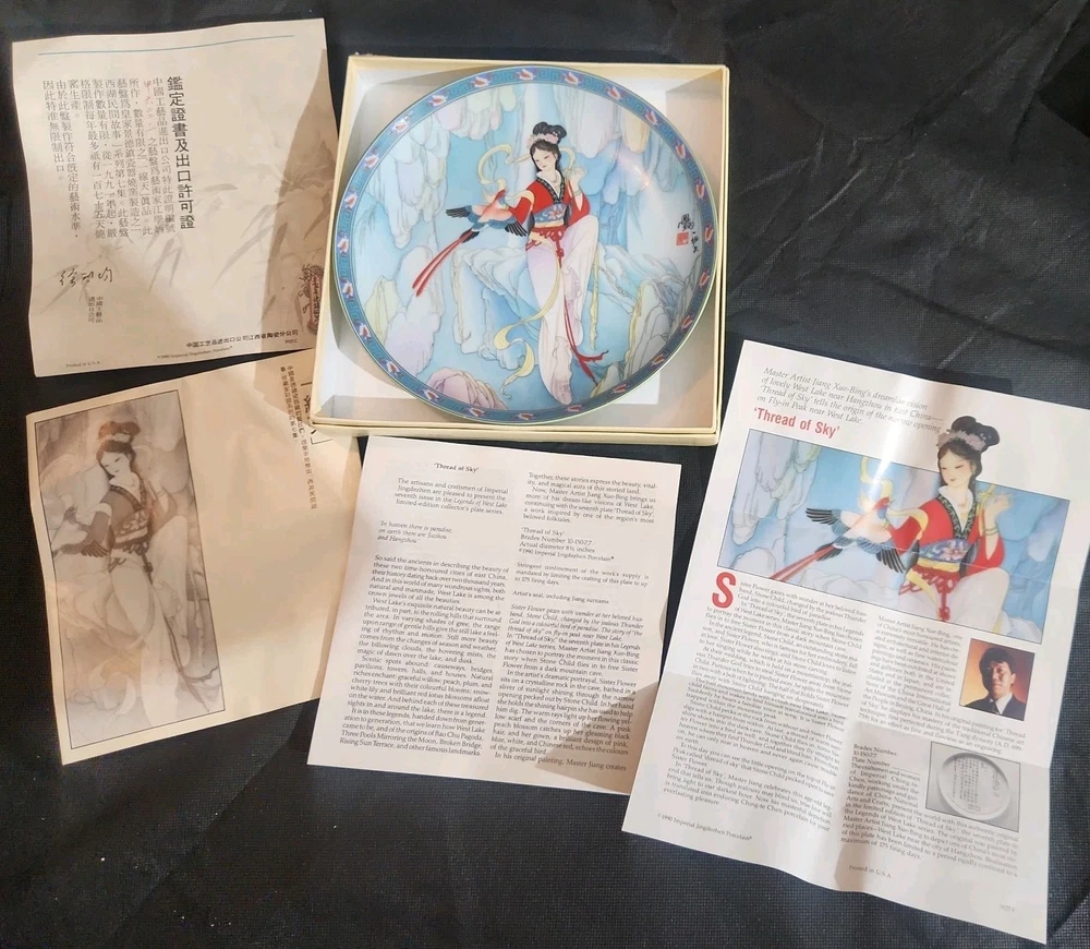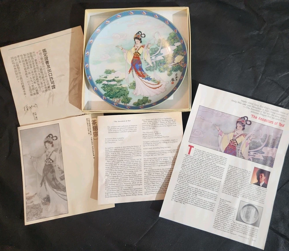 The product is a set of 12 round Imperial Jingdezhen porcelain collector plates from the Legends of West Lake series. These antique vintage decorative plates feature a bordered pattern drawn by the Master Artist Jiang Xue-Bing in full colour on fine Imperial Ching-te Chen porcelain. In this series you will find: Lady White Lady Silkworm Laurel Peak Rising Sun Terrace The Apricot Fairy Bright Pearl Thread of Sky Phoenix Mountain Ancestors of Tea Three Pools Mirroring the Moon Fly-in Peak and Case of the Folding Fans. Each depicting scenes from West Lake in China. Each plate comes with its original box, certificate of authenticity, and informational pamphlet in both English and Chinese which is almost unheard of it is so rare. The set was produced in China in the late 20th century, making it a unique and collectible addition to any display. This is a flawless complete set of all 12 Imperial Jingdezhen Porcelain "Legends of West Lake" plates that have never left their original boxes. Bradex Numbers 10-150-7.1 / 10-150-7.12 Please look at all pictures, some of the boxes and colored informational packets have some discoloration or are not in pristine condition. All plates are in pristine condition.