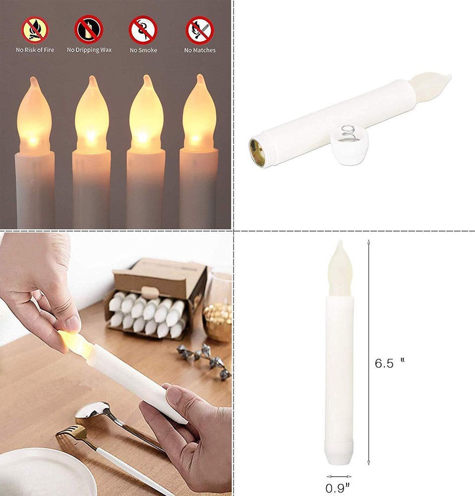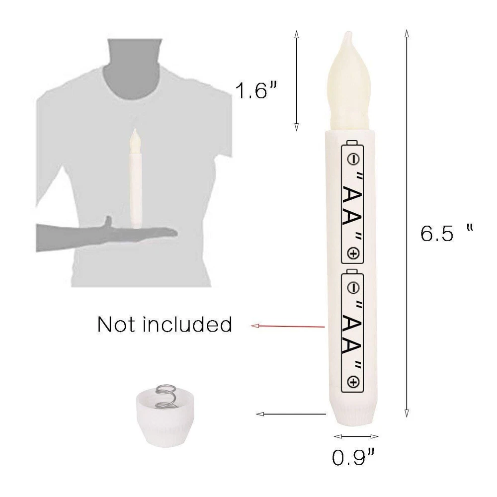 Houdlee Set of 12 LED Flameless Taper Candles - Warm White Flickering Electric Candles for Halloween, Christmas, Parties, and Weddings [Specification] 12 x LED Flickering Taper Candles , Battery NOT Included ,0.79"(2cm)D x 6.5"(16.5cm)H ,Premium Plastic +Led [Realistic Flickering and Safe] Flickering Warm White Lighting, It is so realistic, They're suitable for all kinds of events and can be used outdoors. Absolutely safe for families with pet or children [Long Lasting] Unlike real candles, these flameless pillar candles are made to last; you buy them once, you have them forever. Each Flameless Taper Candles Need 2 AA Battery, When Inserting Battery, Make Sure the Correct Polarity(±),The candles can be powered up to 14 days [Great Choice for Decorations ] These candles are flame-free, smoke-free, and fragrance-free, Incredibly Realistic Flickering Flame, It is Perfect for Wedding Parties, marriage proposal, Thanksgiving, Birthday, Christmas, Churches, Garden, Etc [100% Satisfaction Guarantee] Each candle is thoroughly and rigorously inspected, if you receive defective or accidental damage candle, please email us, you will be offered refunds or replacement Specifications: Product Specifications: * Material Type: Plastic +ABS * Switch: "ON / OFF" controlling, tighten or loose the cap or the head for on/off * Dimension of candles: 0.9" D x 6.5"H (including the bulb head) * Battery of candles: 2xAA batteries (not included) * Soft glow: as nightlights during the dark or in case of power outage in hurricane * Safe: without worrying about burnt whiskers, knocking over candles or the wind blowing out * Great alternative to traditional taper candles who are prohibited in the hotel Perfect using with your candle holders, Candelabra, Sconces, Chandelier or Menorah to decorate your home, table, party, church and performance. If you have any problem, Please don't hesitate to contact us We'll always be happy assist you.We want you to be completely satisfied with your purchase. Shipping We offer FREE shipping on all orders! We ship within Three business days of payment, usually sooner. We use a selection of shipping services such as UPS, FedEx, USPS etc. We only ship to the lower 48 states, no APO/FPO addresses or PO Boxes allowed. Local pickups and combined shipping options are not provided at this time. International buyers – please note: Import duties, taxes, and charges aren't included in the item price or postage cost. These charges are the buyer's responsibility. Please check with your country's customs office to determine what these additional costs will be prior to bidding or buying. Order Cancellation Policy * Order Cancellation Policy ** You can return a product for up to 30 days from the date you purchased it. 1. The seller reserves the right to cancel the special case only due to eBay cancellation fee. 2. The decision of seller is the final. 3. The seller will respond to the cancellation request within 2 business days. Please wait for the result of cancellation. 4. In case the cancellation is not completed by some reasons, the buyer can follow the options below to get the refund. 4.1 The buyer can reject the item when it arrives. 4.2 The buyer can send the item back to the seller within 30 days If the buyer receives item (USA Shipment ONLY). The seller will provide the FREE return label to the buyer when the buyer opens " Return Item" case on eBay by using the reason as "Change my mind" ONLY. 5. When buyer has placed the order. The order will be processed and completed by automatic warehouse system within 5 minutes. In case that buyer sends the cancellation request after 5 minutes of placing the order, the request will be rejected. **Sending direct message to cancel the order is not allowed for every case.* Return Policy - If buyer would like to return the items for refund or replacement, please CONTACT SELLER to receive the free return label from seller. The refund or replacement will be processed with the tracking number of return label which is provided by seller only. The other ways of return which are not approved by seller will not be processed for the refund or replacement. Return You can return a product for up to 30 days from the date you purchased it. Any product you return must be in the same condition you received it and in the original packaging. Please keep the receipt. Payment We accept payment by any of the following methods: eBay Payments Please pay as soon as possible after winning an auction, as that will allow us to post your item to you sooner! Feedback Customer satisfaction is very important to us. If you have any problem with your order, please contact us and we will do our best to make you satisfied. Contact Us If you have any queries, please contact us via ebay. We usually respond within 24 hours on weekdays. Please visit our eBay store to check out other items for sale! Thank you for shopping at our store.