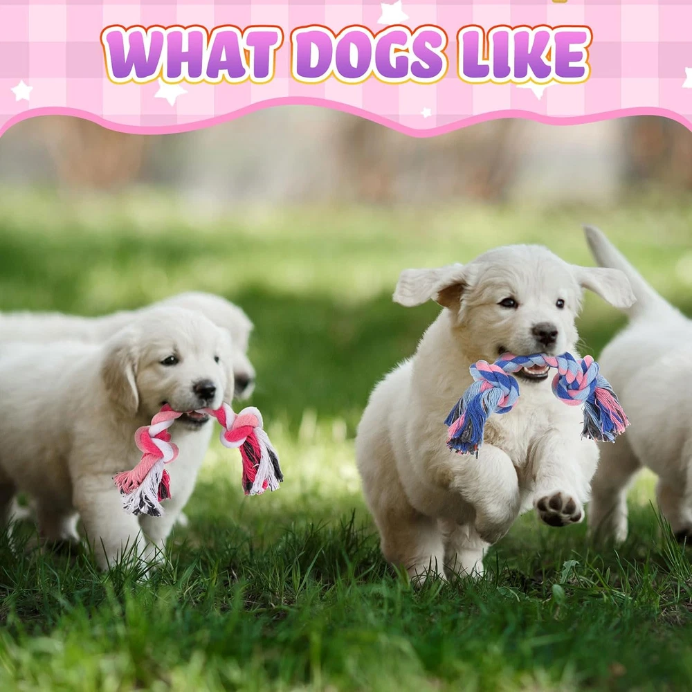 Large Quantity: the package includes 12 pieces of dog rope toys in 4 colors, 3 for each color, designed with 2 knots, sized about 6.69 inches/ 17 cm; The large quantity is enough for your pet's daily chewing and playing needs Safe and Healthy: our rope toys for dogs are made of quality cotton, safe and chewy, keeping dogs teeth healthy by chewing them, suitable for your pets to improve their teeth health Relieving Stress: these rope toys for small dogs are ideal for your dogs to play with, designed for various games such as tugging, throwing and fetching, helping to release your pet's stress Colorful Design: our rope toys for puppies are designed with colors that dog's eyes can recognize, such as blue and yellow, helping your dog to see a colorful world Applied Breeds: these dog ropes are suitable for small and medium breed dogs, can be applied for throwing, chewing, and tugging games; You can take your children to play with your dog, enhancing your relationship Features: Our dog chew rope is suitable for you to train your dog's by throwing and fetching or to keep your dog's teeth health by chewing, making your pet a healthy dog. The package includes 12 pieces of small dog rope toy, so you can use for your own dog and share with your friends who have a pet dog. Specifications: Material: cotton Color: shown as pictures Size: 6.69 inches/ 17 cm Package includes: 12 x Dog ropes Notes: Manual measurement, please allow slight errors on size. The color may exist a slight difference due to different screen displays. Before purchase, confirm whether the product size is suitable for your pet, and observe the pet's reaction when using. Please remove the product in time if there is any discomfort.