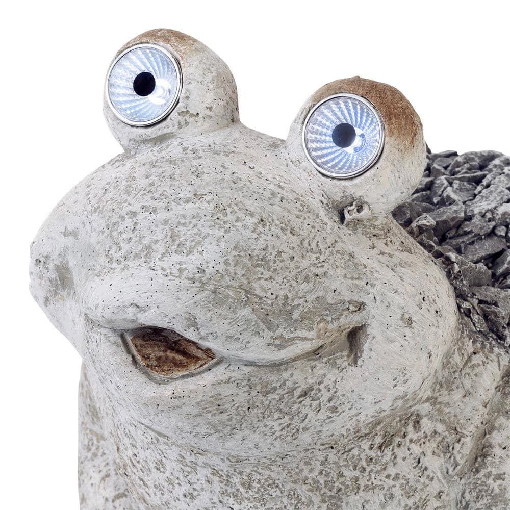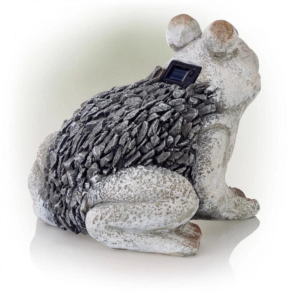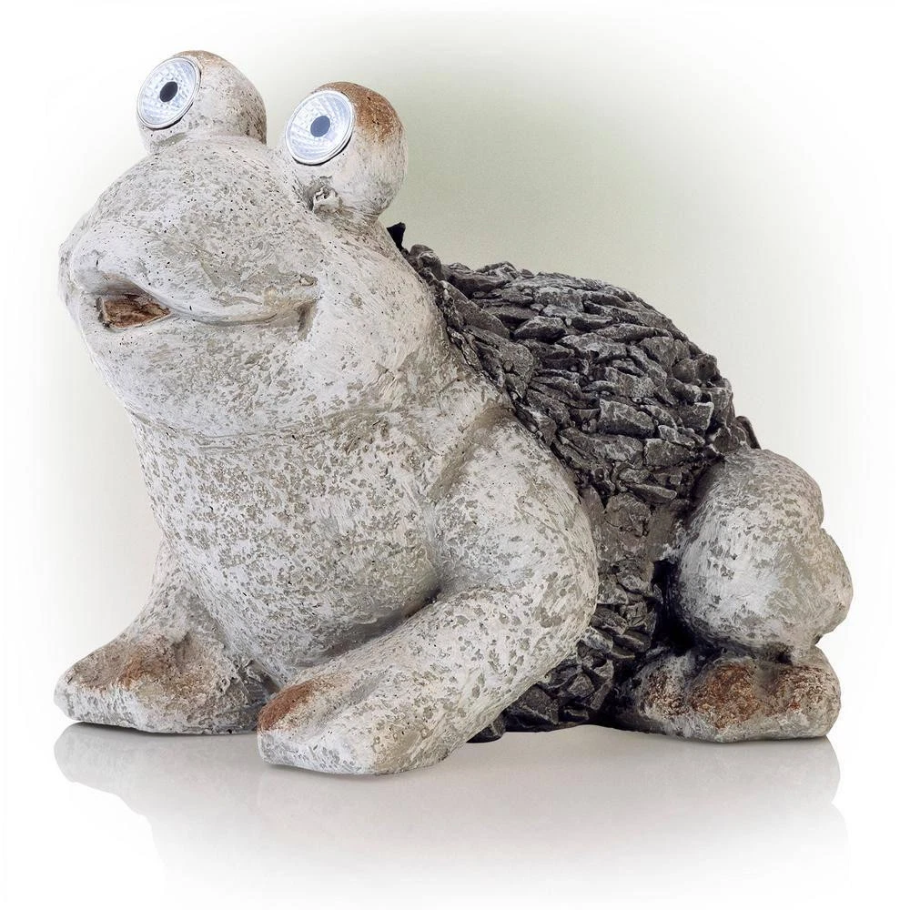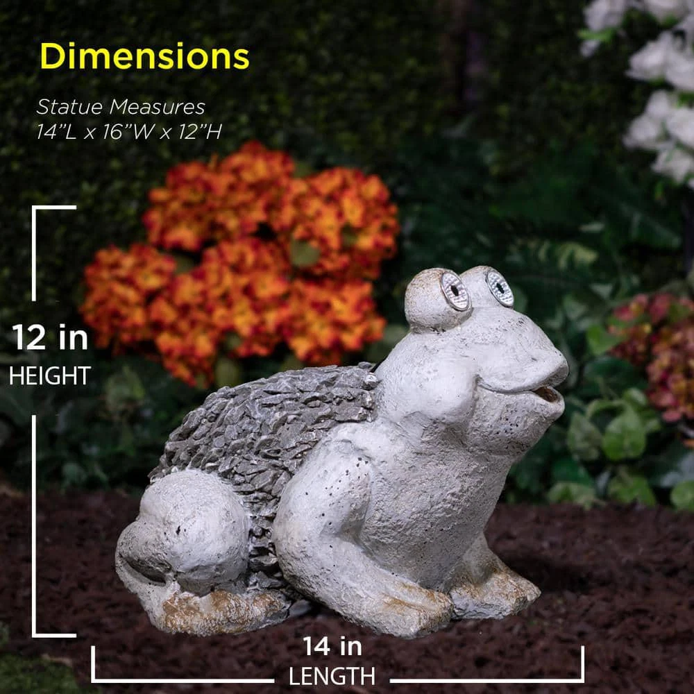 12 in. Tall Outdoor Solar Powered Frog Yard Statue with LED Lights, Gray Solar powered - set it in a sunny spot in your yard and enjoy Features LED lights for a lovely ambiance Durable and versatile for long-lasting enjoyment Welcome your house guests with the warm and inviting 12 in. Outdoor Solar Powered Frog Yard Statue with LED Lights from Alpine Corporation. This statue features an adorable happy frog that provides a unique and decorative addition to your home's exterior Decor. The lighted yard art is powered by solar energy to keep your outdoor yard statue lit up and features a pair of white LED lights located in the frog's eyes. Constructed from durable magnesia, the yard art is made tough for outdoor use and is weather-resistant for long-lasting, quality use on your porch, patio, or flowerbeds. Add one or multiple statues to create an enchanted garden display. The yard decor is perfect for display on pathways, entryways, decks, courtyards, and outdoor living spaces. The outdoor garden statue measures 14 in. L x 16 in. W x 12 in. H to fit almost any outdoor space and a 1-year manufacturer's warranty from date of purchase. Color Family: Gray Garden Décor Features: Lighted Included Parts: LED Light(s) Indoor/Outdoor: Outdoor Material: Plastic Mounting Type: Free standing Outdoor Compatibility: Weather Resistance Primary Power Source: Solar Product Weight (lb.): 8.57 lb Returnable: 90-Day Style: Coastal Manufacturer Warranty: 1 Year Limited Warranty Product Depth (in.): 14 in Product Height (in.): 12 in Product Width (in.): 16 in