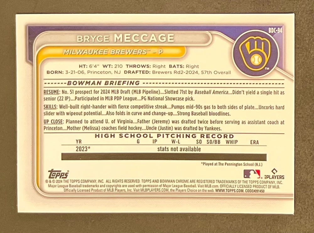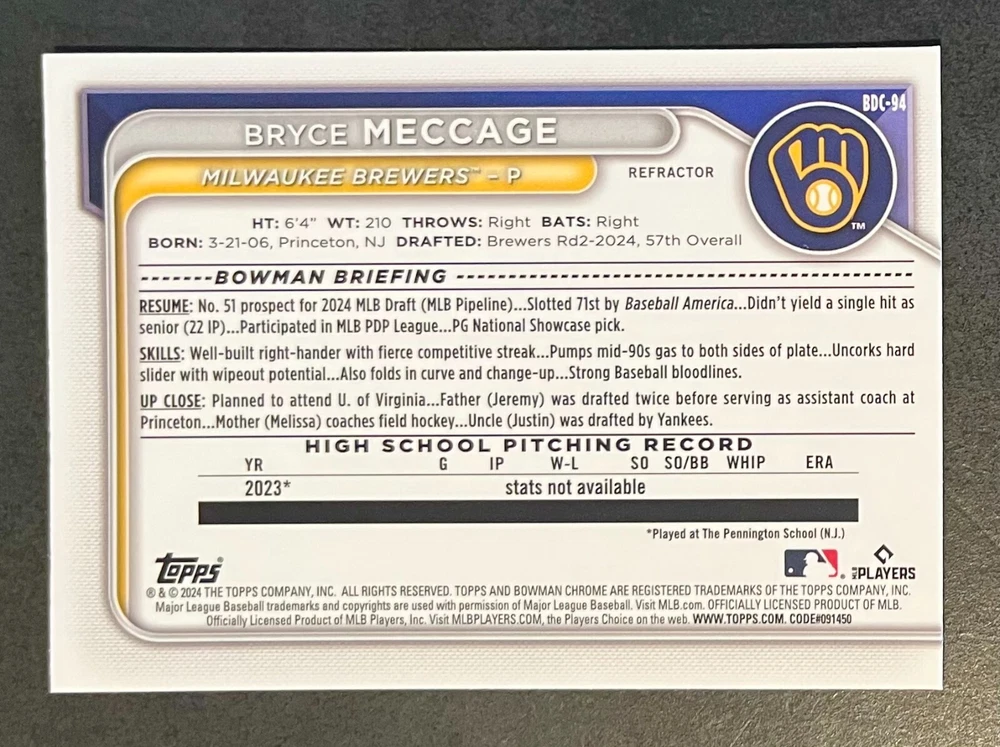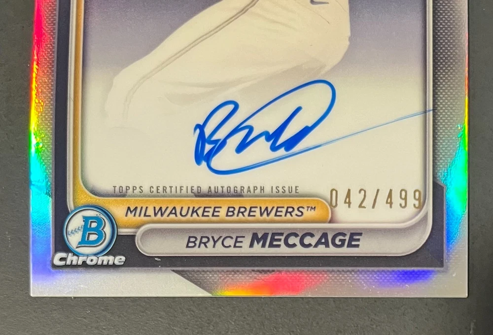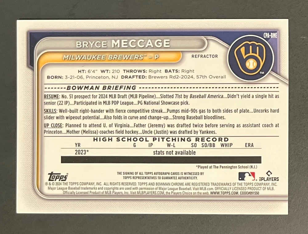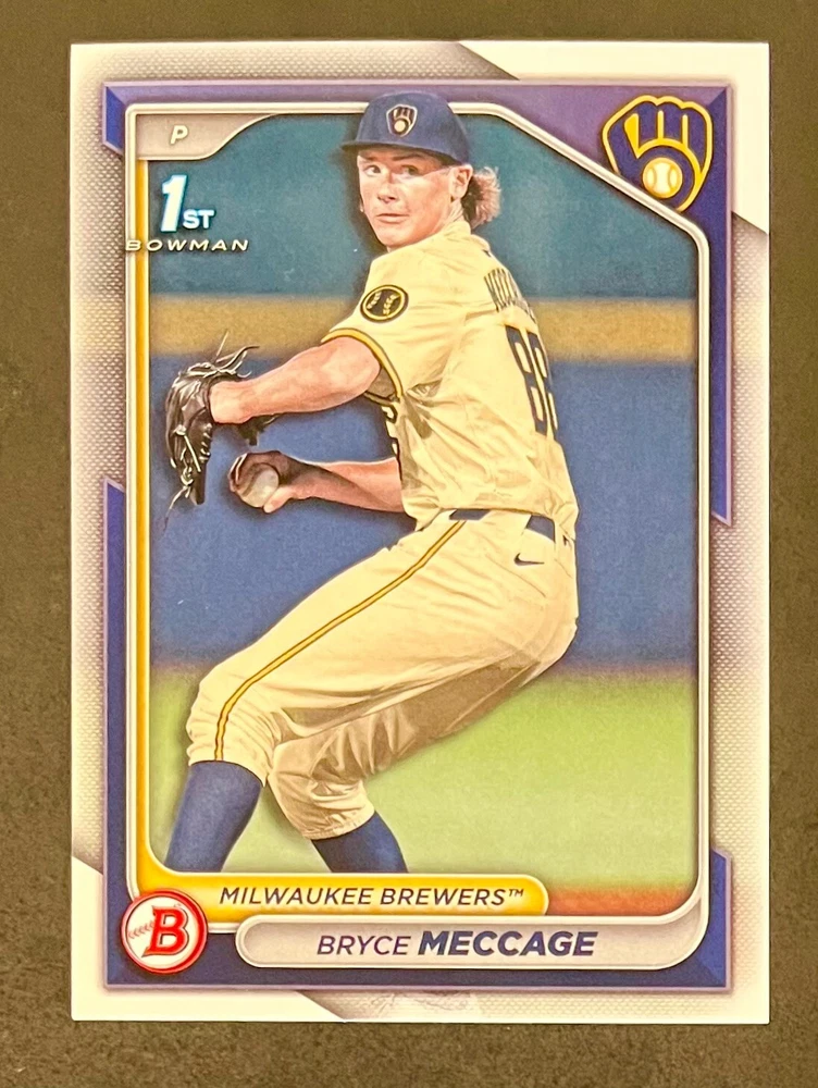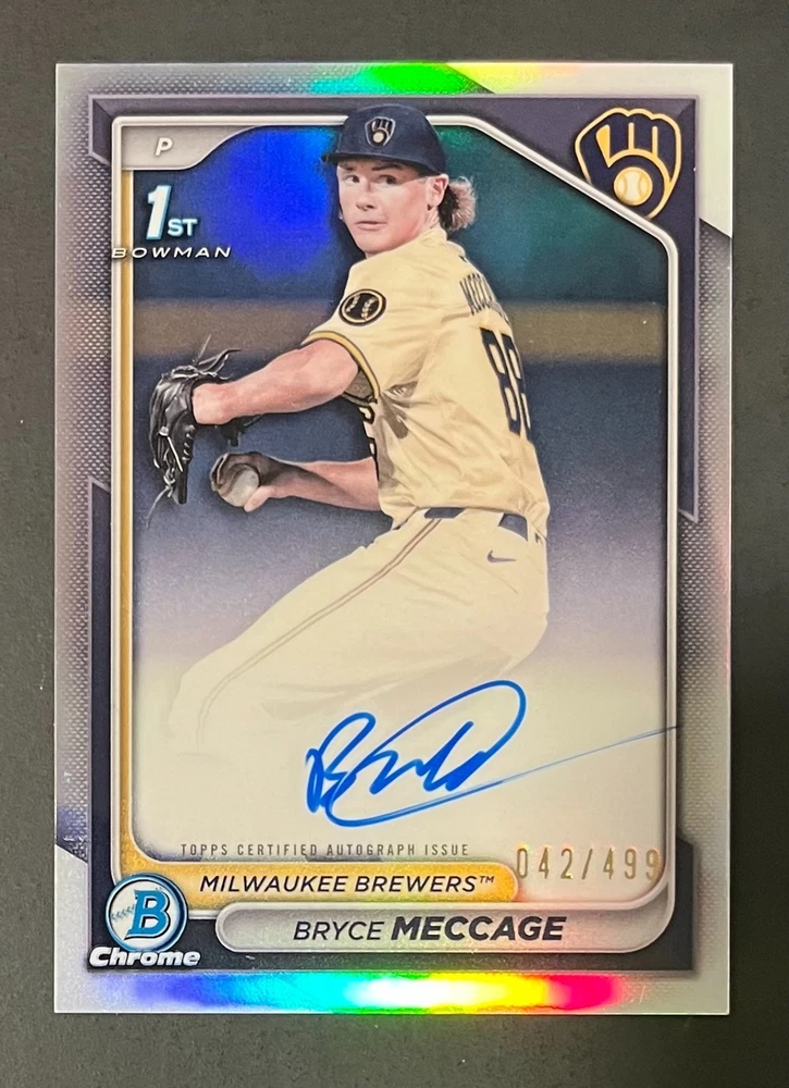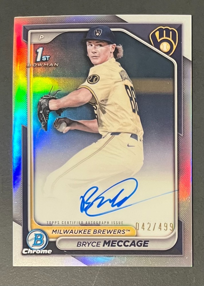 Low-cost shipping. Discounts if you buy more. **The Meccage /499 Autograph has some minor surface issues (see pics). 2024 Bowman Draft Pick your favorite Milwaukee Brewers draft picks and prospects (see https://www.mlb.com/prospects/brewers for more on each player) I have other teams listed as well.