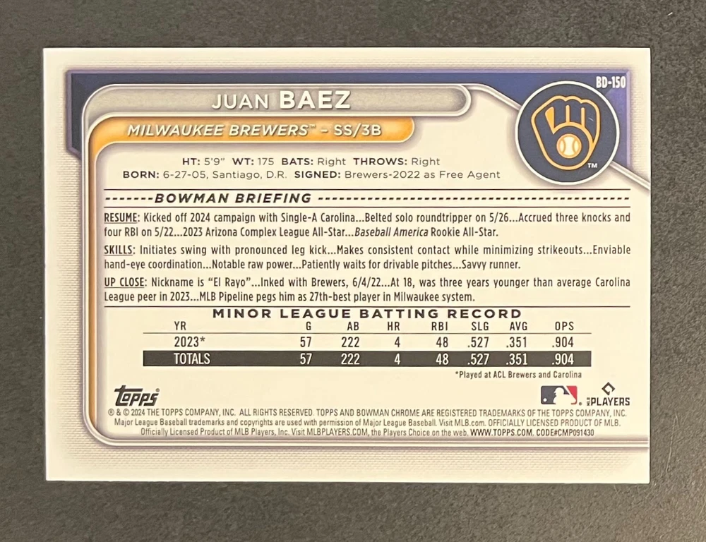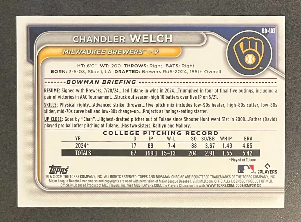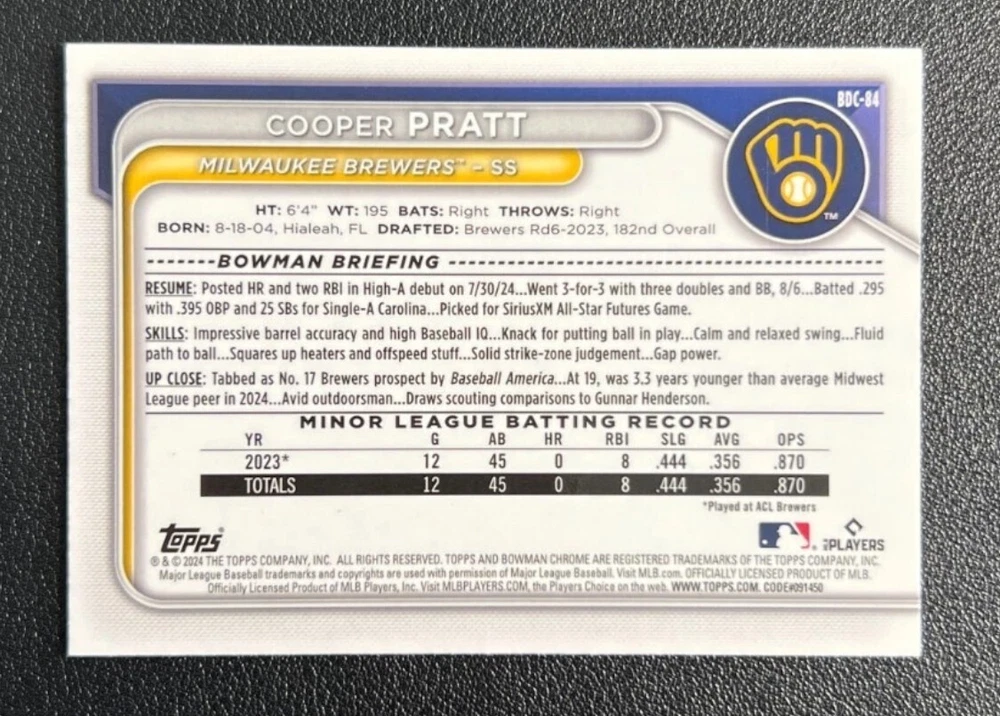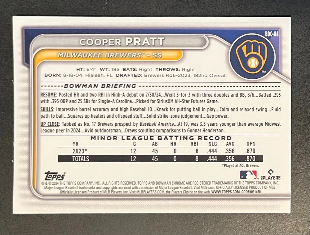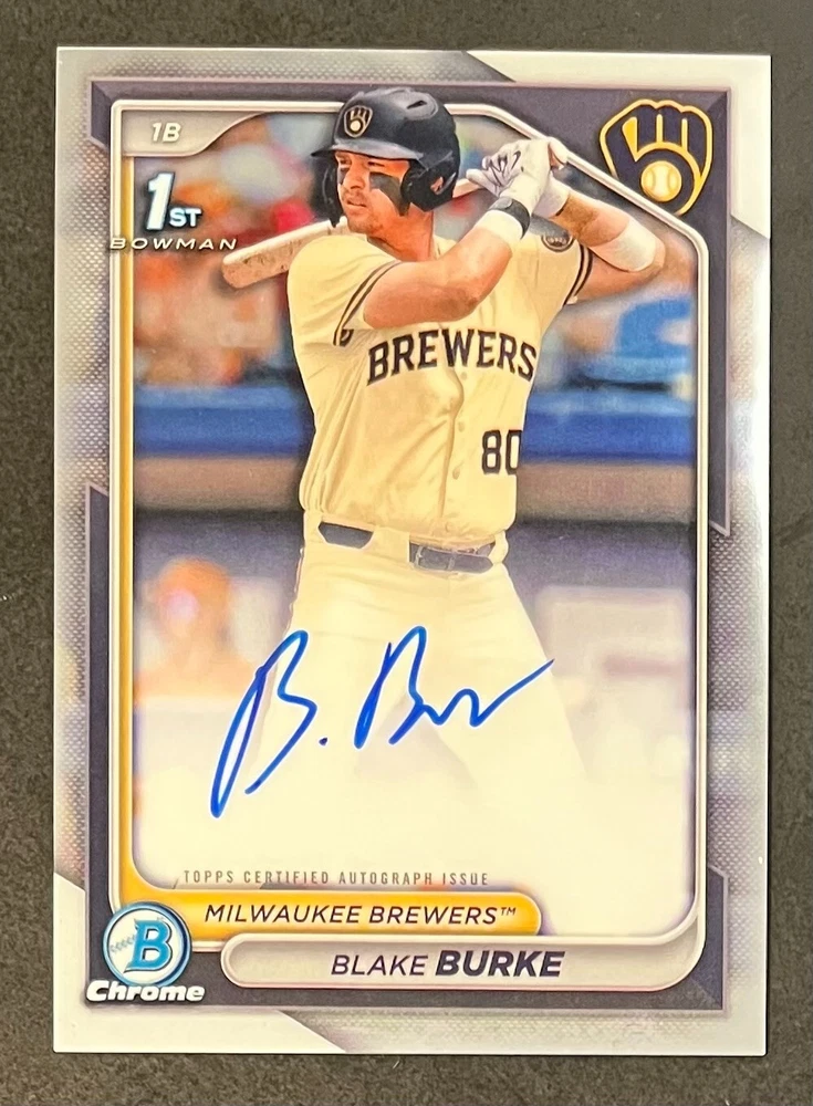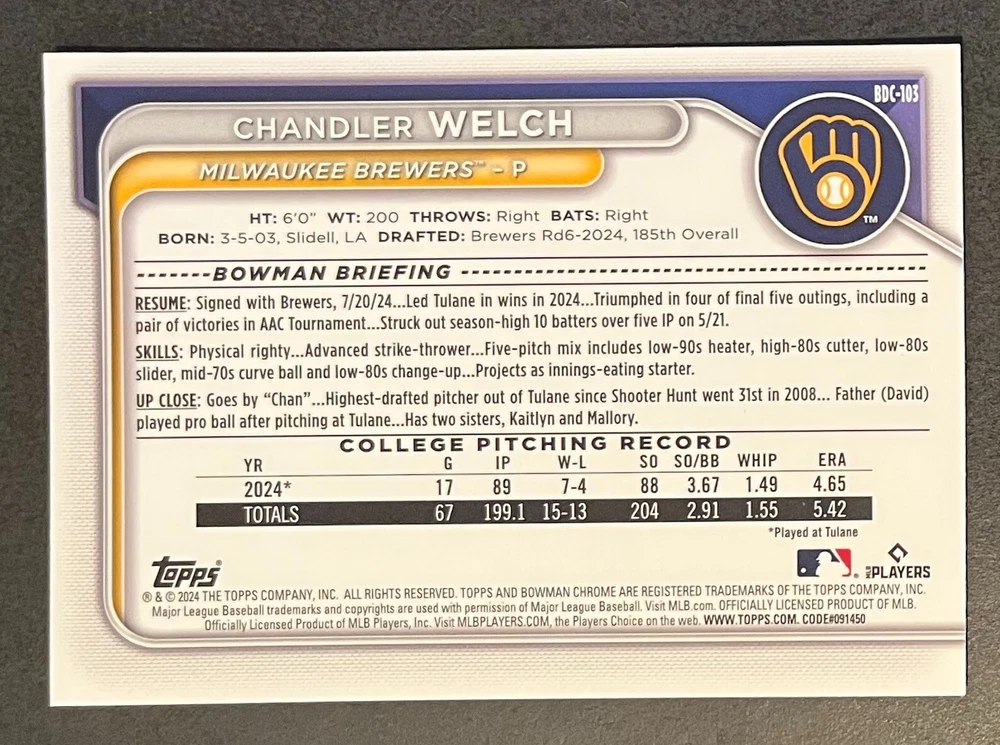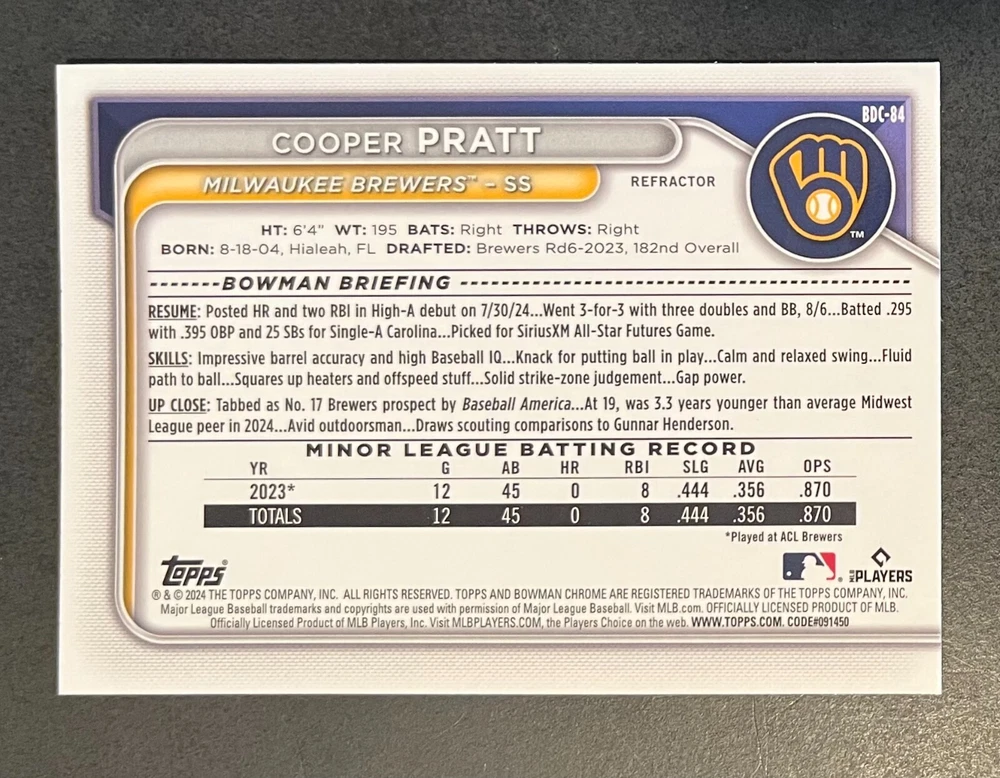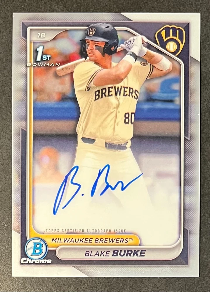 Low-cost shipping. Discounts if you buy more. **The Meccage /499 Autograph has some minor surface issues (see pics). 2024 Bowman Draft Pick your favorite Milwaukee Brewers draft picks and prospects (see https://www.mlb.com/prospects/brewers for more on each player) I have other teams listed as well.