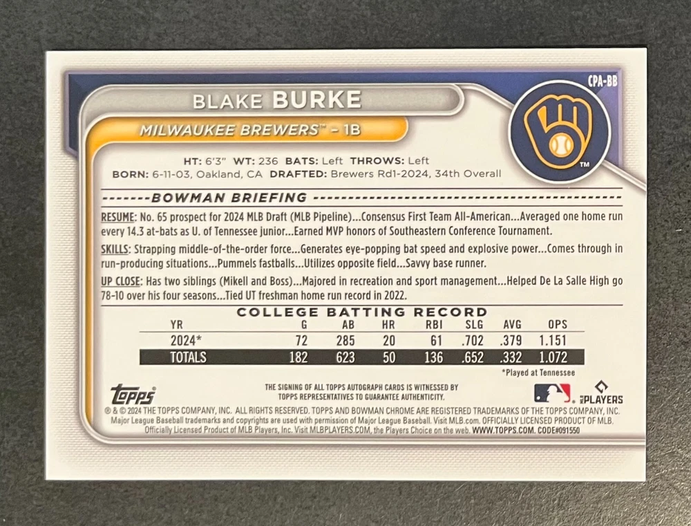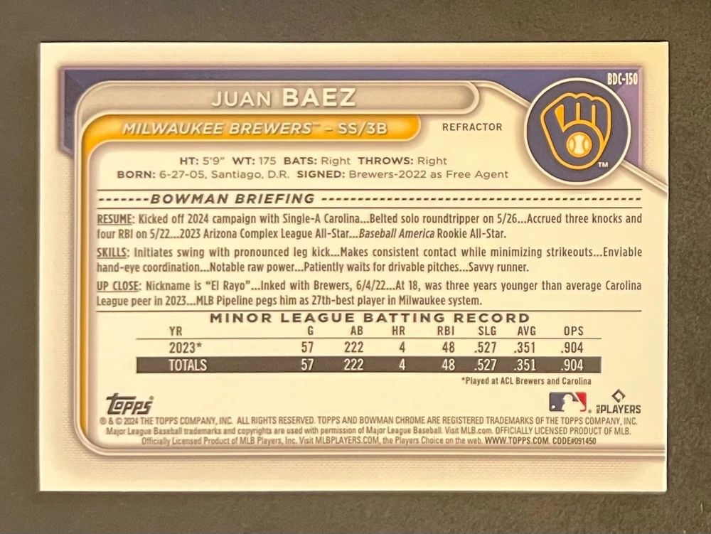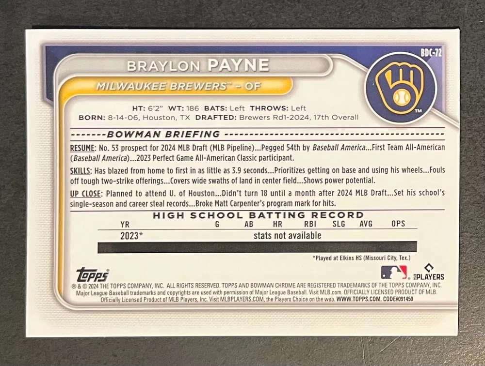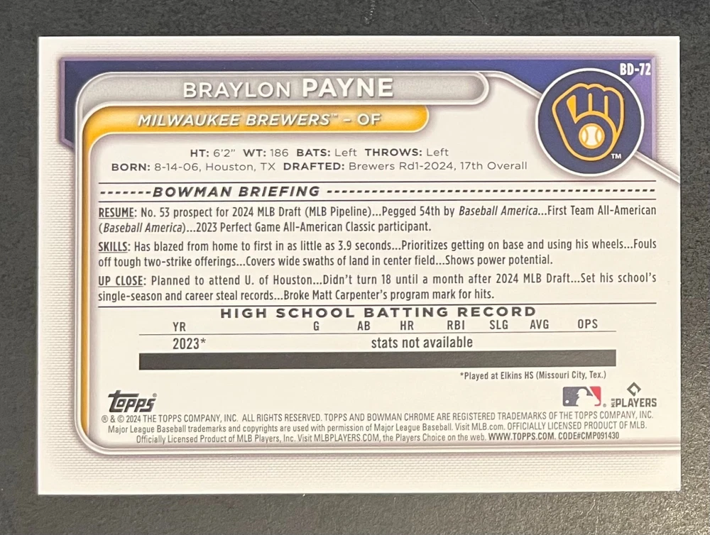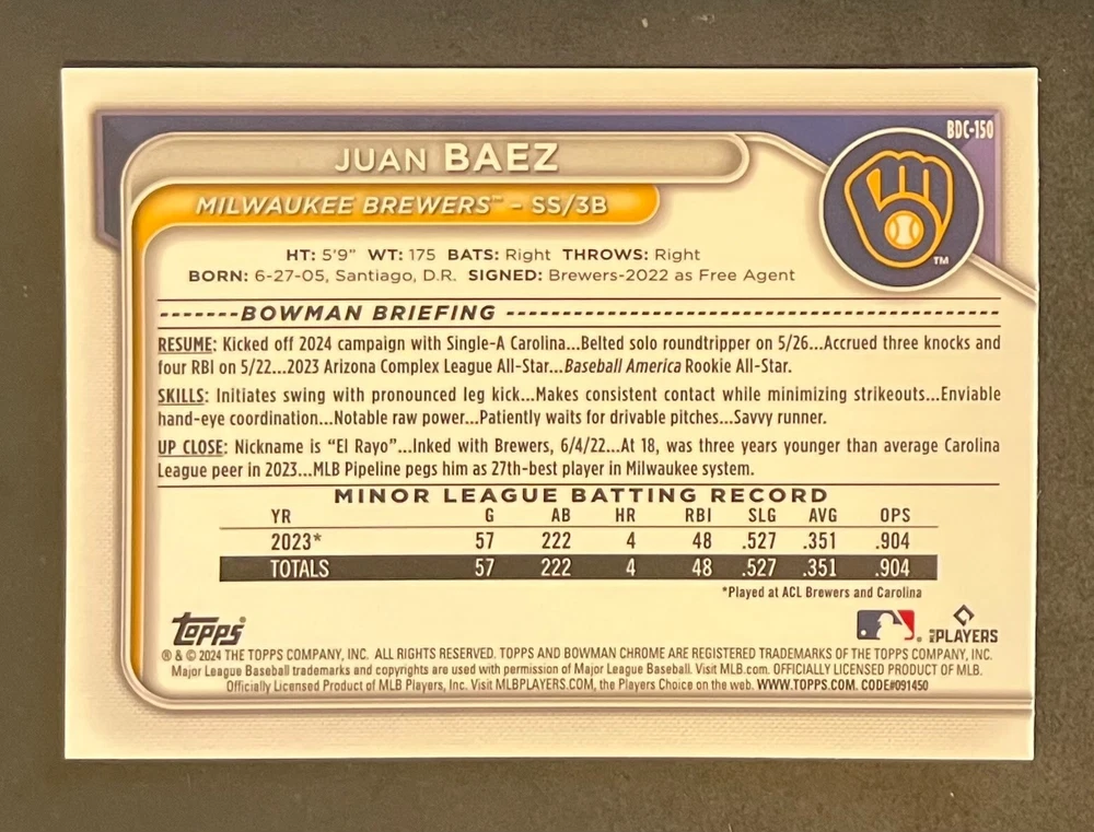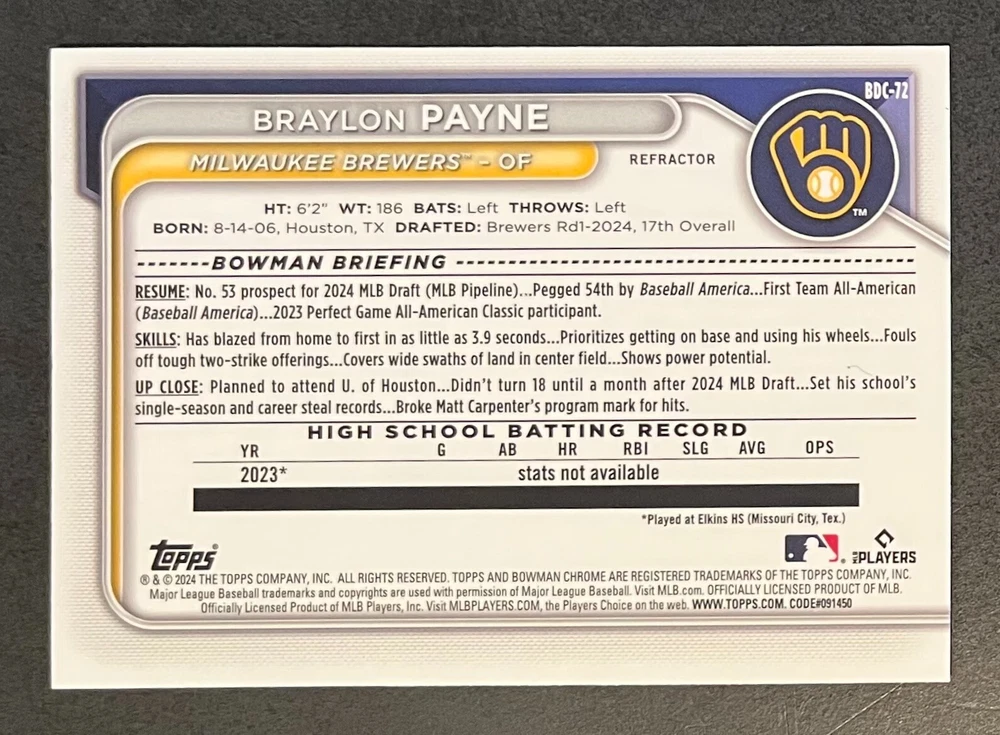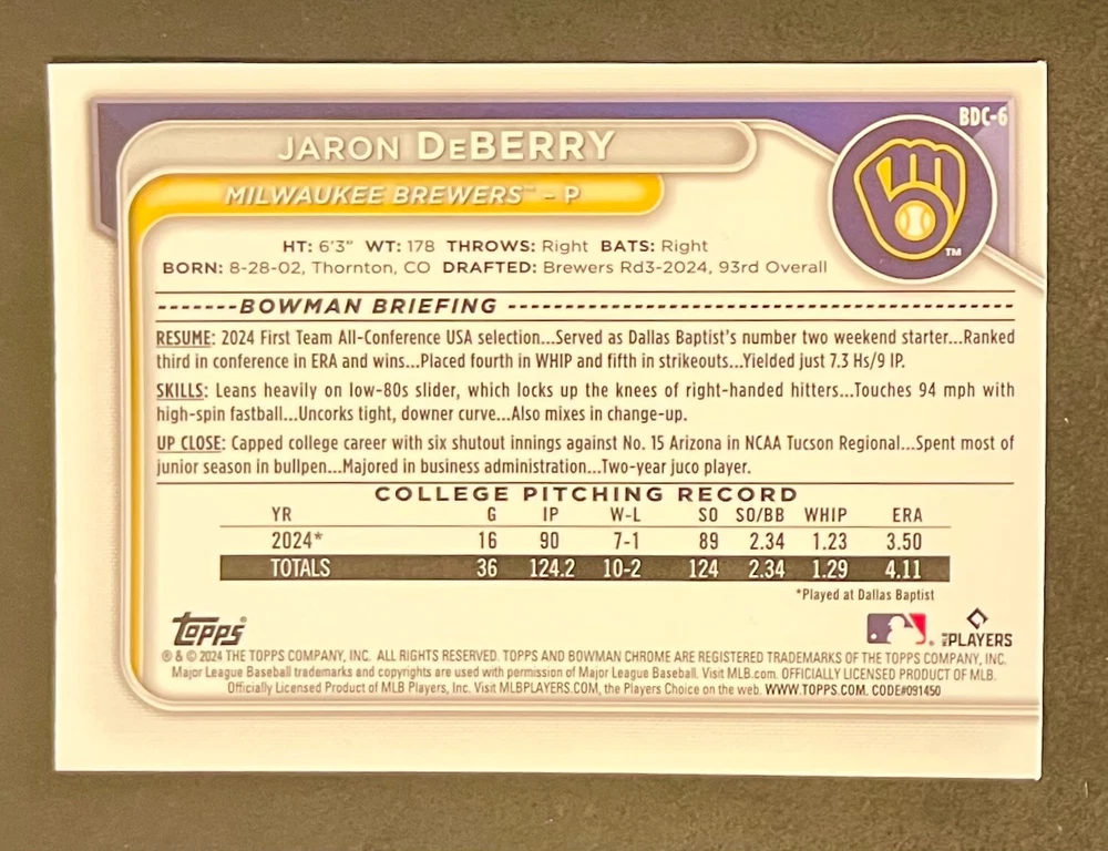 Low-cost shipping. Discounts if you buy more. **The Meccage /499 Autograph has some minor surface issues (see pics). 2024 Bowman Draft Pick your favorite Milwaukee Brewers draft picks and prospects (see https://www.mlb.com/prospects/brewers for more on each player) I have other teams listed as well.