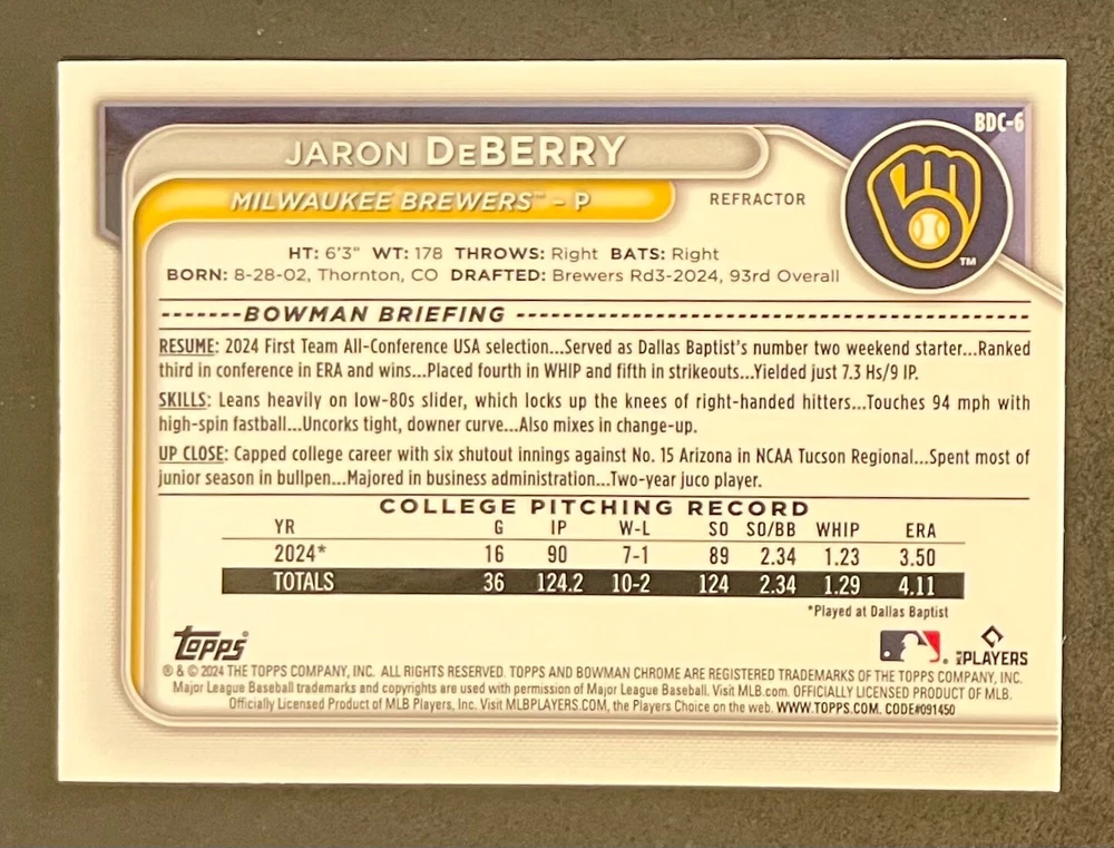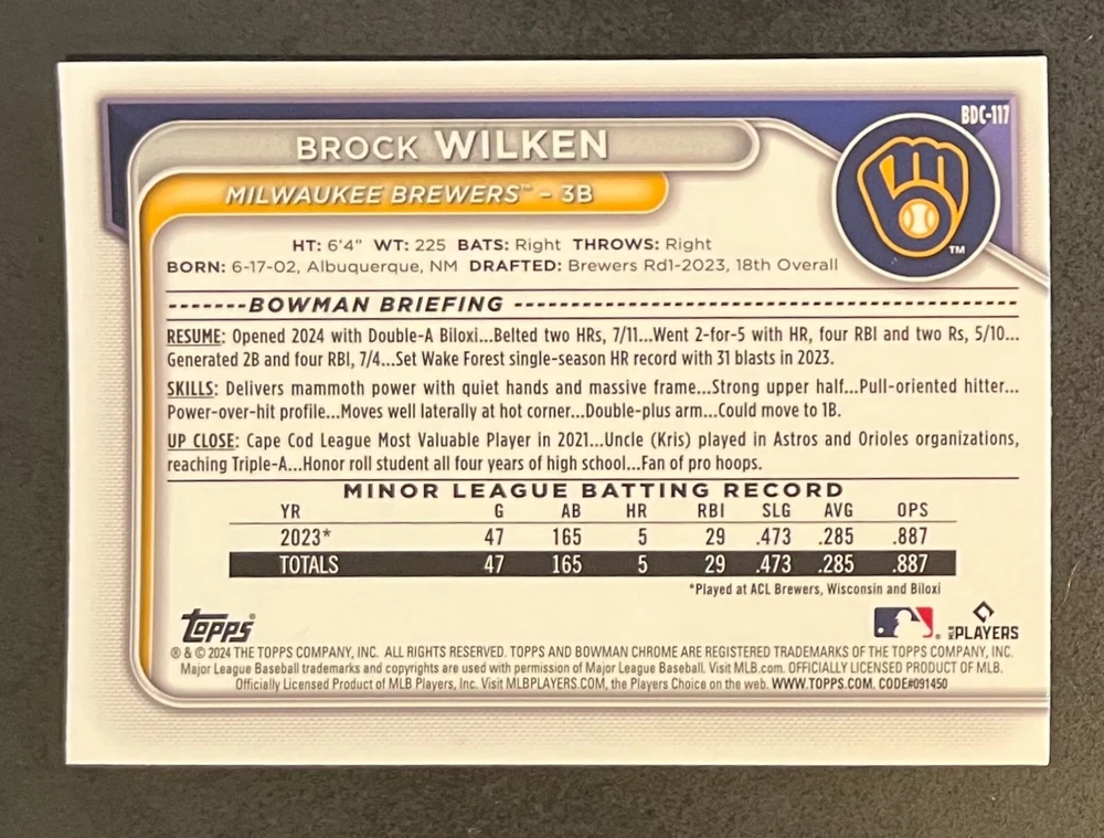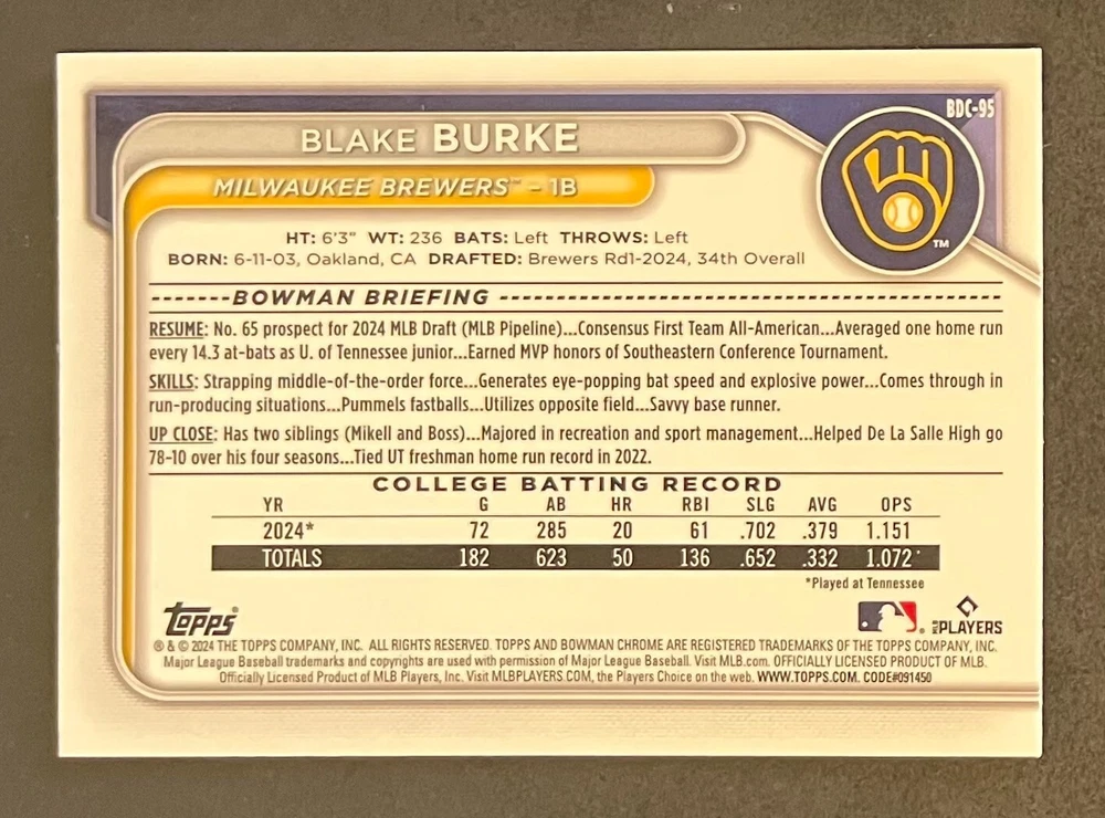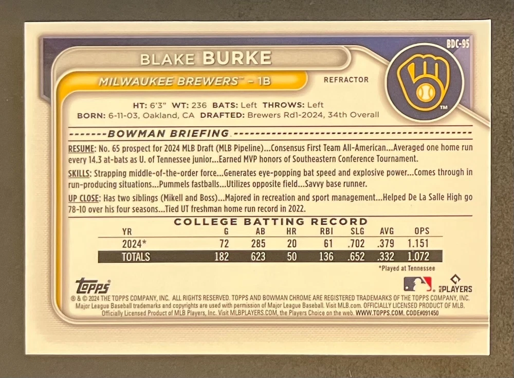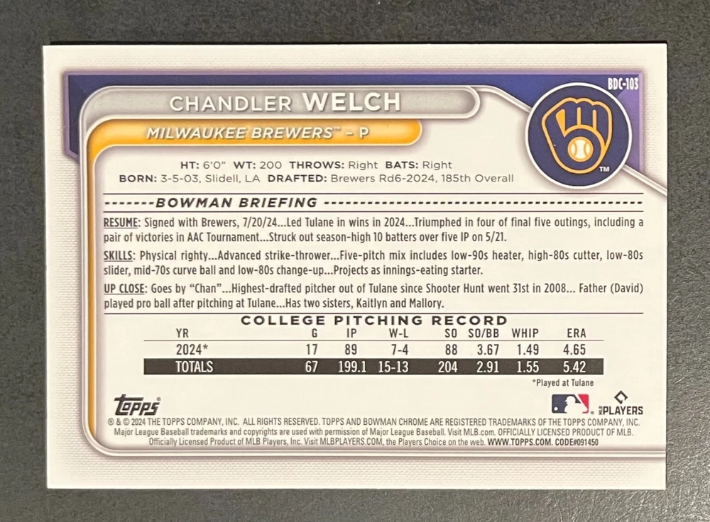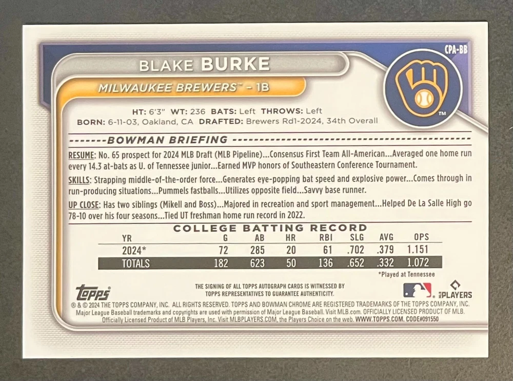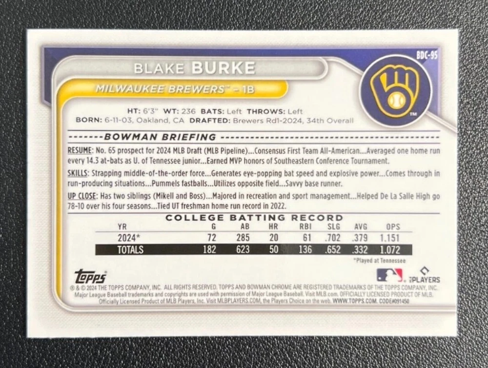 Low-cost shipping. Discounts if you buy more. **The Meccage /499 Autograph has some minor surface issues (see pics). 2024 Bowman Draft Pick your favorite Milwaukee Brewers draft picks and prospects (see https://www.mlb.com/prospects/brewers for more on each player) I have other teams listed as well.