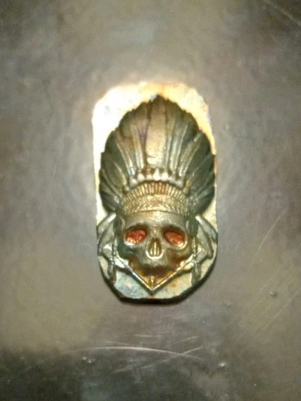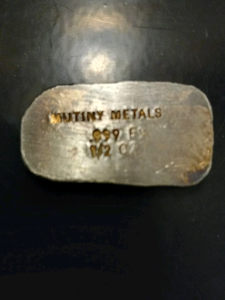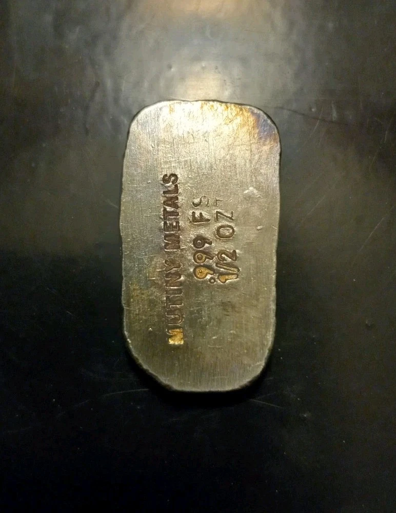 The product is a 1/2 oz hand-poured silver bar from Mutiny Metals, with a fineness of 0.999. The bar features a unique warrior toned design, adding character to the silver bullion piece. The bar is crafted with high-quality silver, making it a valuable addition to any precious metal collection.