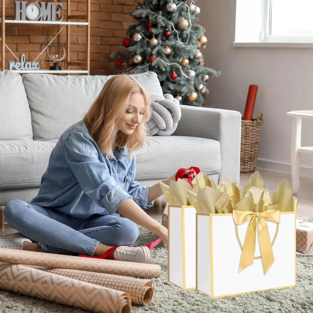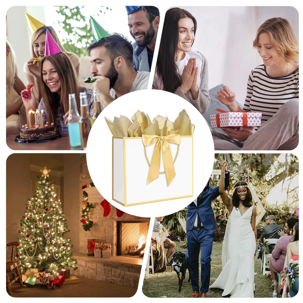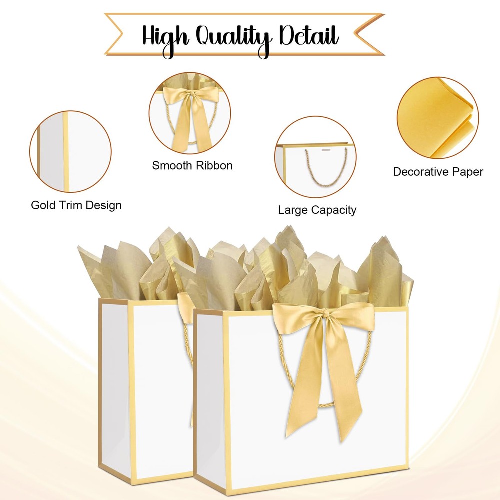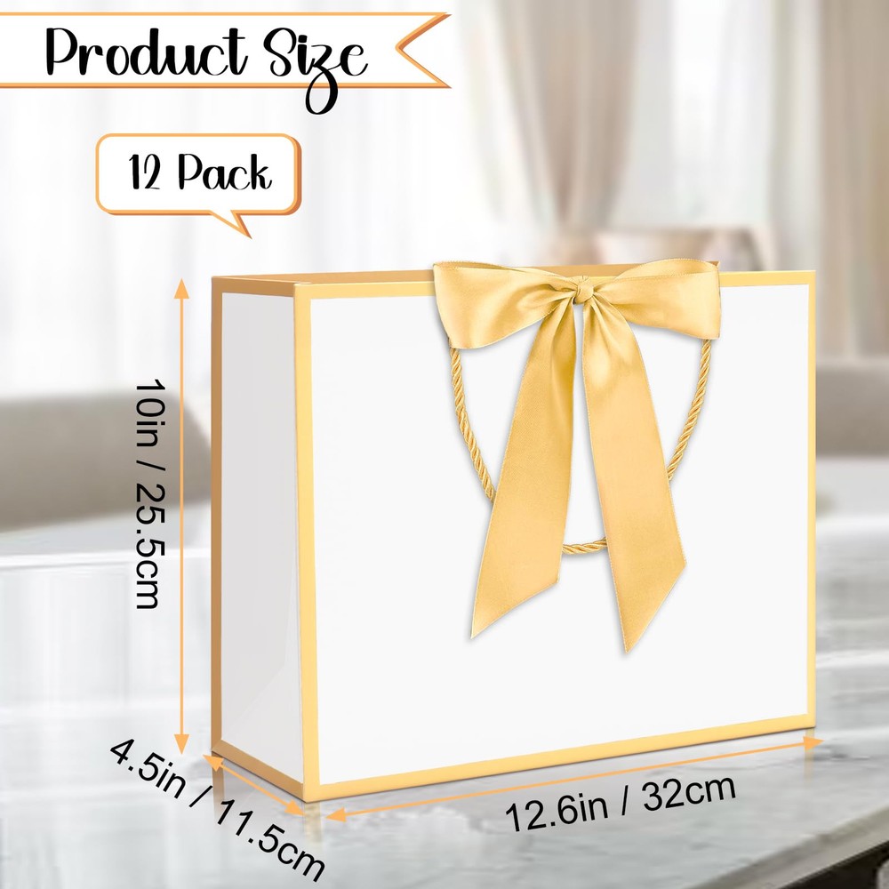 Large Size: Kraft paper bags with handles measure 12.6"L x 4.5"W x 10"H, reusable and recyclable. The present bags can be widely used for in hotel, shops , boutique, party and other places Simple and Elegant Design: The gift bags with handles is designed with golden trims and bow ribbon to make your gift look more elegant and fashionable, making your gift more memorable to the recipient Rope Handle & Tissue Paper: The exquisite rope handle is stronger than ordinary paper handles, and it is more comfortable to use. Each bag is matched with two gold tissue papers. It will makes the gift look more upscale and texture Thickened Gift Paper Bag: Thanks to the big paper bag is made of 300 g thick kraft paper material, the bottom is reinforced and flat, sturdy, and not easy to tear. Our kraft paper bags can bear heavier weight Variant Occasions: These paper gift bags can be used as birthday party bags, bachelorette party bags, wedding bags, baby shower bags, thank you gift bags, anniversary party bags, Mother's Day and other holiday gift bags, party favor bags