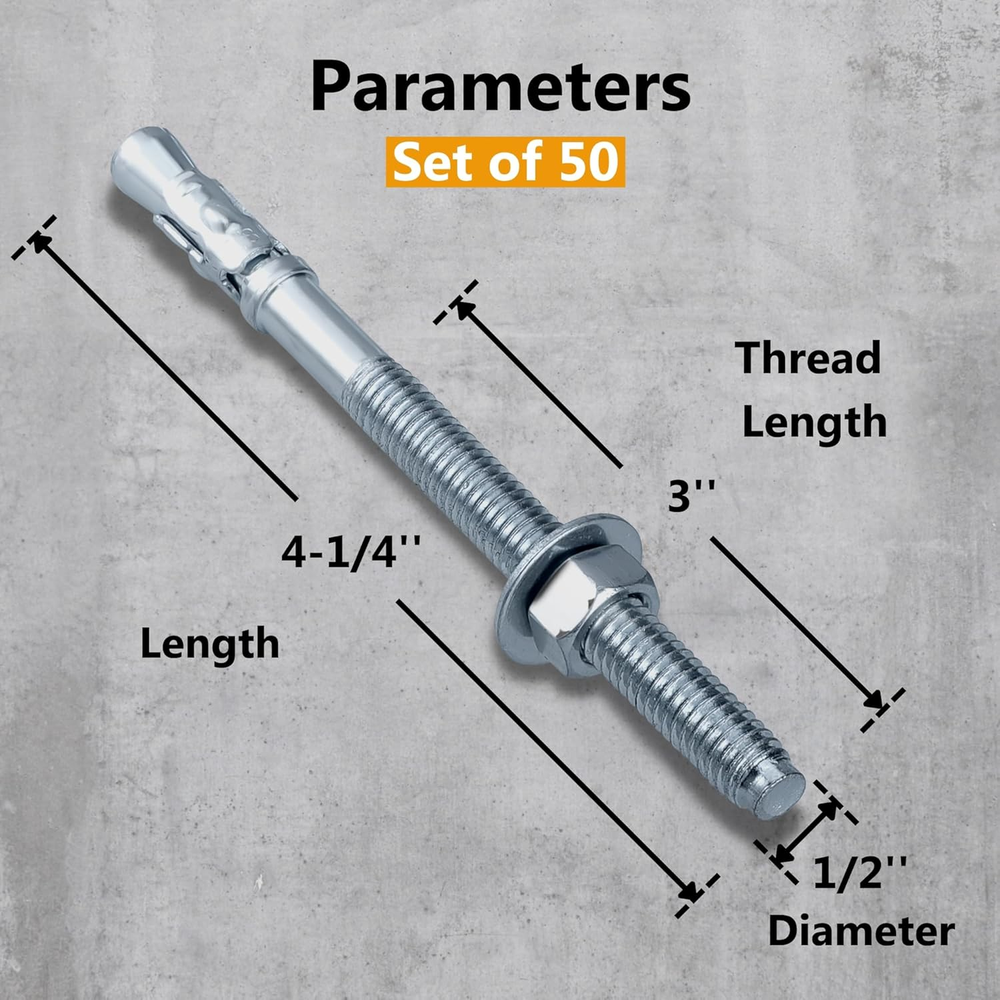 1/2 x 4-1/4 Inch Zinc Wedge Anchor Bolts 50 Pcs Heavy Duty Ceiling Mounting Hardware